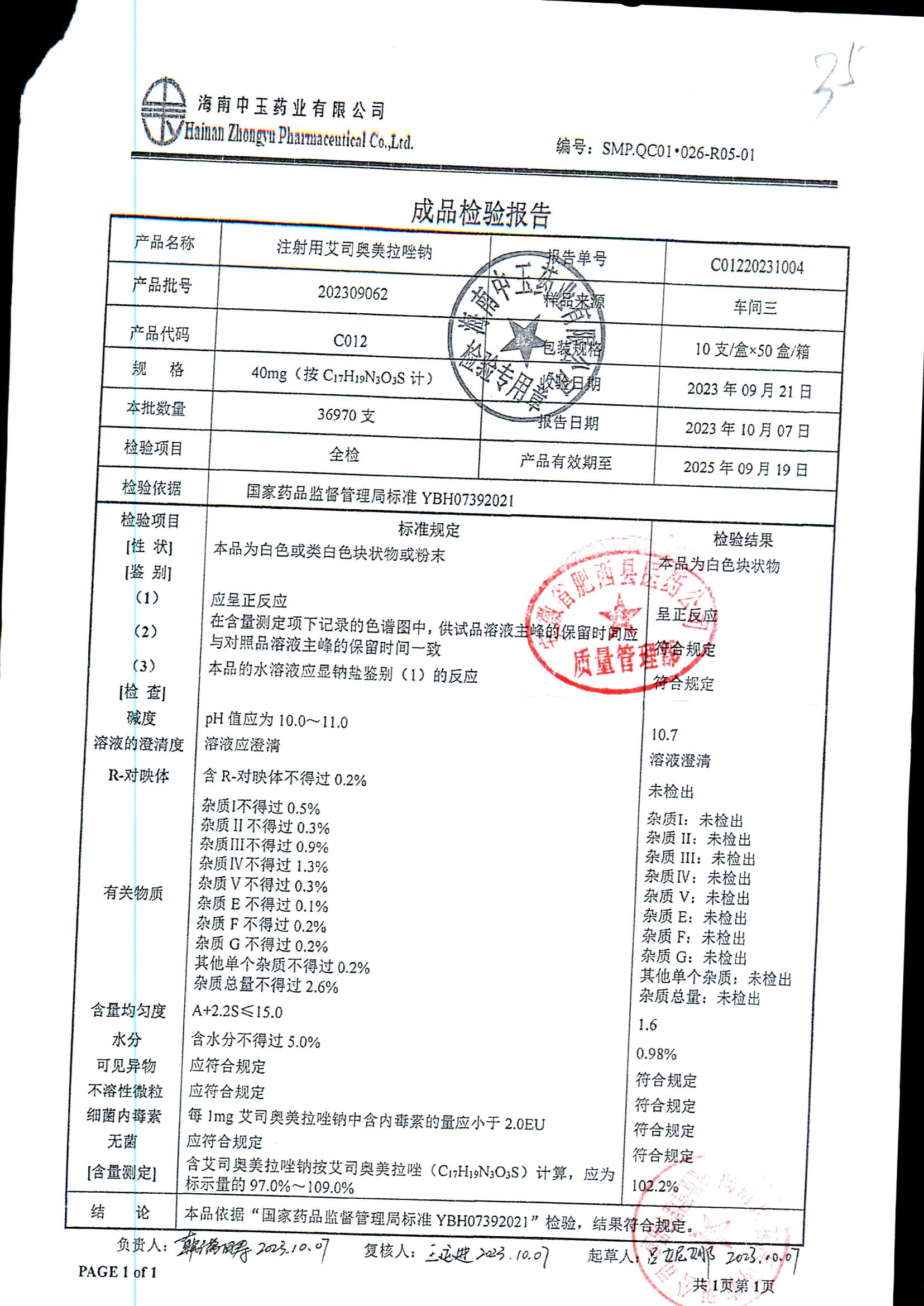 名称 | 规格 | 批号 | 药检报告 |