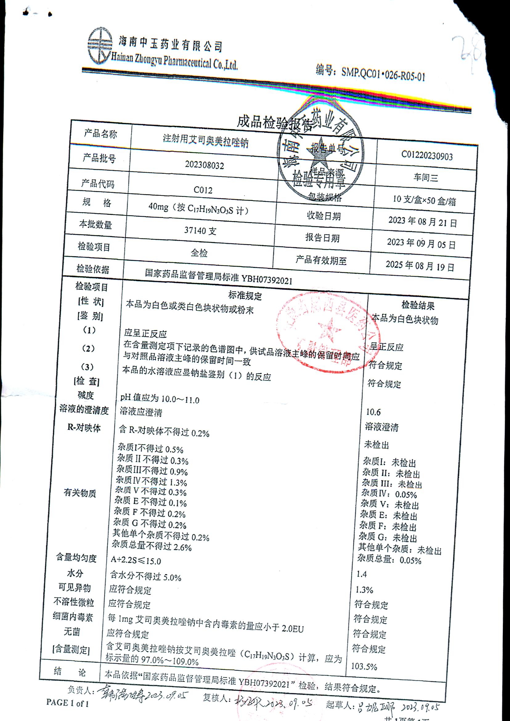 注射用艾司奥美拉唑钠 | 40mgx10支 | 202308032 | 查看详情 |
