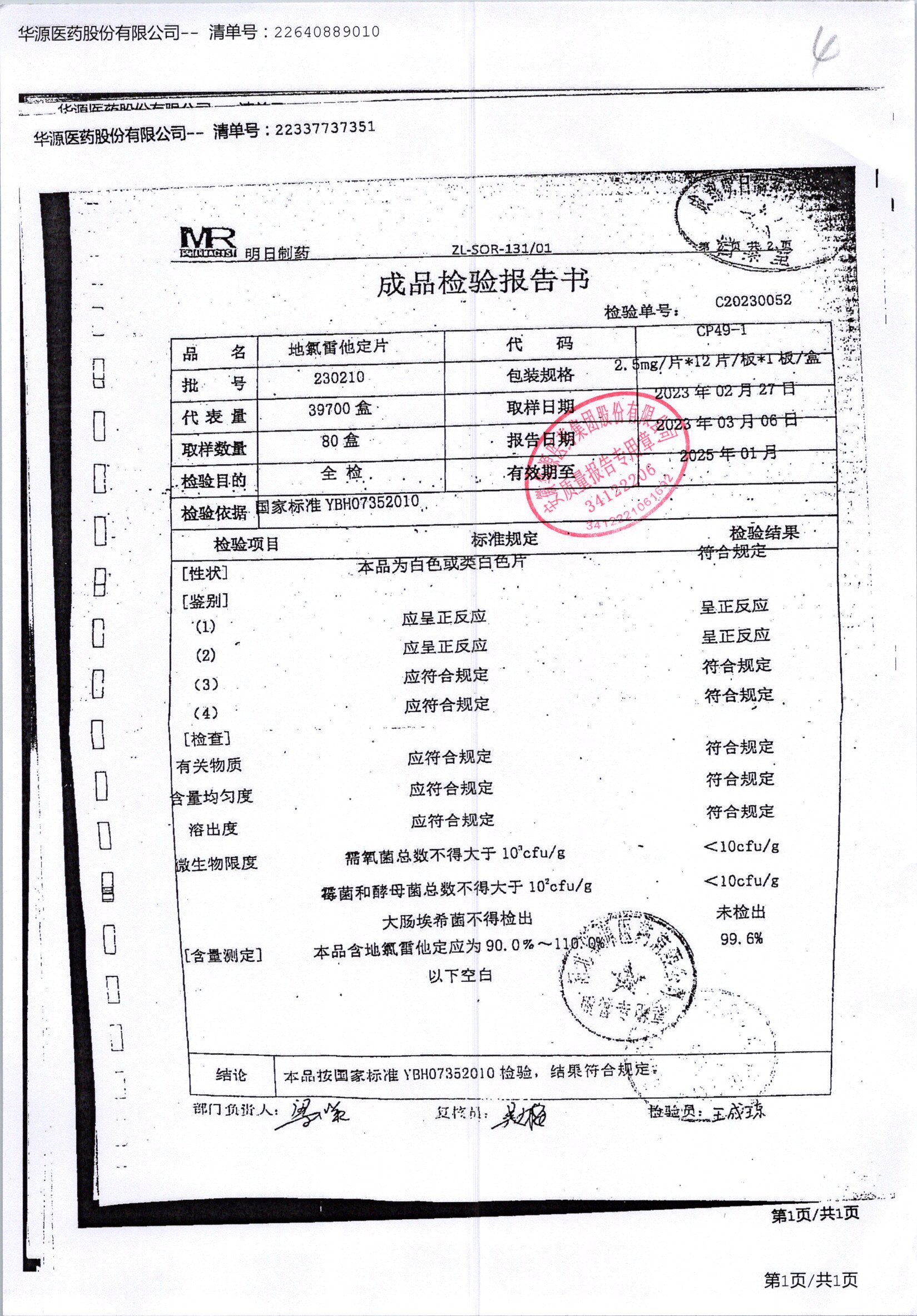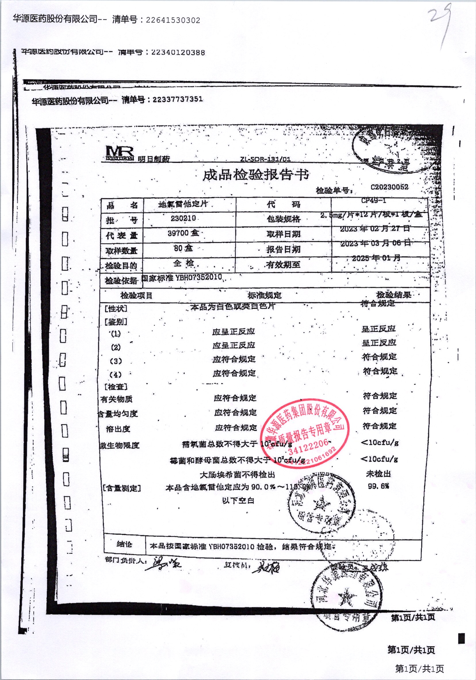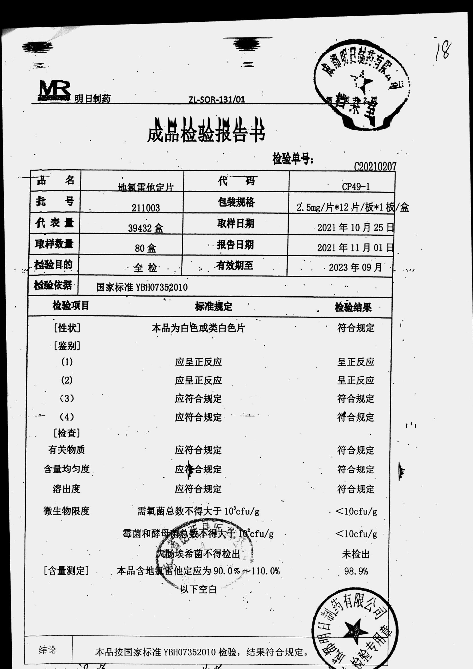 名称 | 规格 | 批号 | 药检报告 |