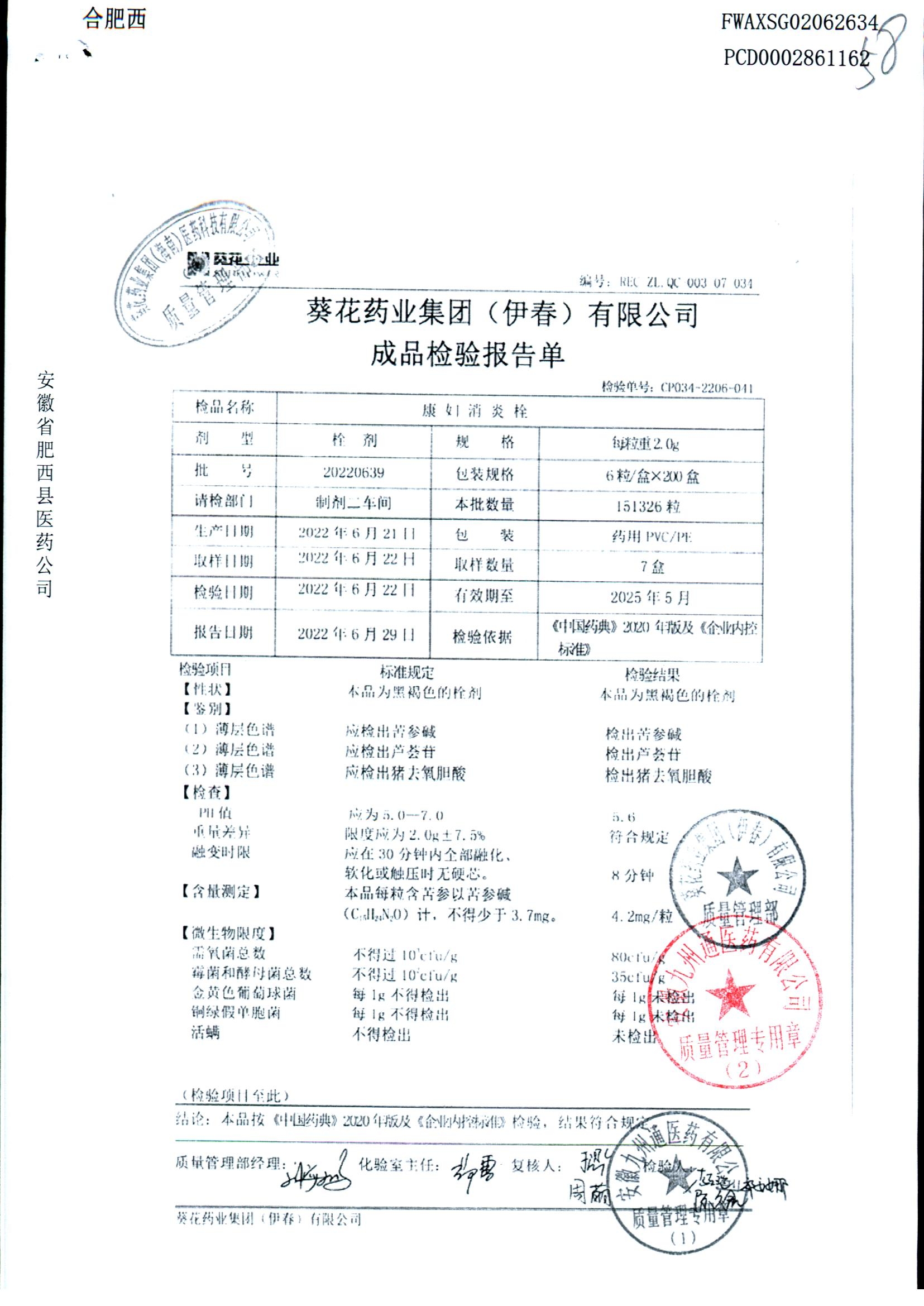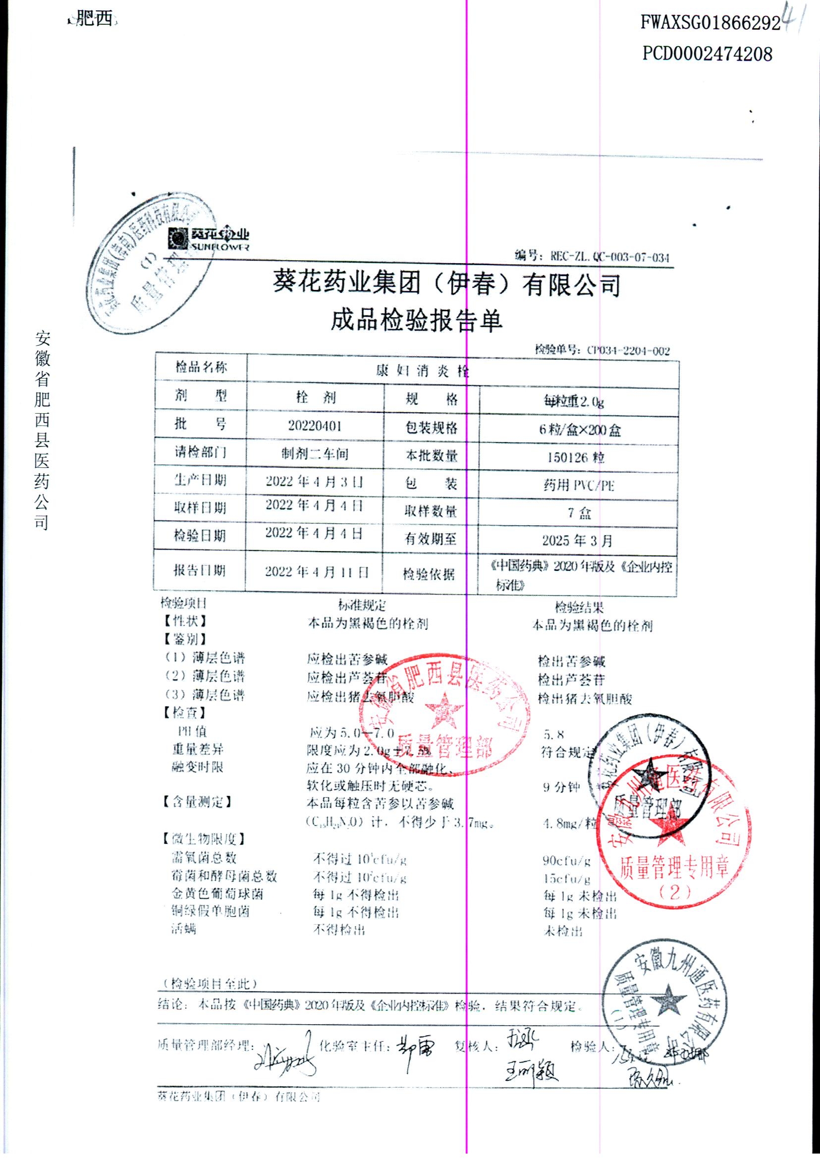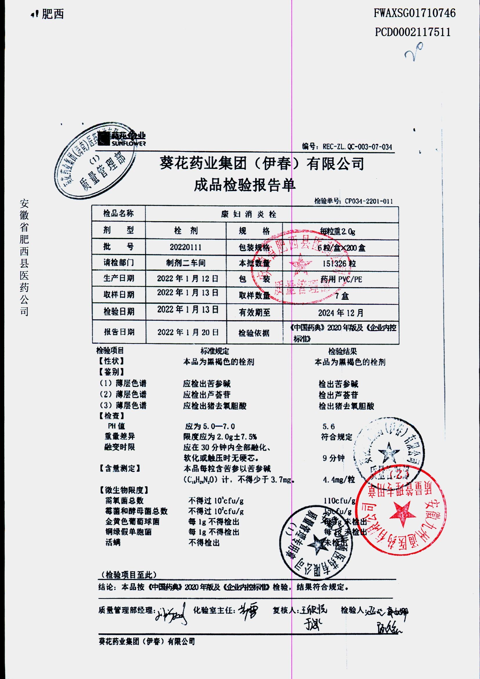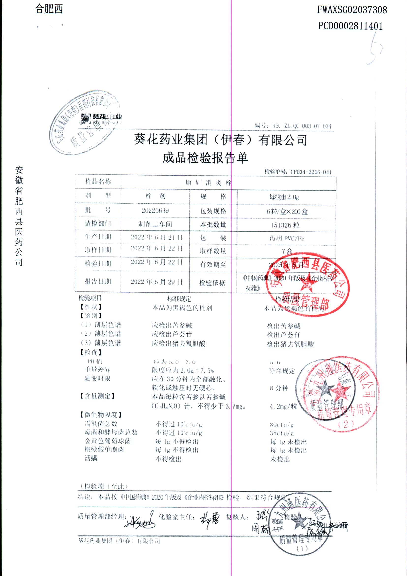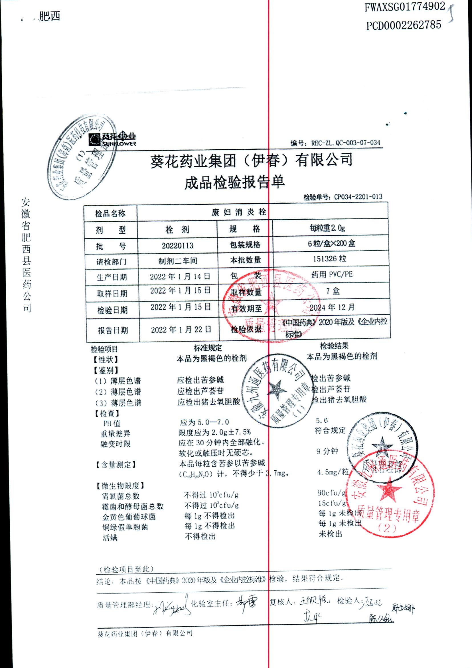康妇消炎栓 | 2.0g*6粒 | 20220111 | 查看详情 |