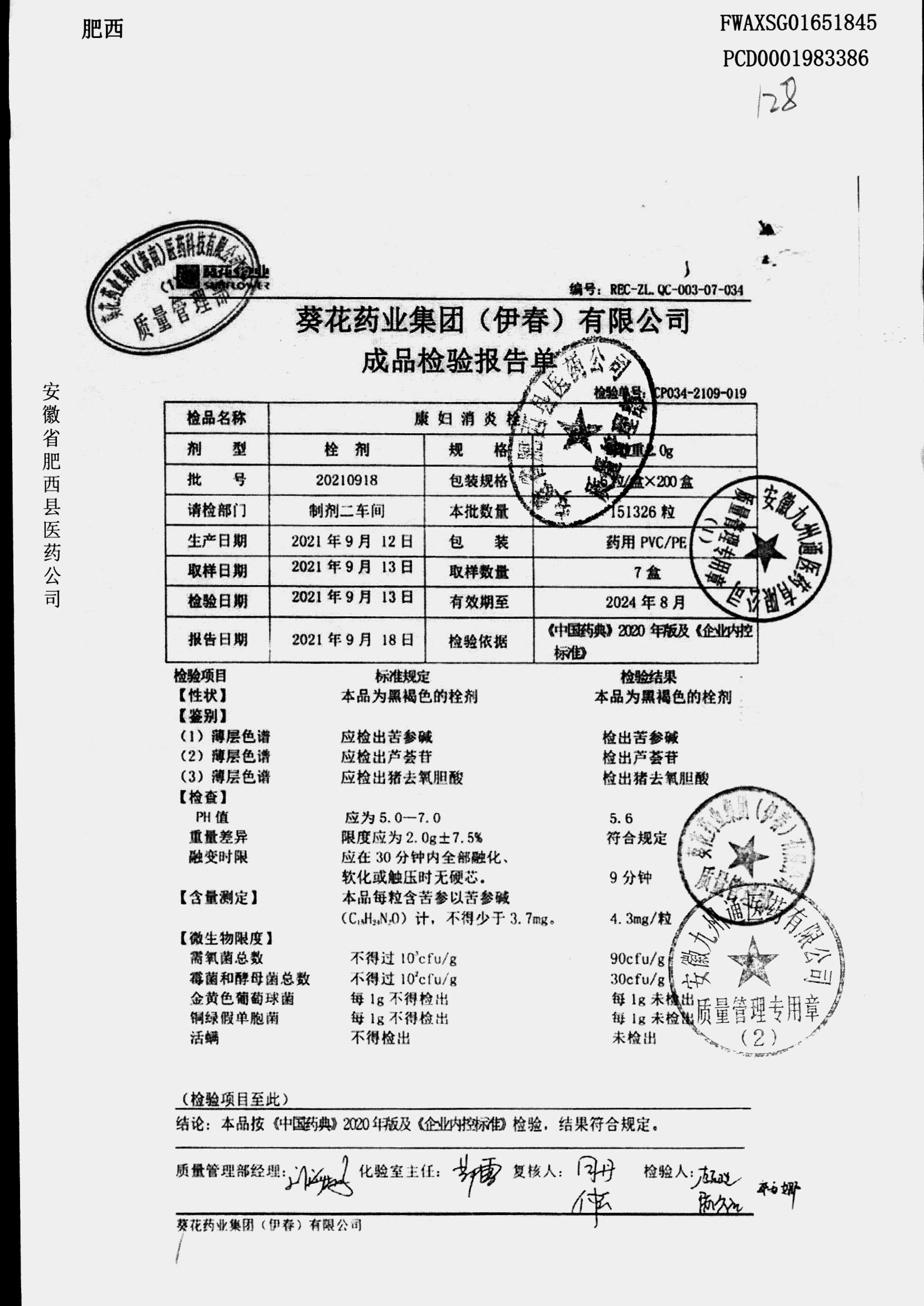康妇消炎栓 | 2.0g*6粒 | 20210917 | 查看详情 |