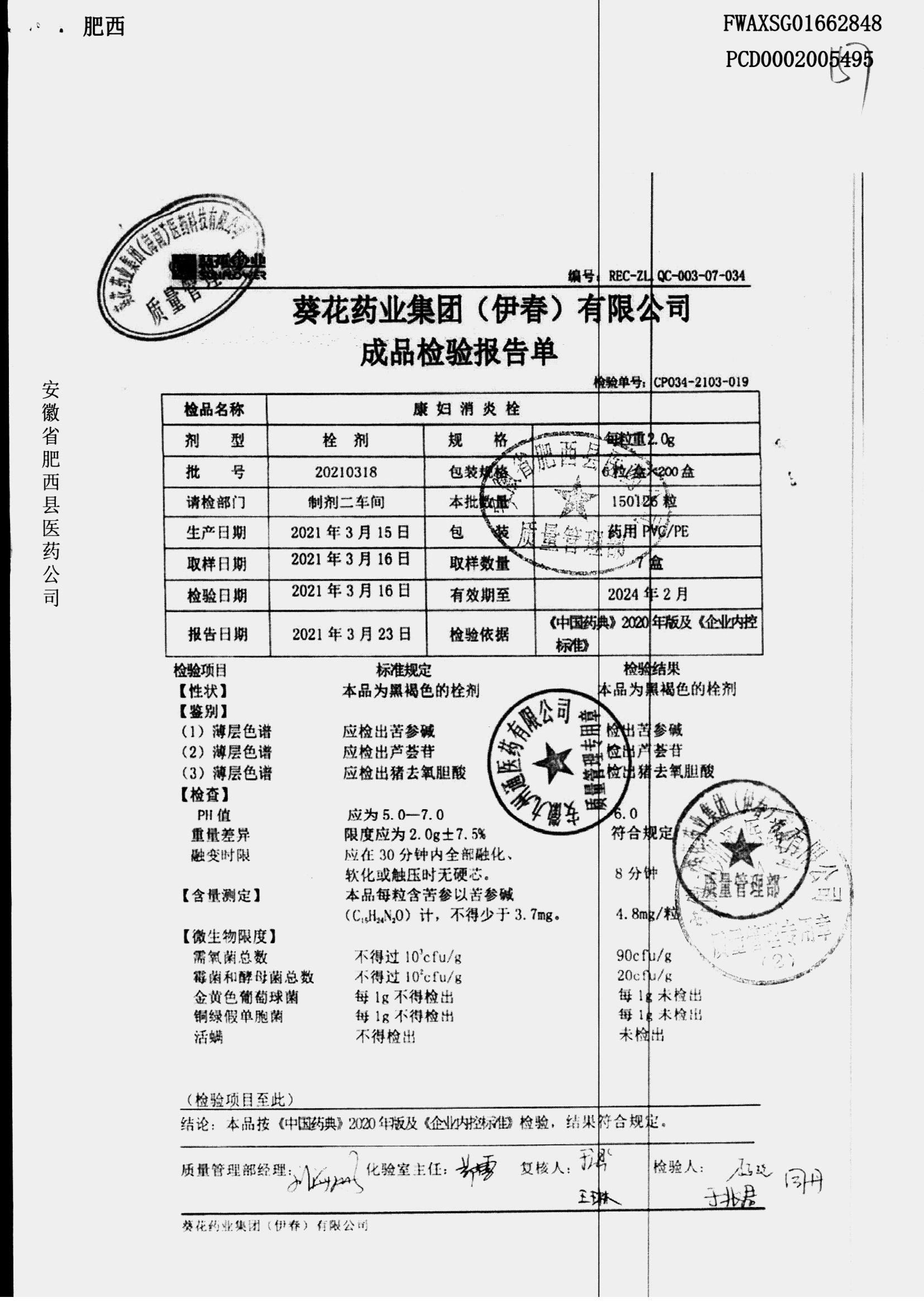 康妇消炎栓 | 2.0g*6粒 | 20210318 | 查看详情 |