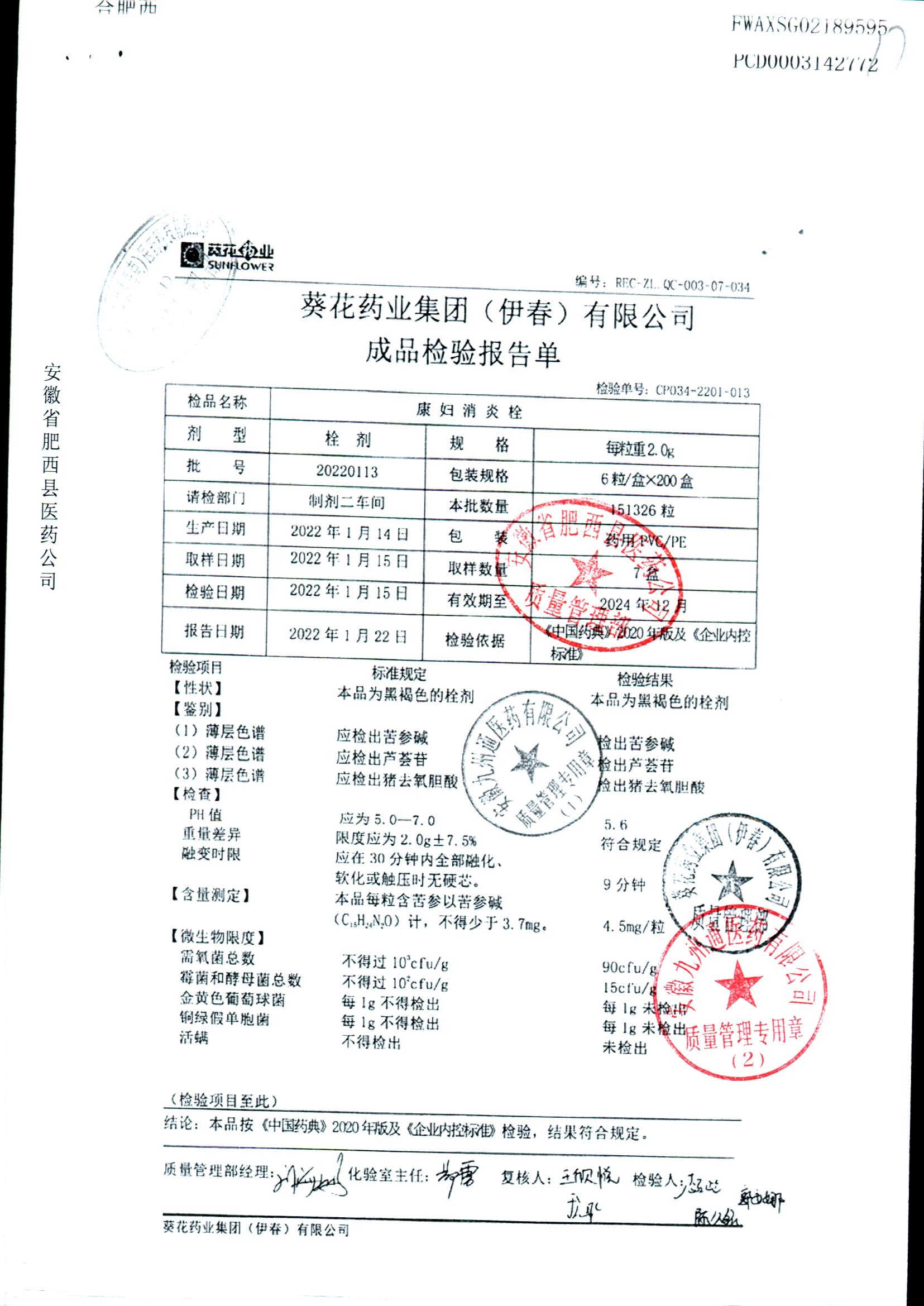 康妇消炎栓 | 2.0g*6粒 | 20220113 | 查看详情 |