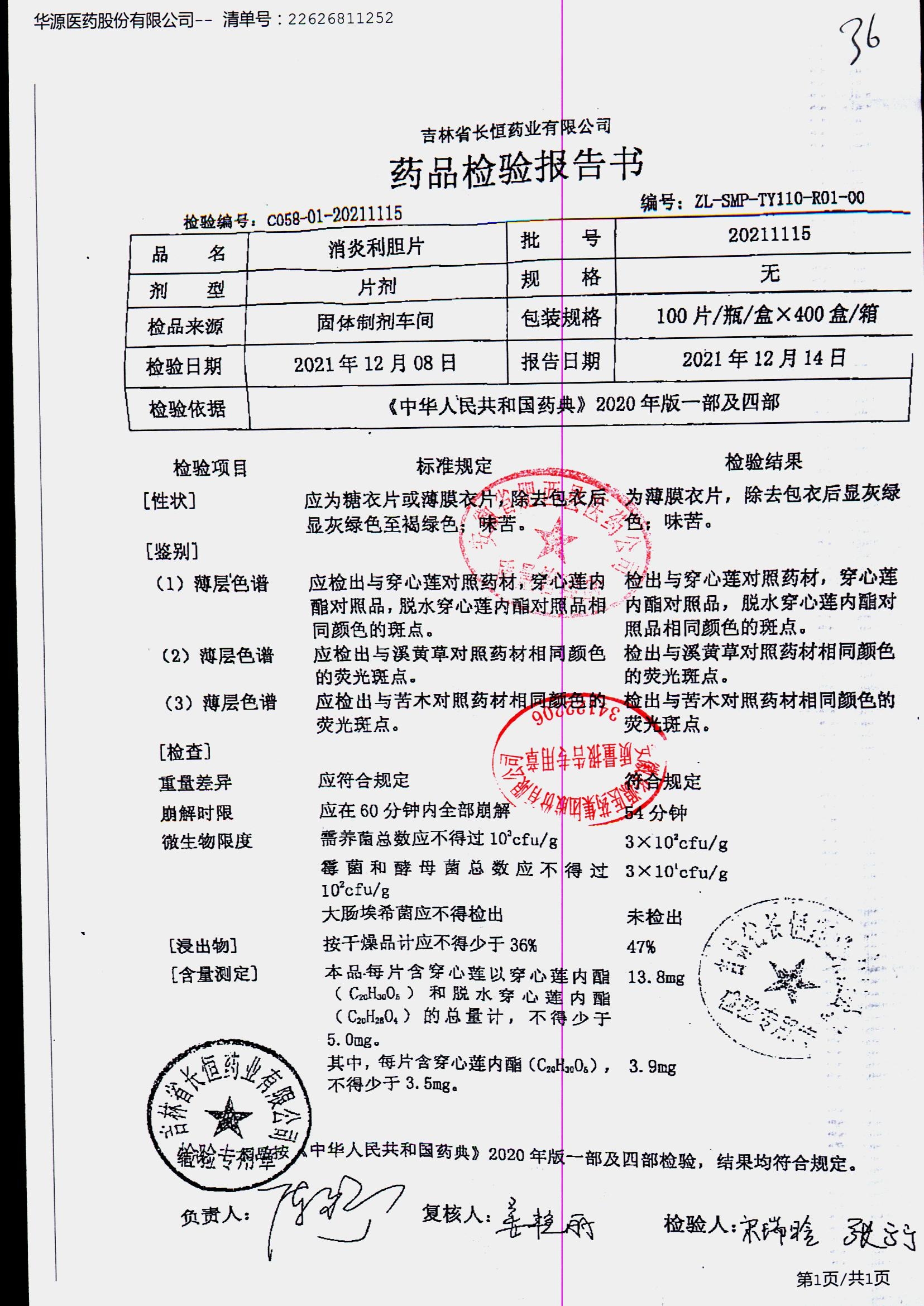 消炎利胆片 | 100片 | 20211115 | 查看详情 |