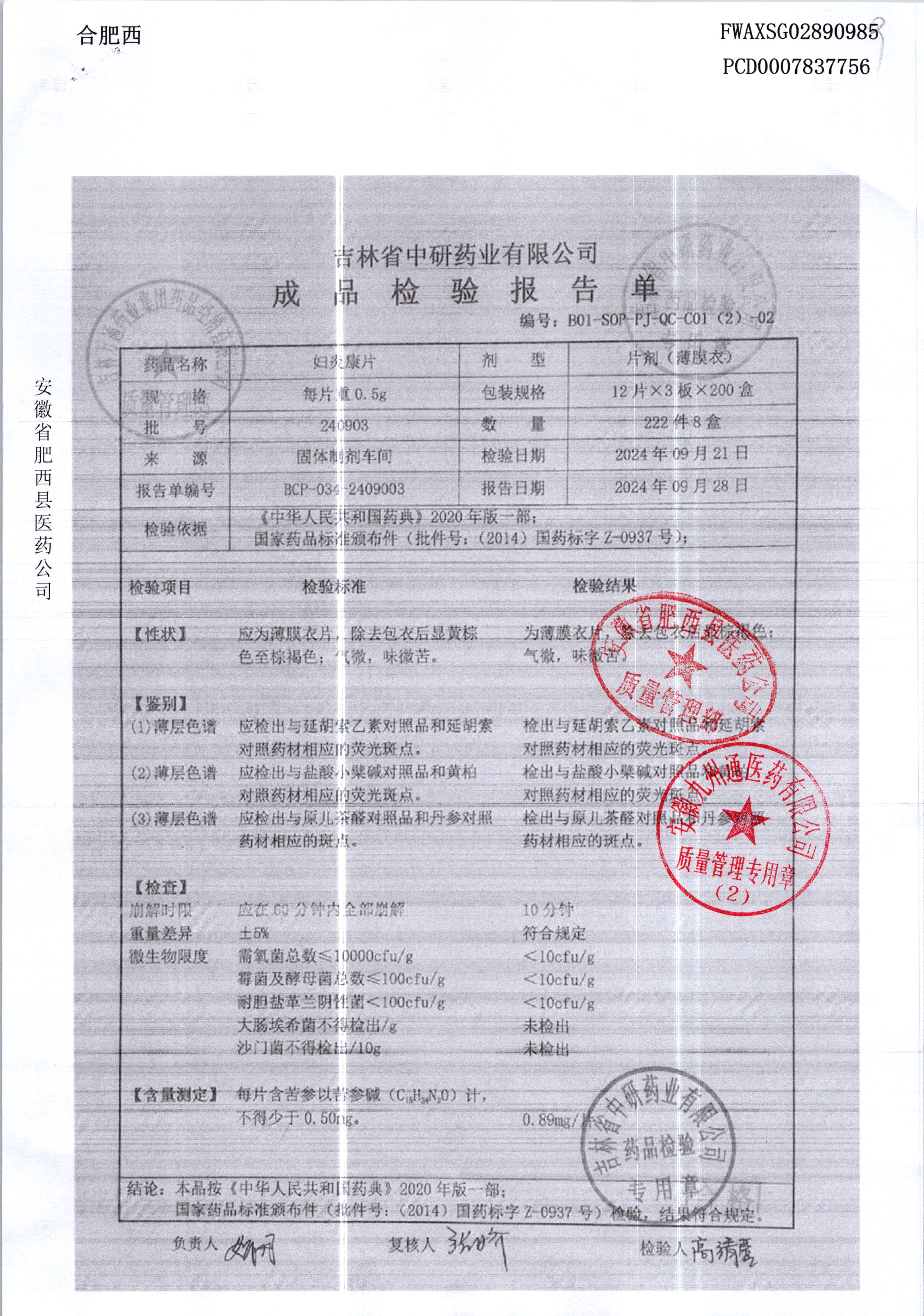 妇炎康片 | 0.5克x12片x3板 | 240903 | 查看详情 |