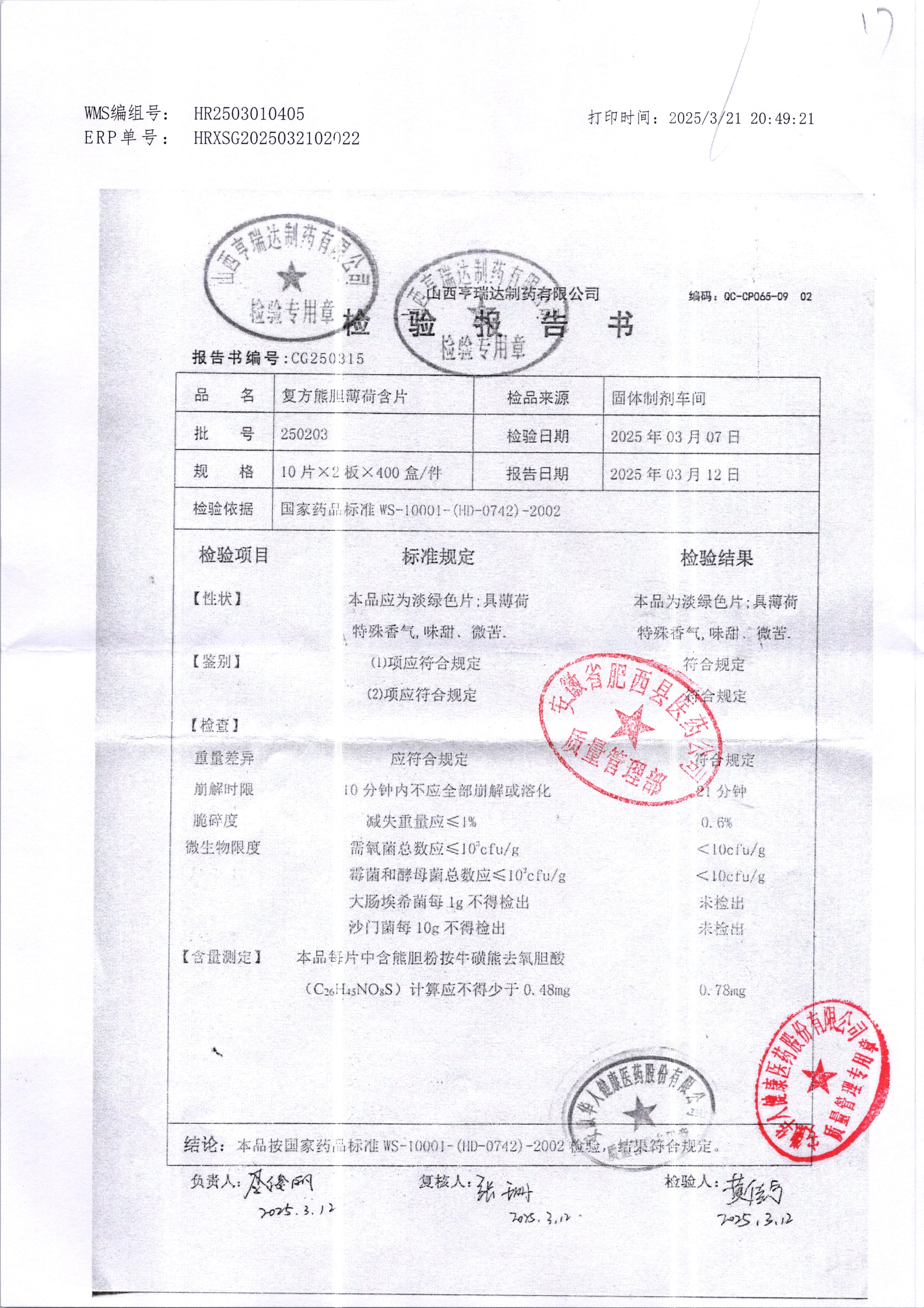 复方熊胆薄荷含片 | 20片 | 250203 | 查看详情 |