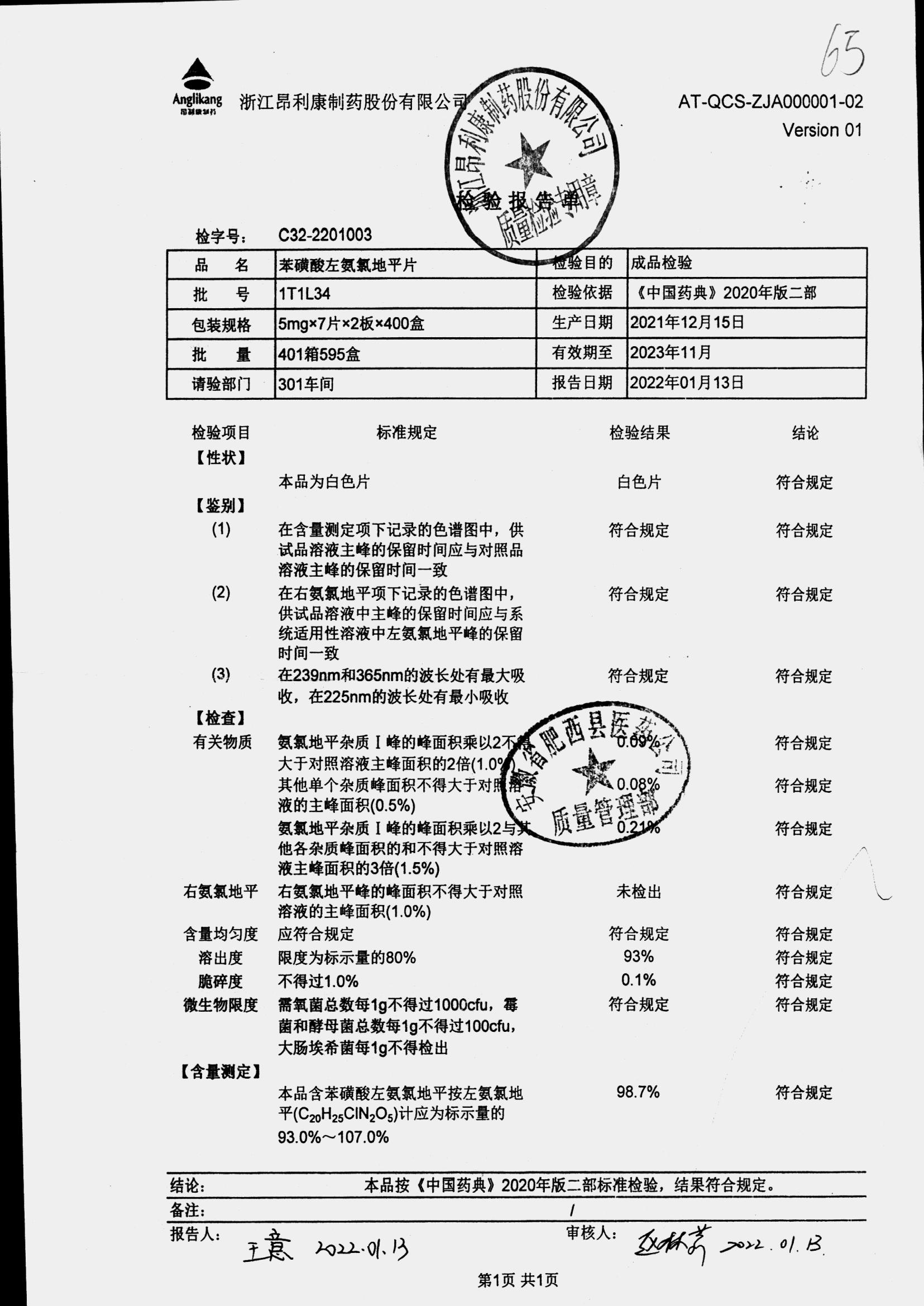 苯磺酸左氨氯地平片 | 5mgx7片 | 1T1L34 | 查看详情 |