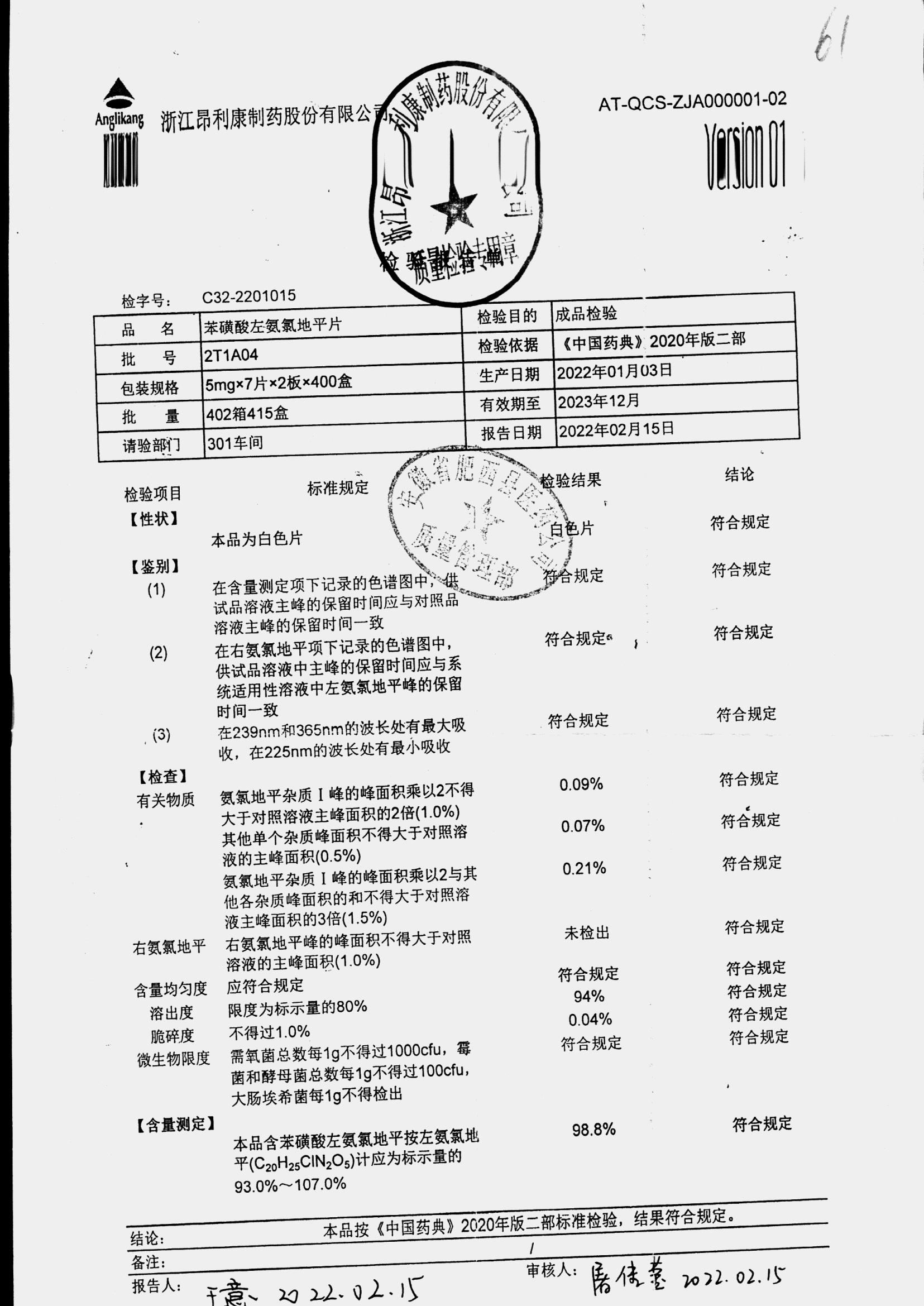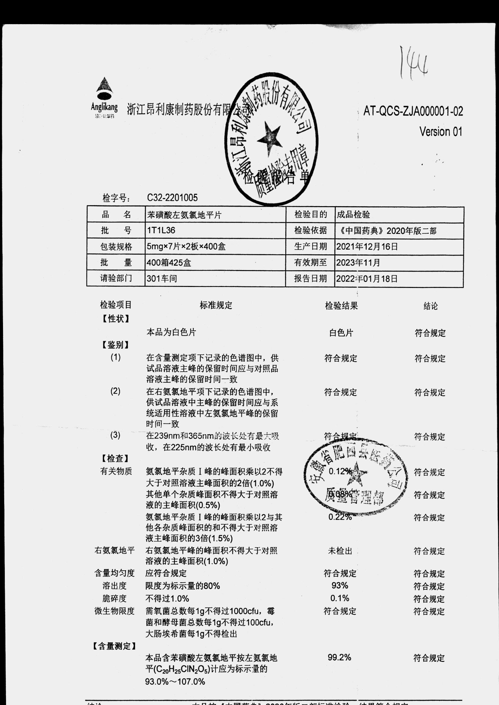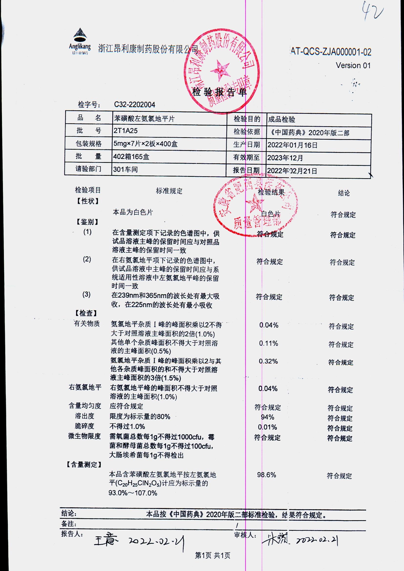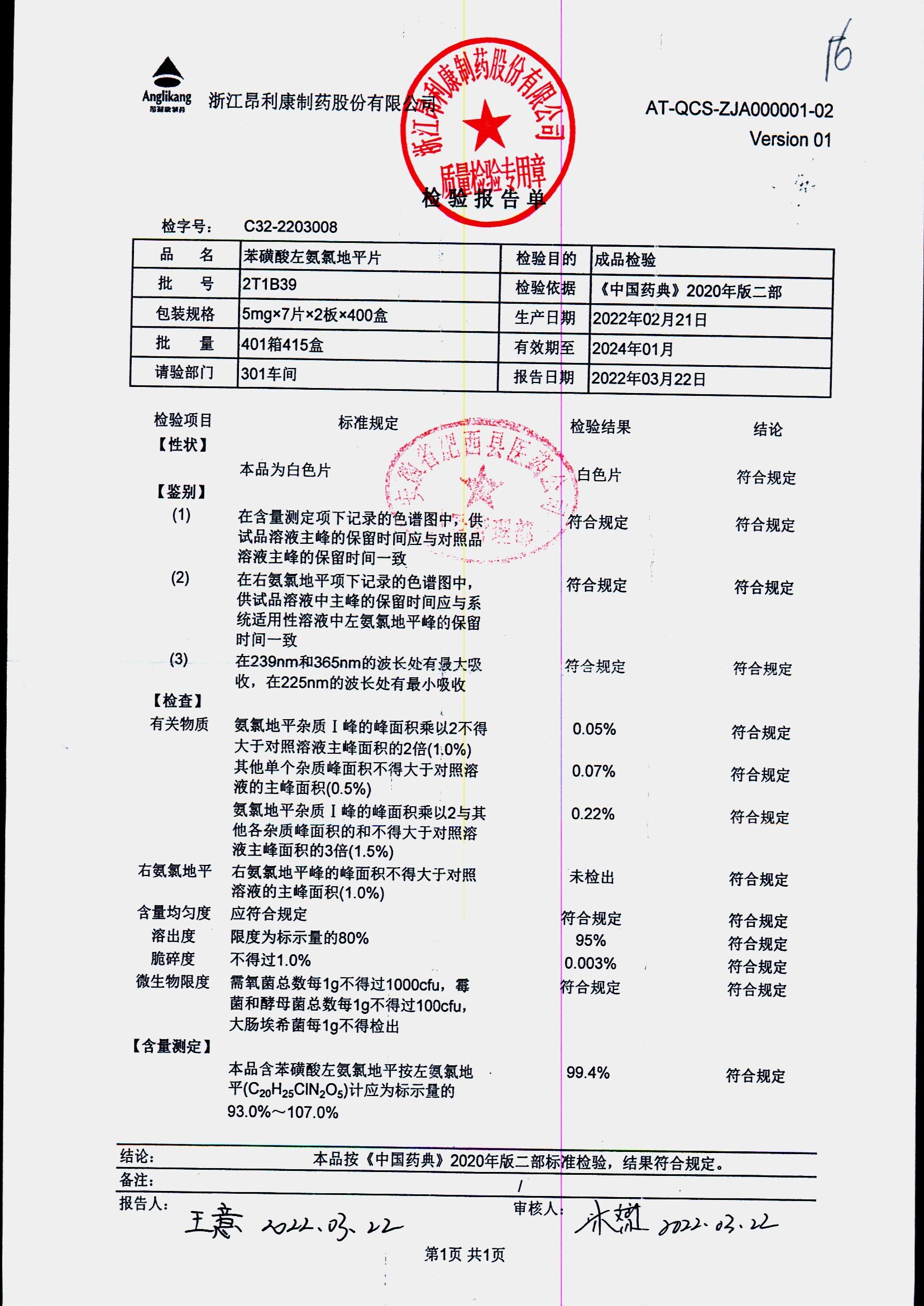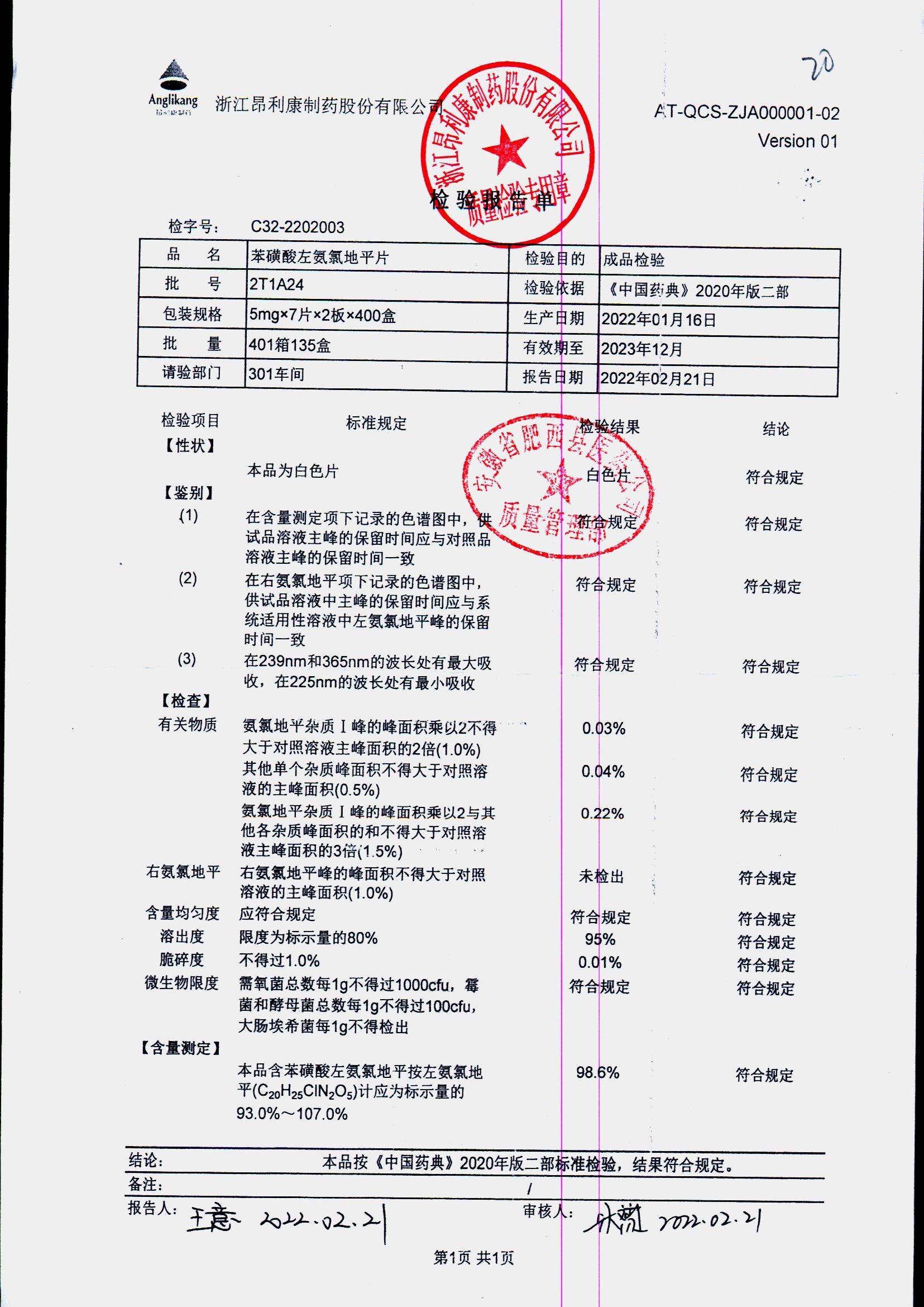苯磺酸左氨氯地平片 | 5mgx7片 | 2T1A04 | 查看详情 |