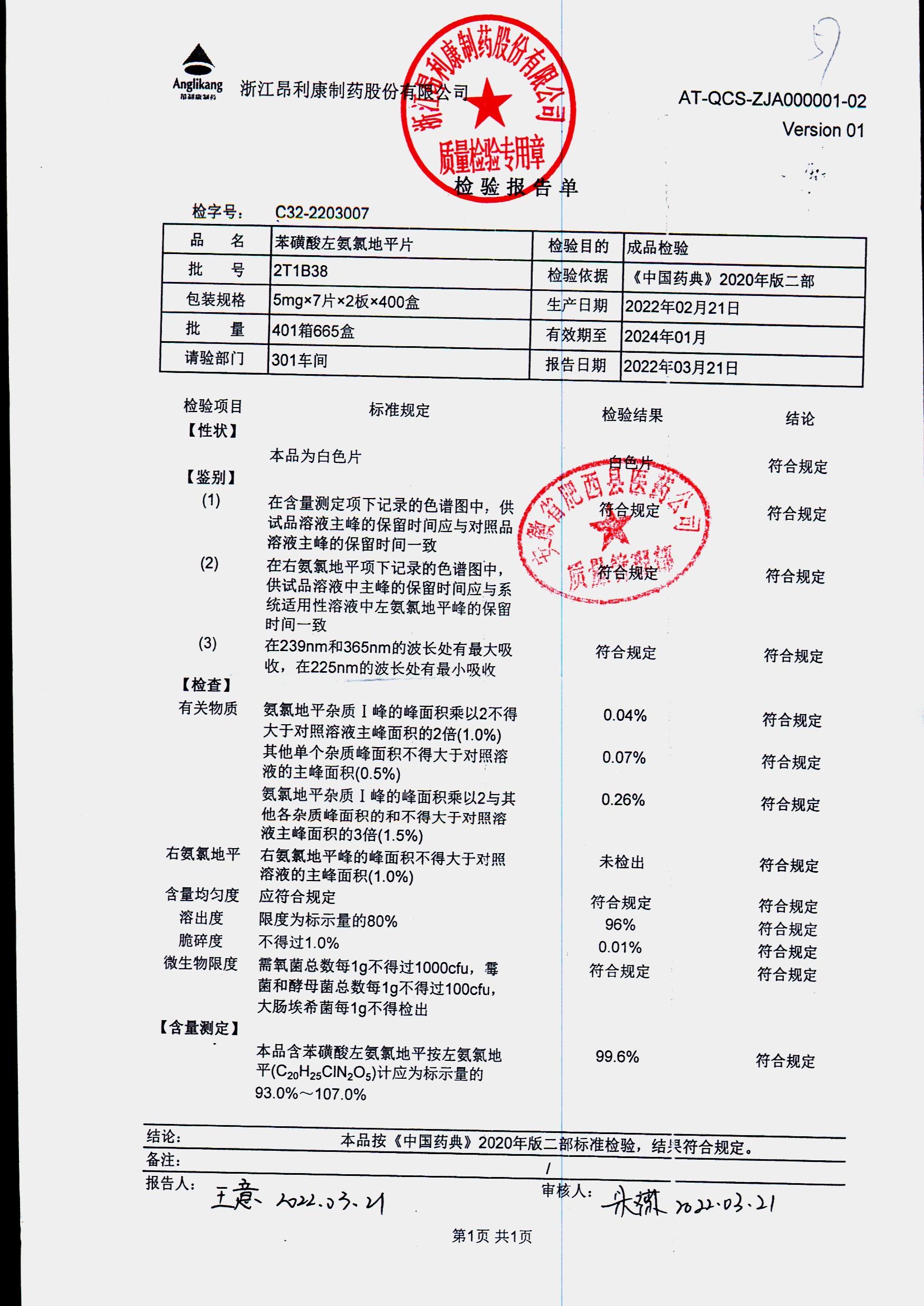 苯磺酸左氨氯地平片 | 5mgx7片 | 2T1B38 | 查看详情 |