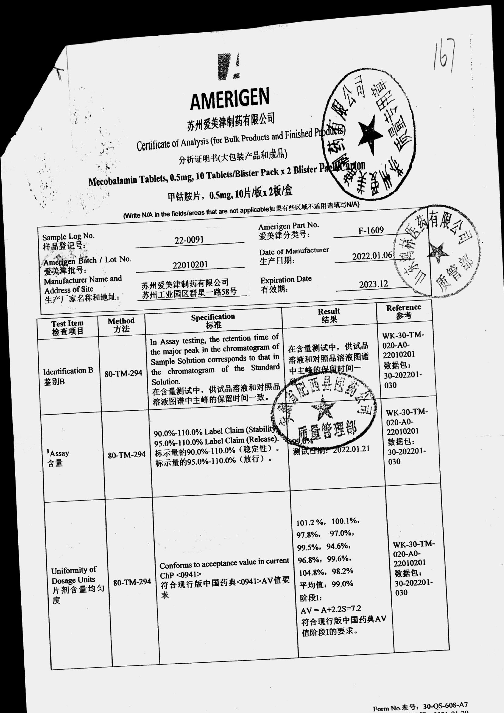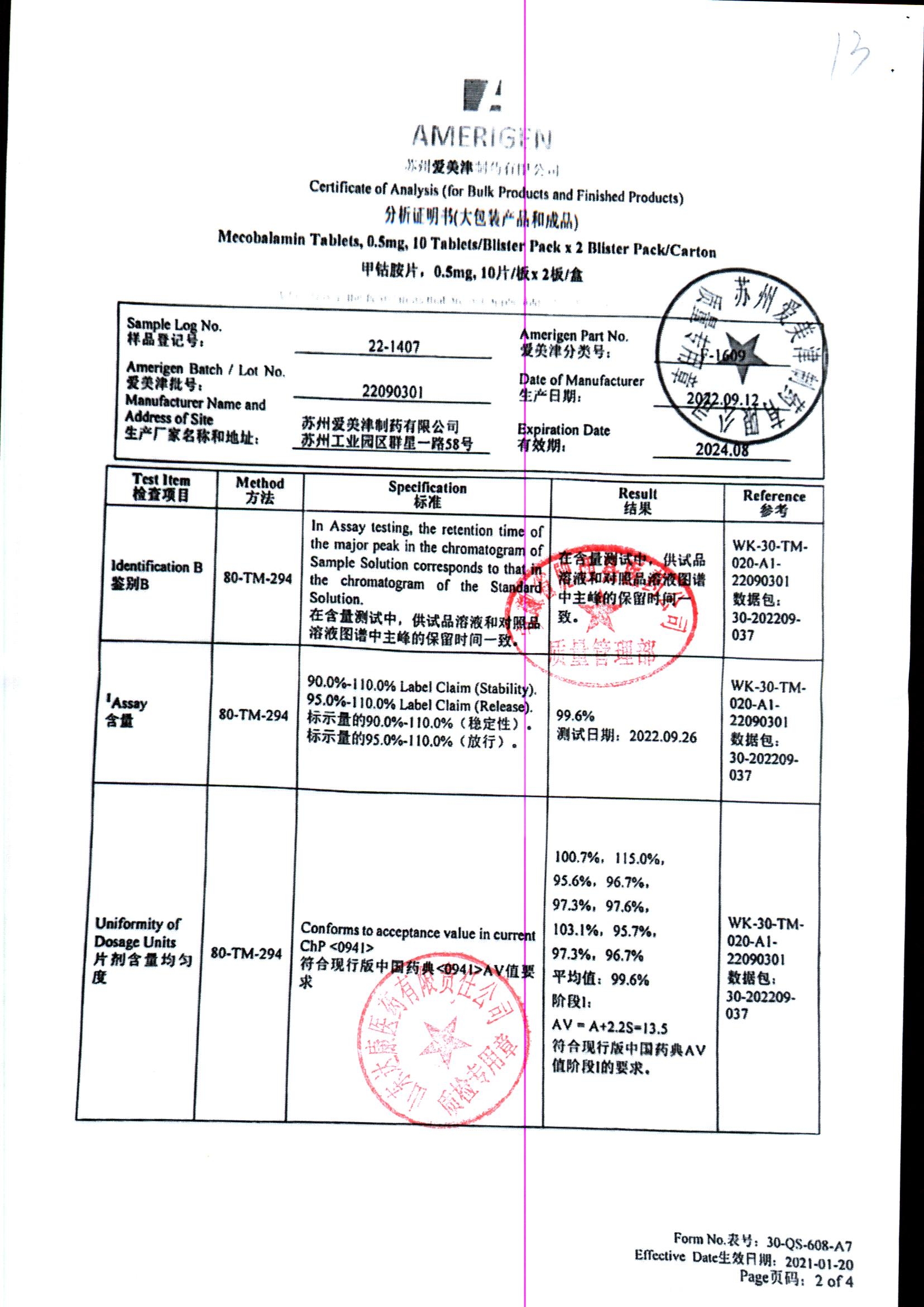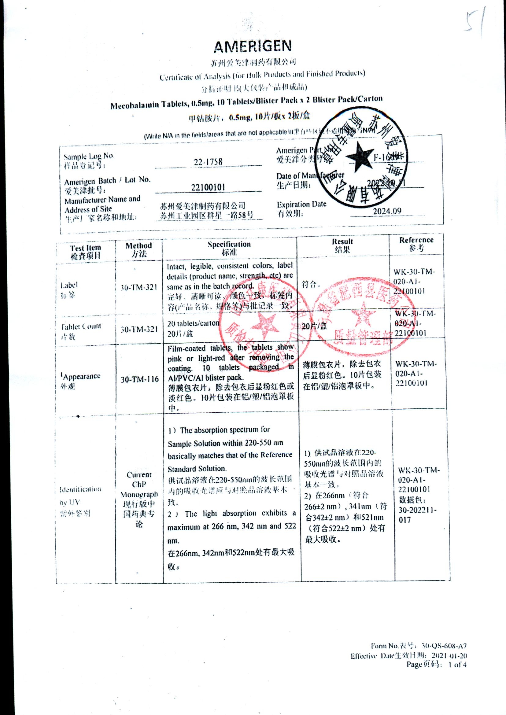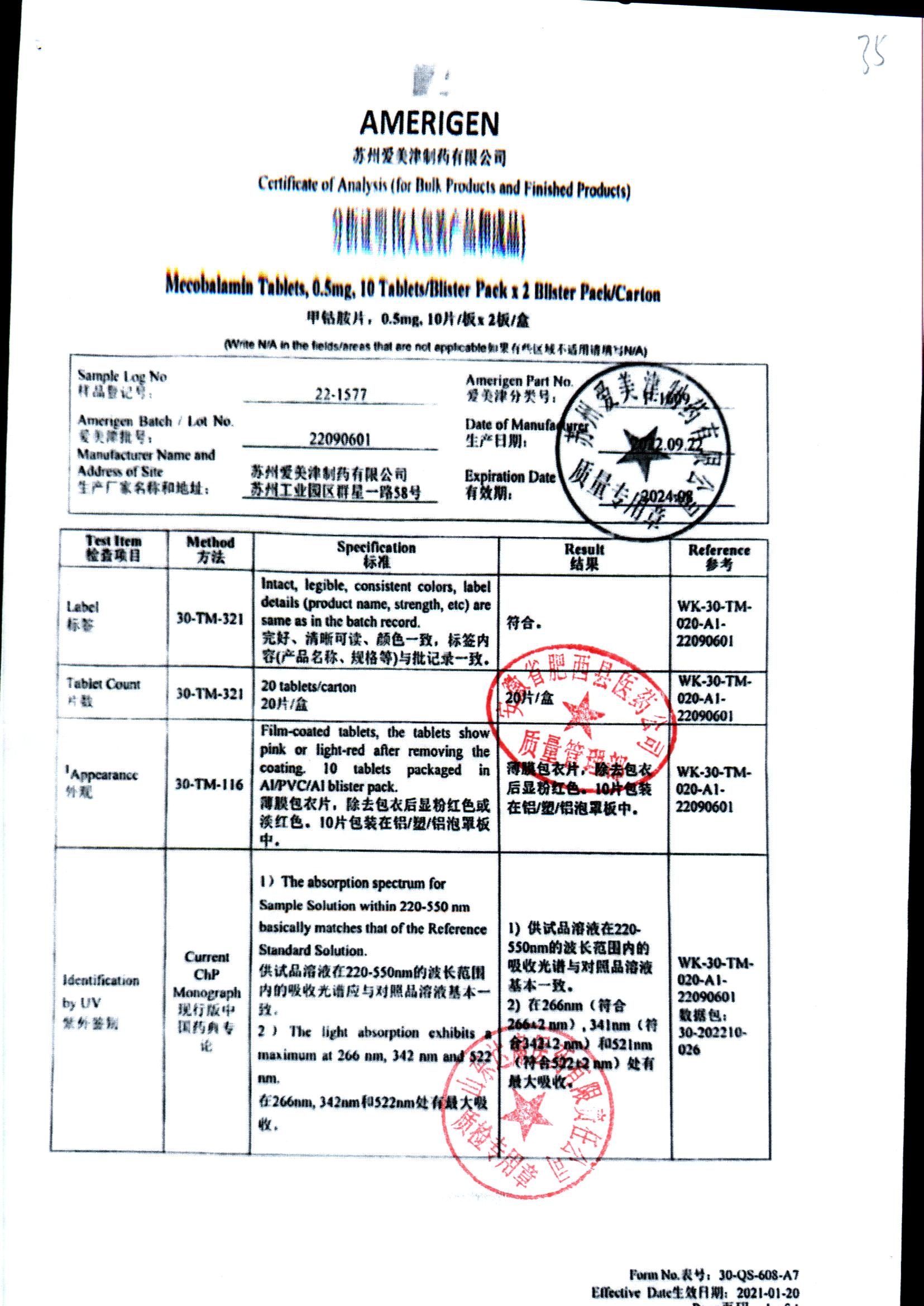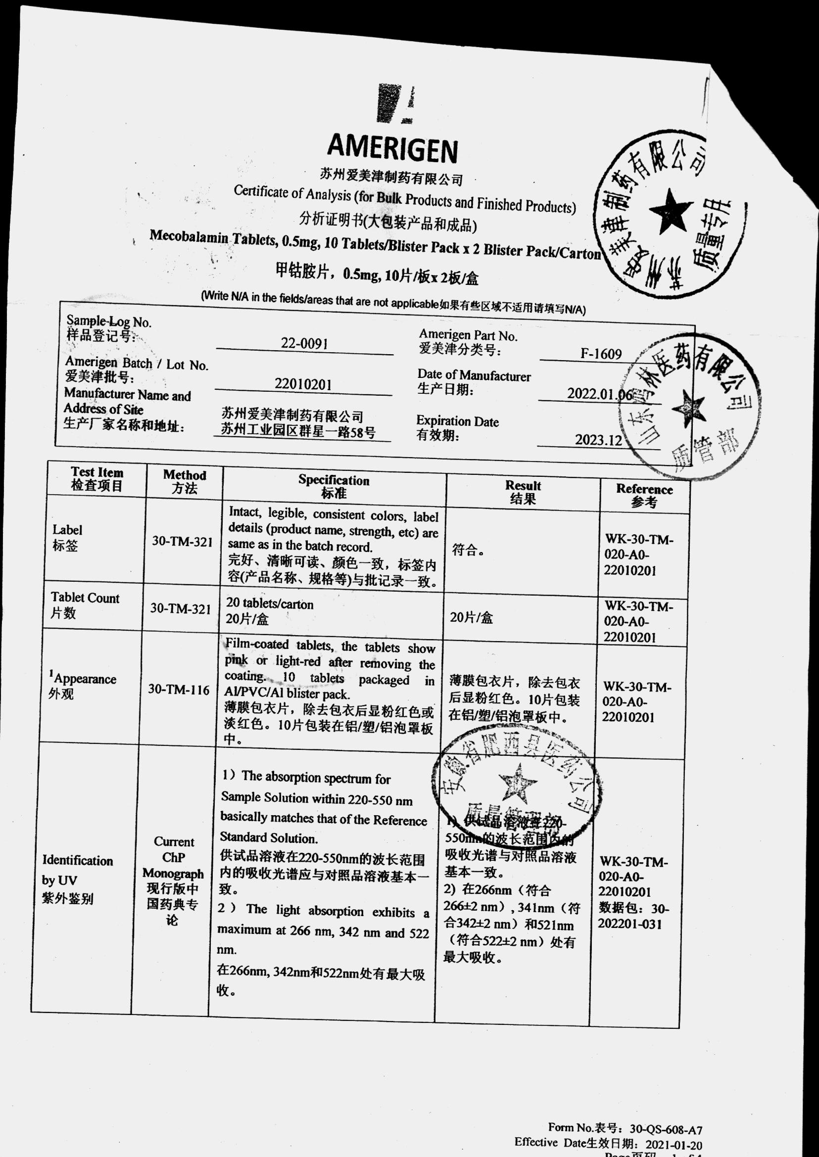 甲钴胺片 | 20片 | 22090601/2 | 查看详情 |
