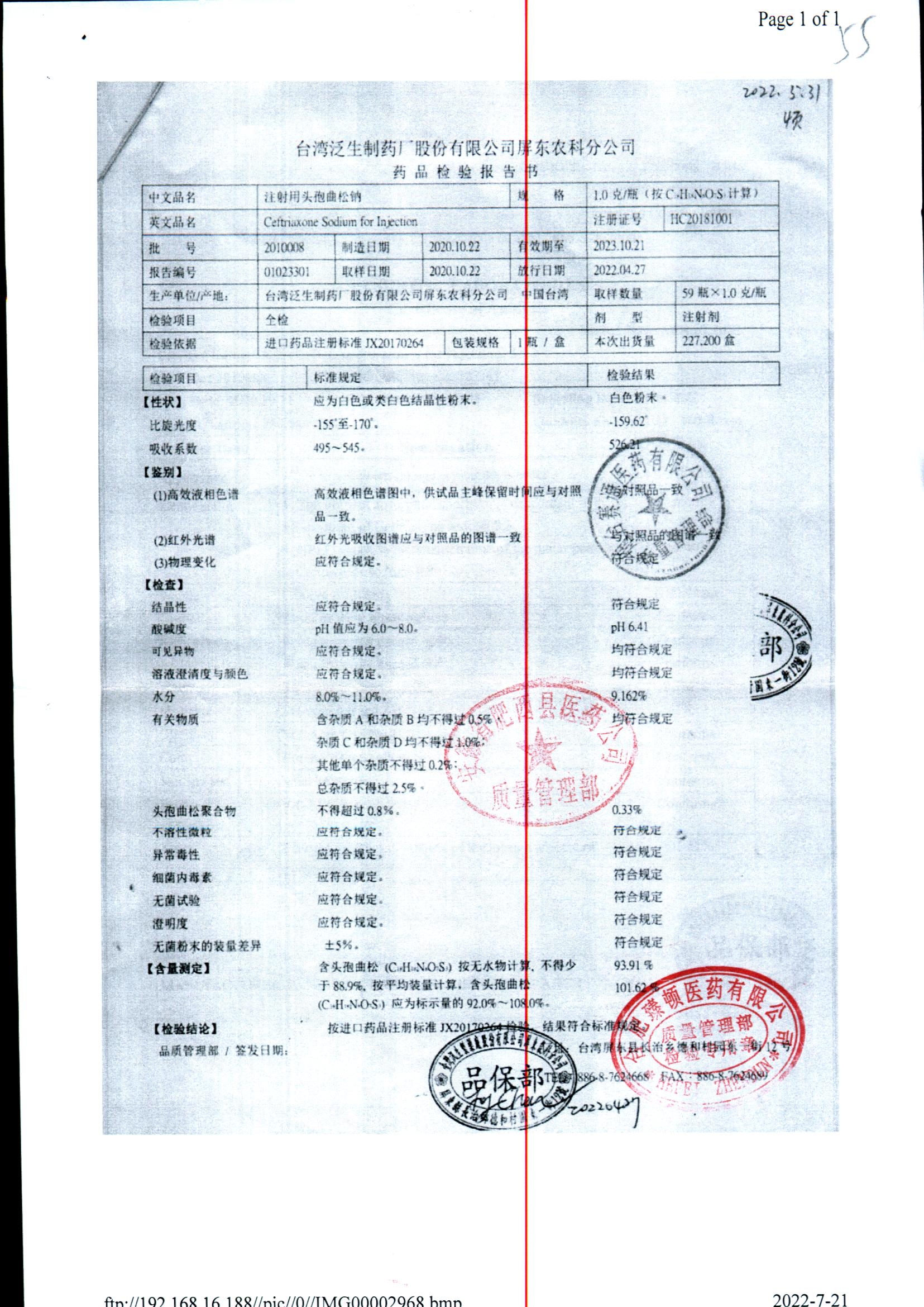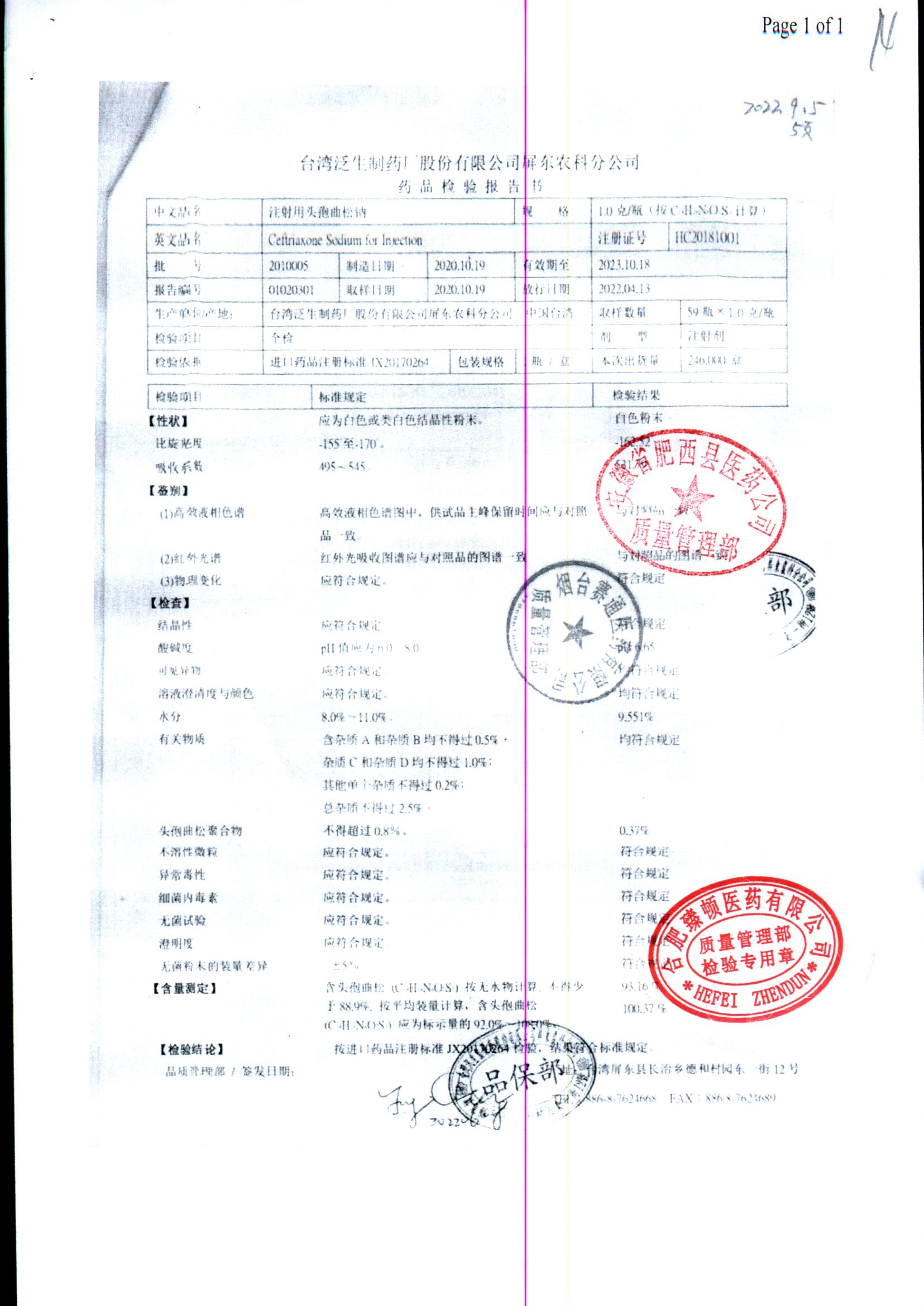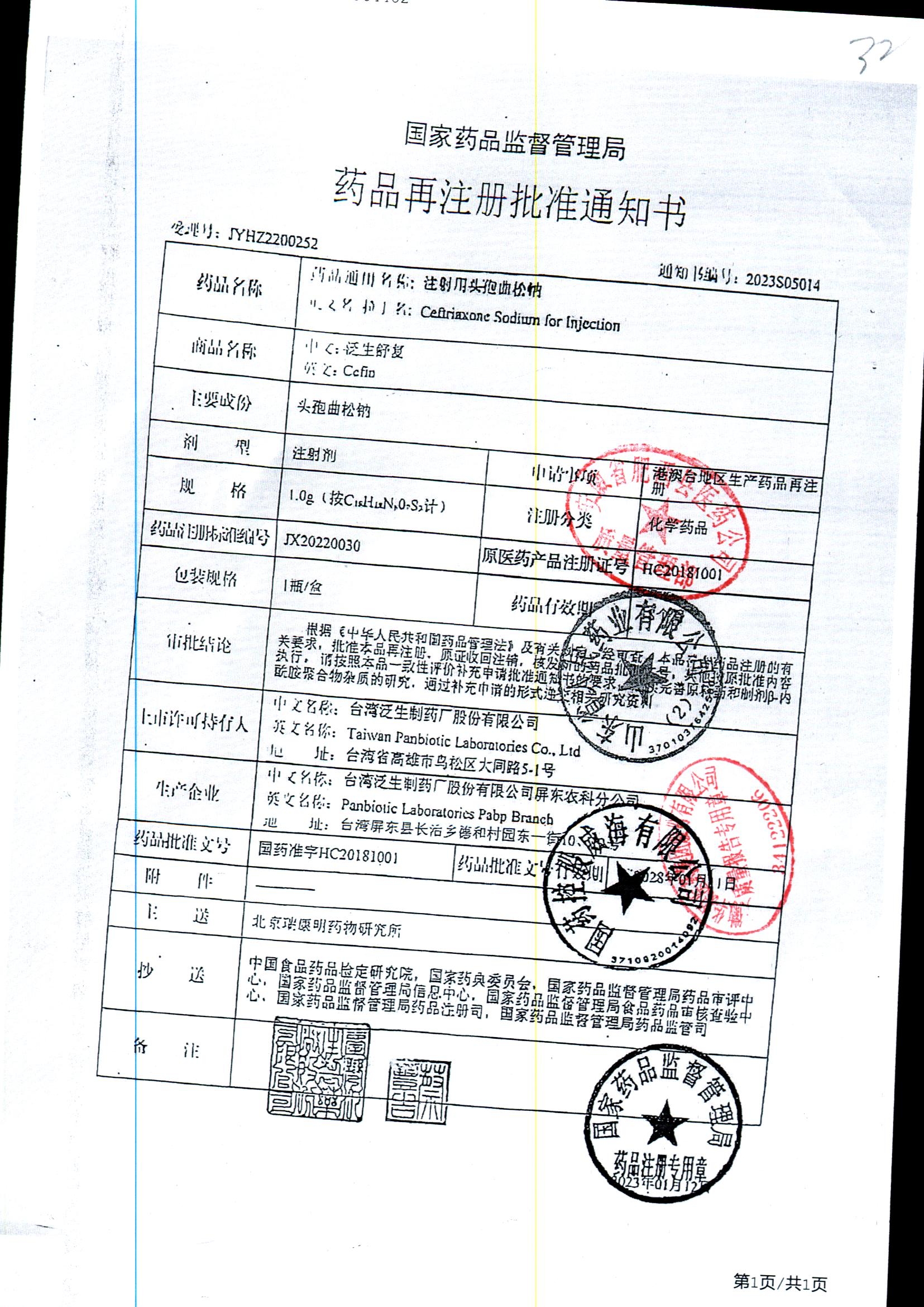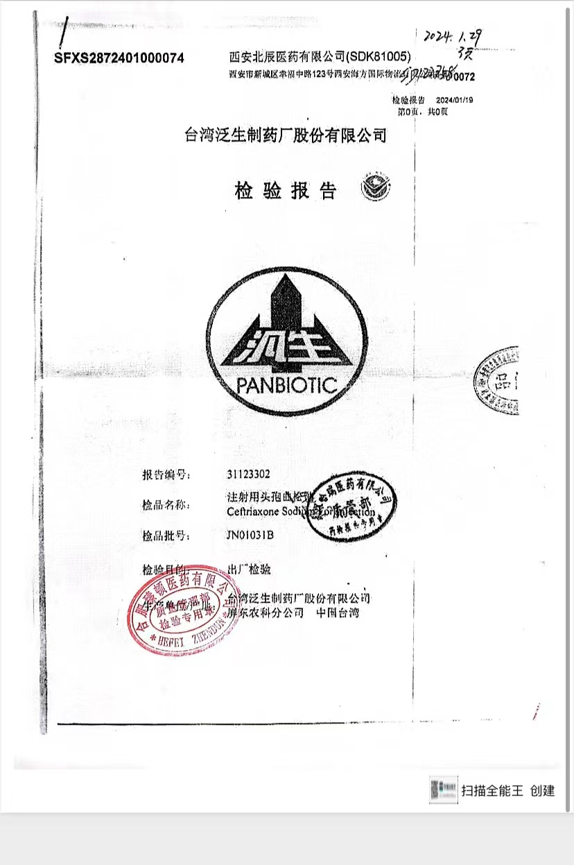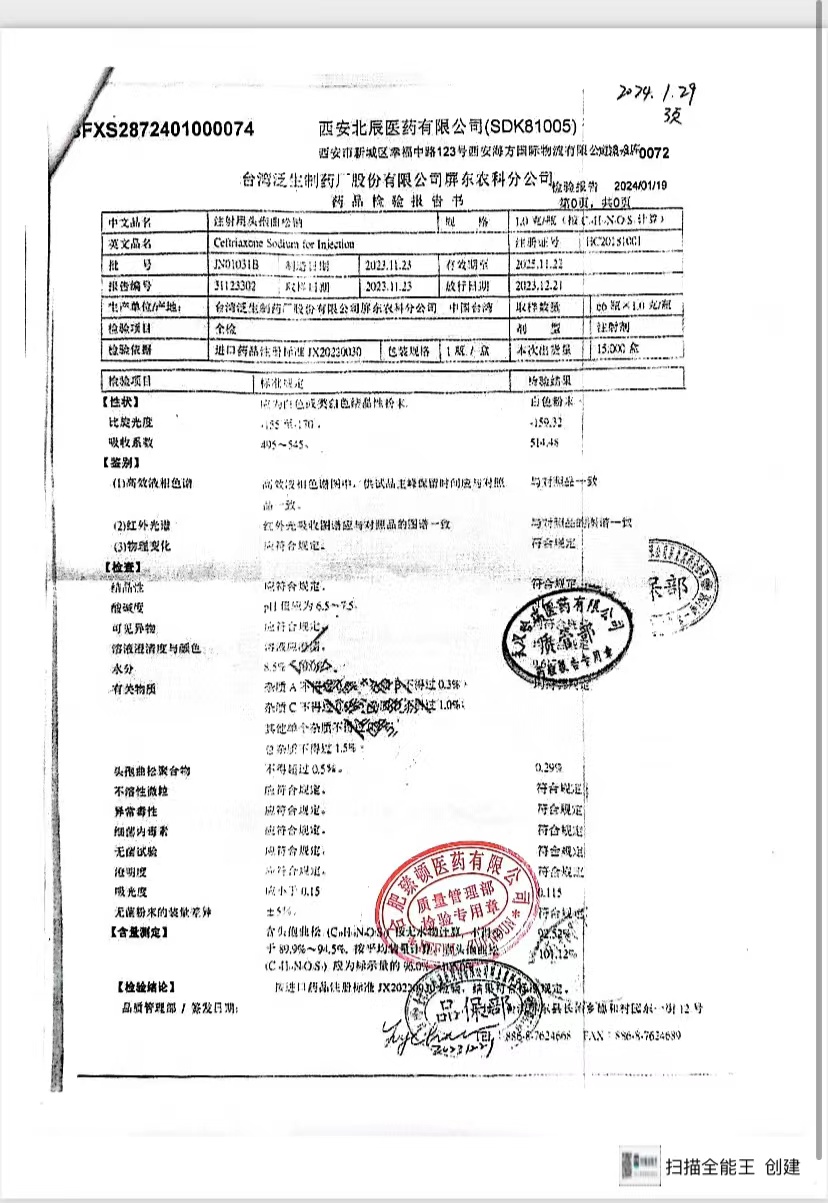 注射用头孢曲松钠 | 1.0g | JN01031B/7 | 查看详情 |