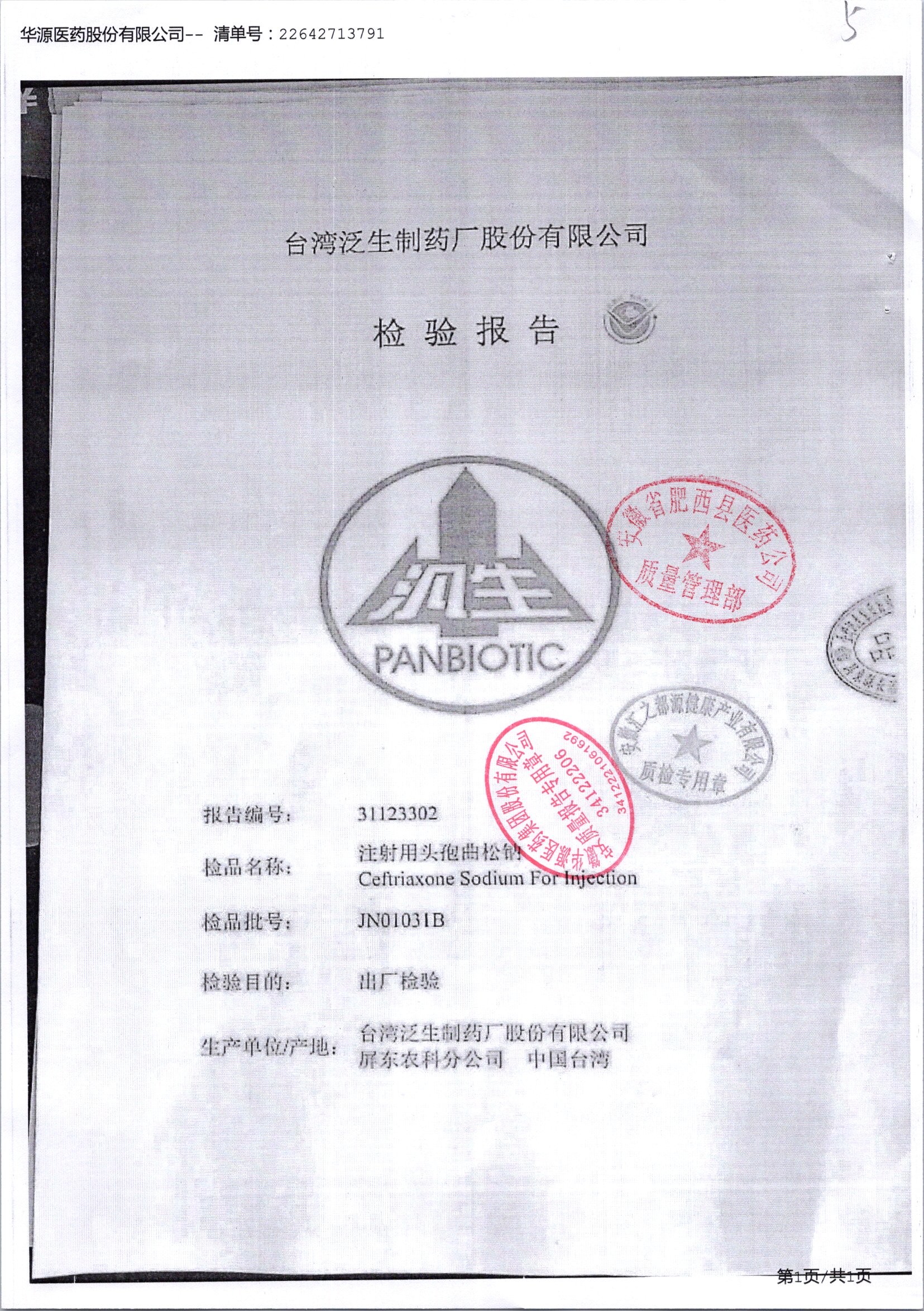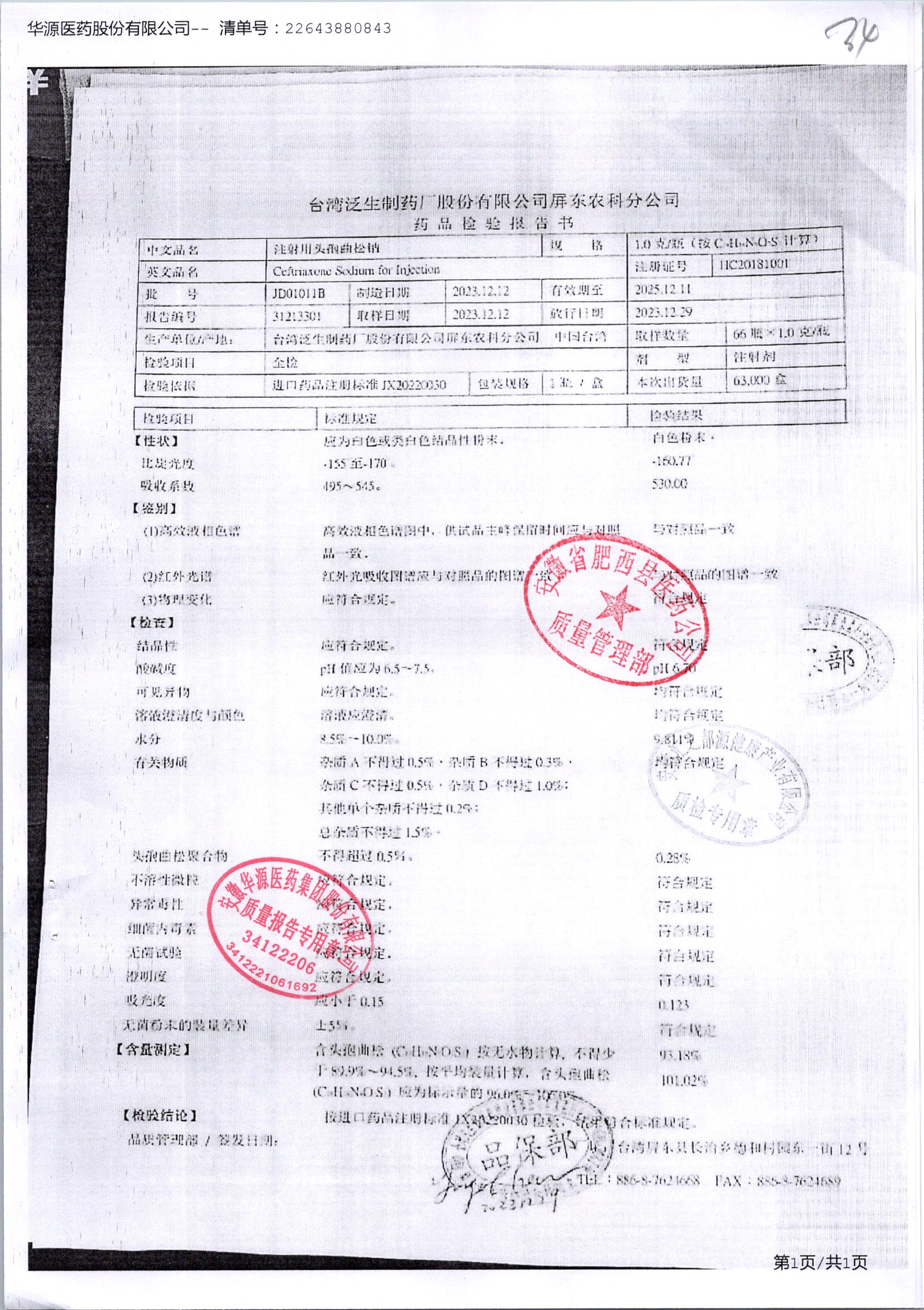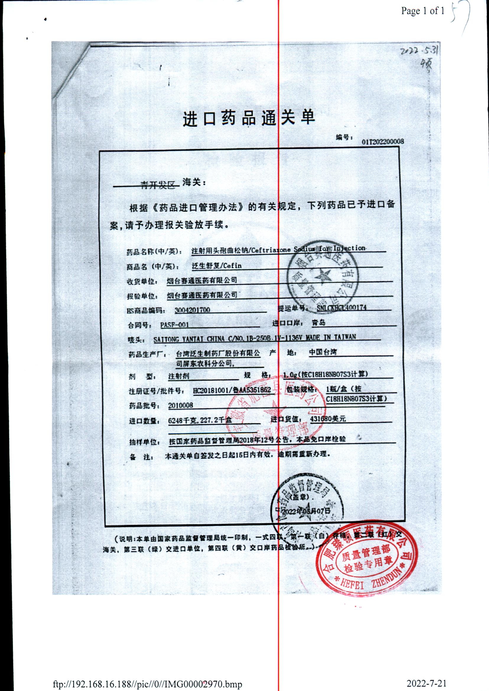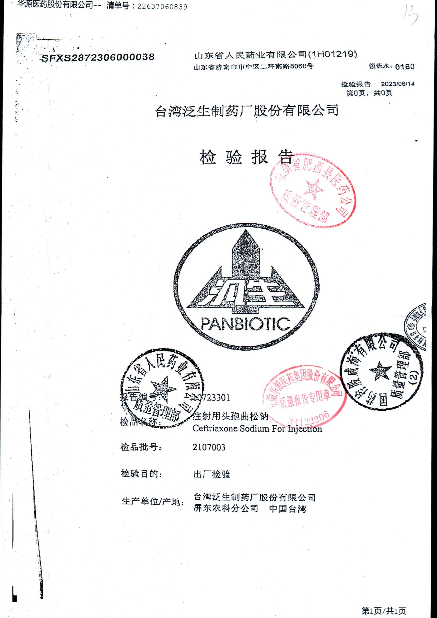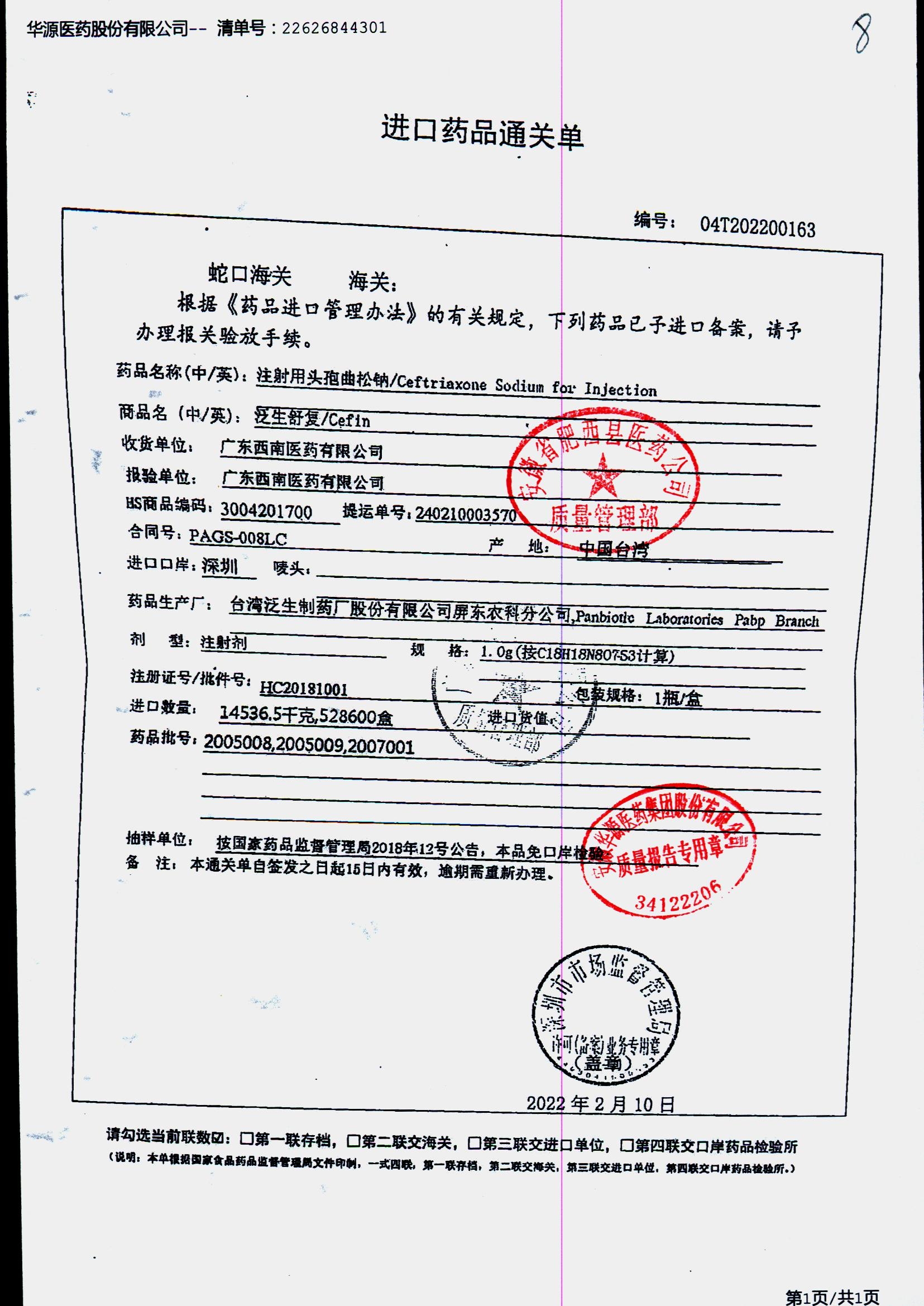 注射用头孢曲松钠 | 1.0g | JN01031B/7 | 查看详情 |