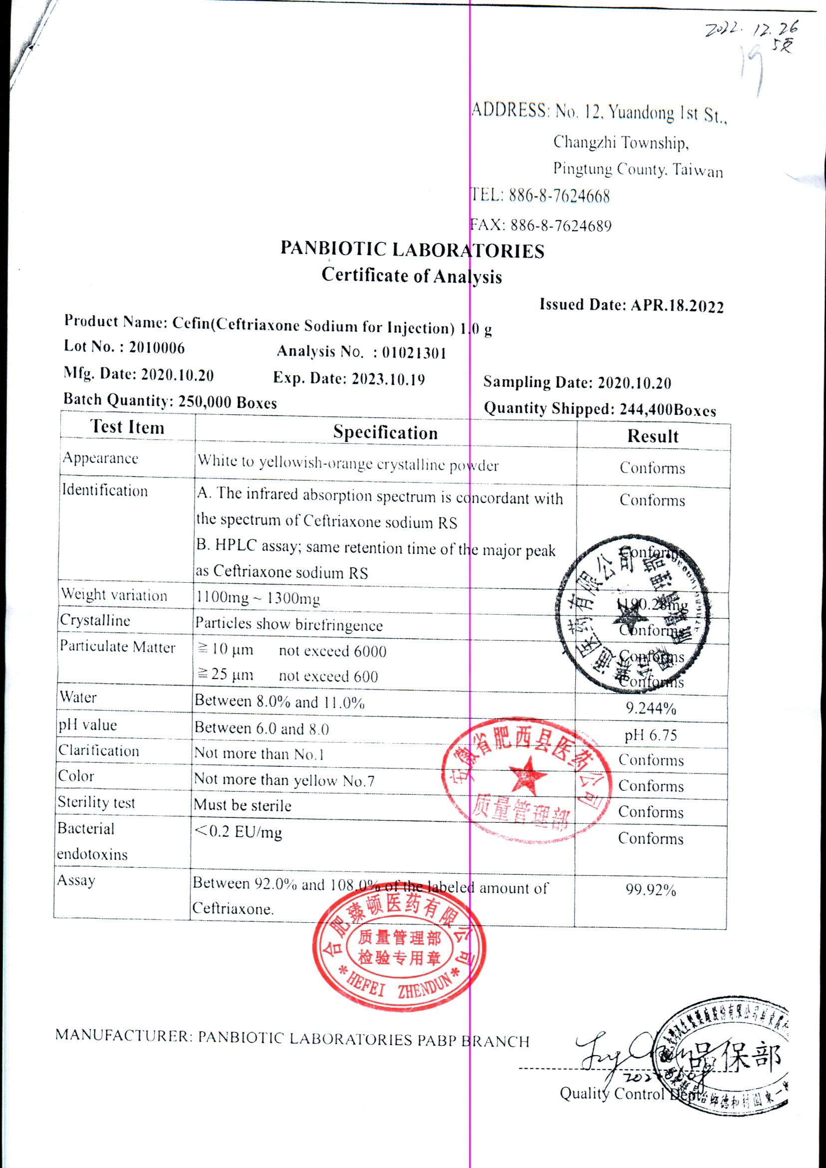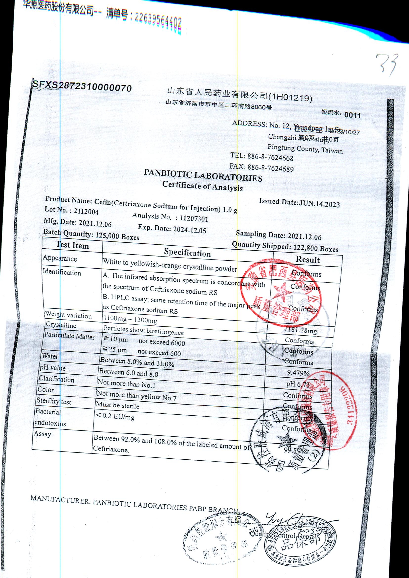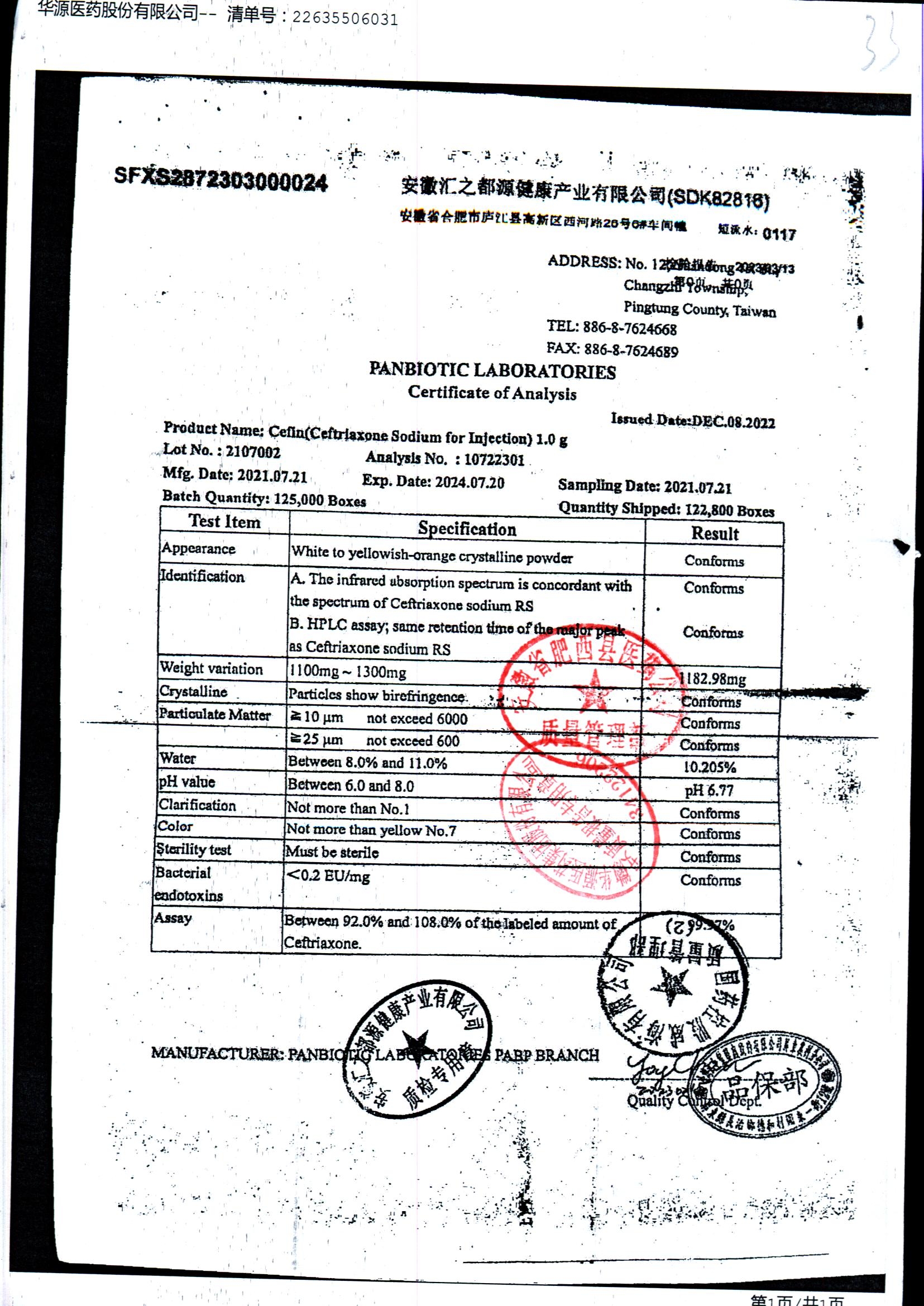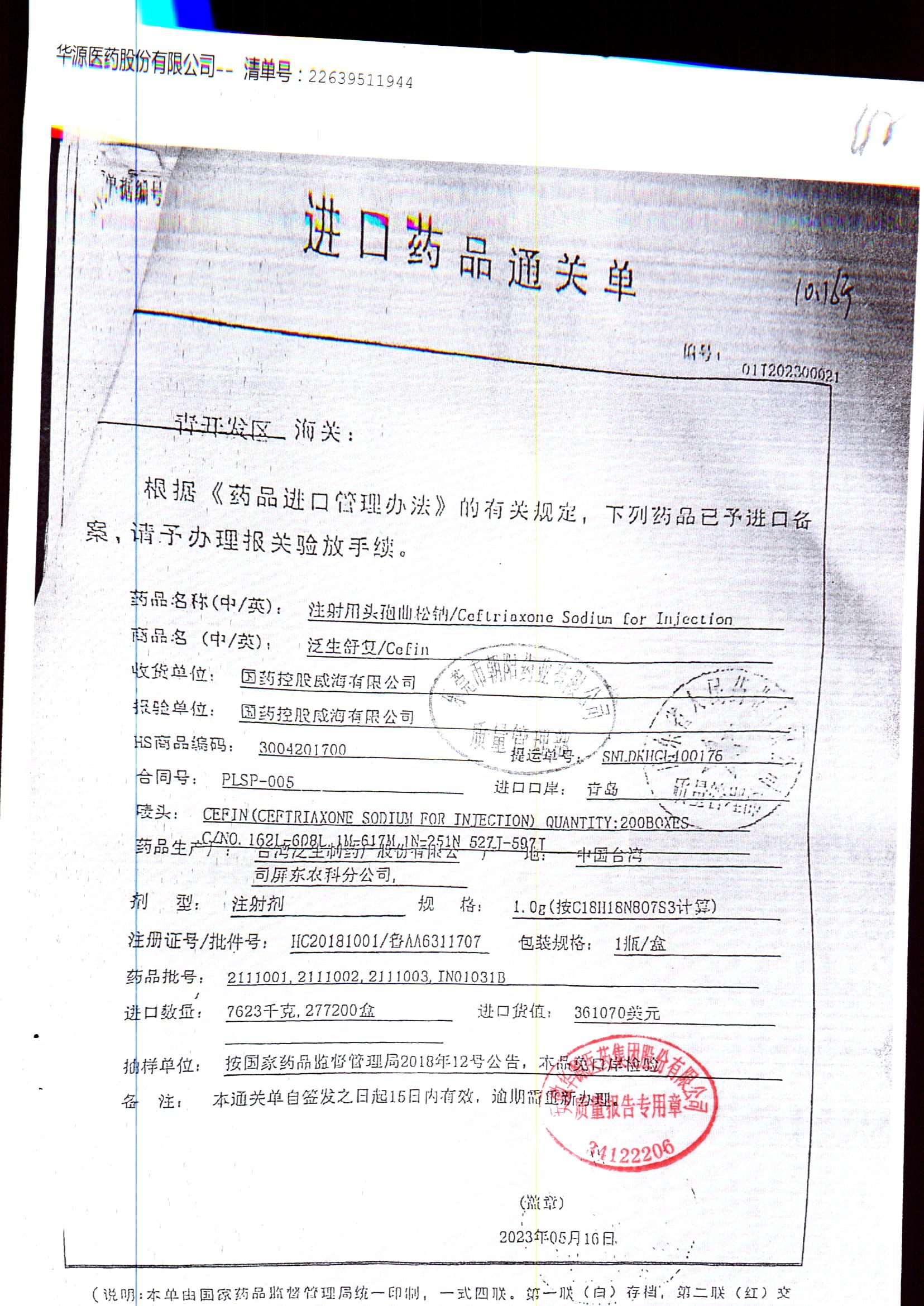 注射用头孢曲松钠 | 1.0g | JN01031B/7 | 查看详情 |
