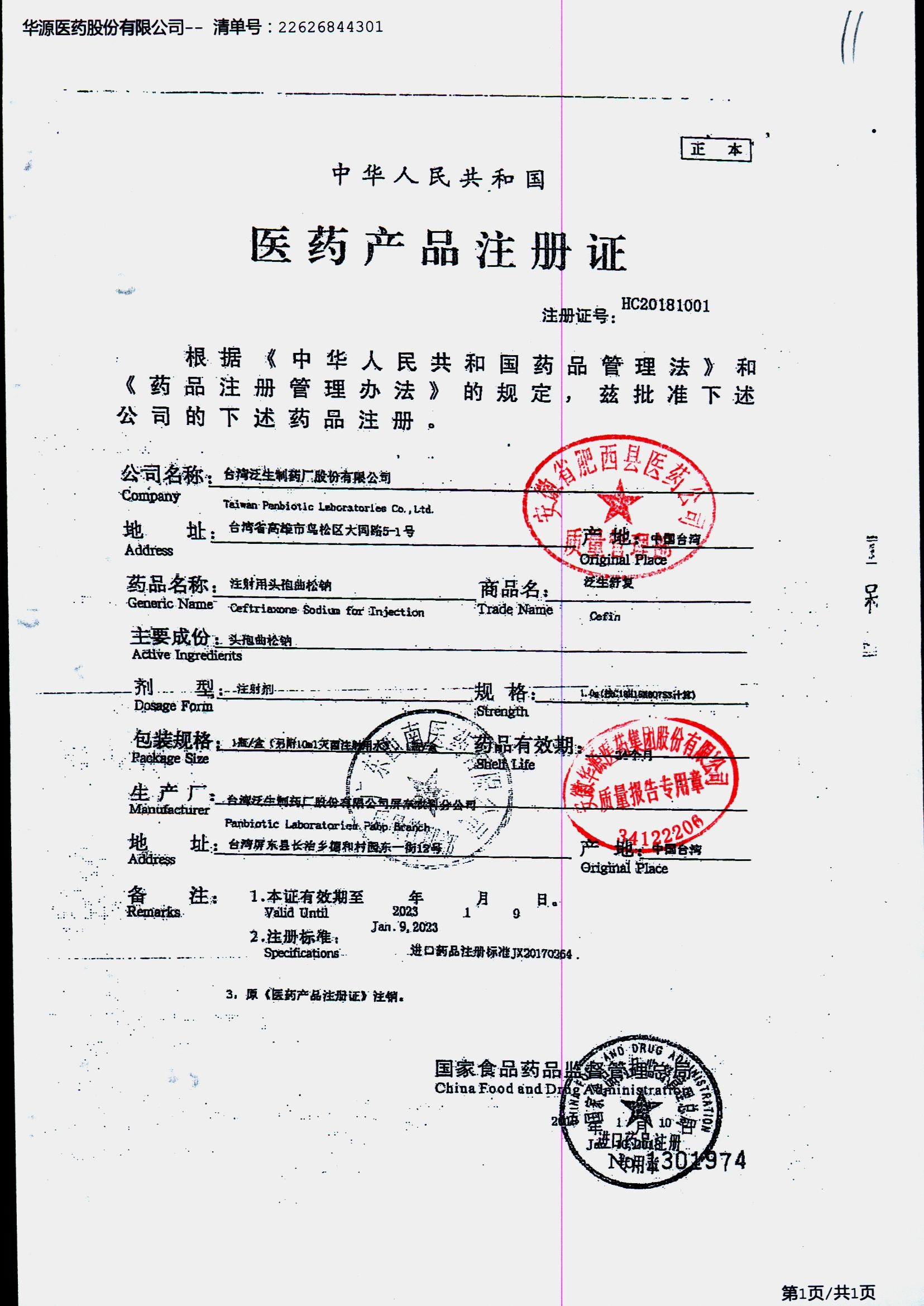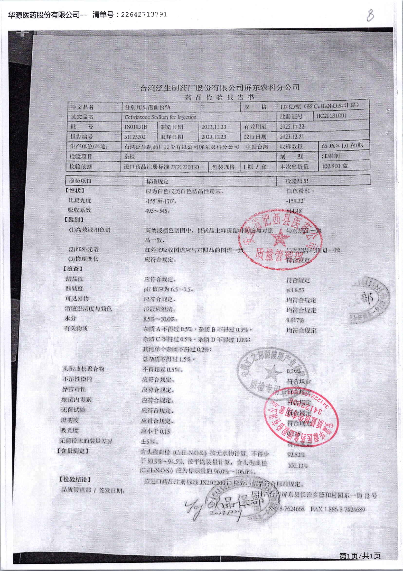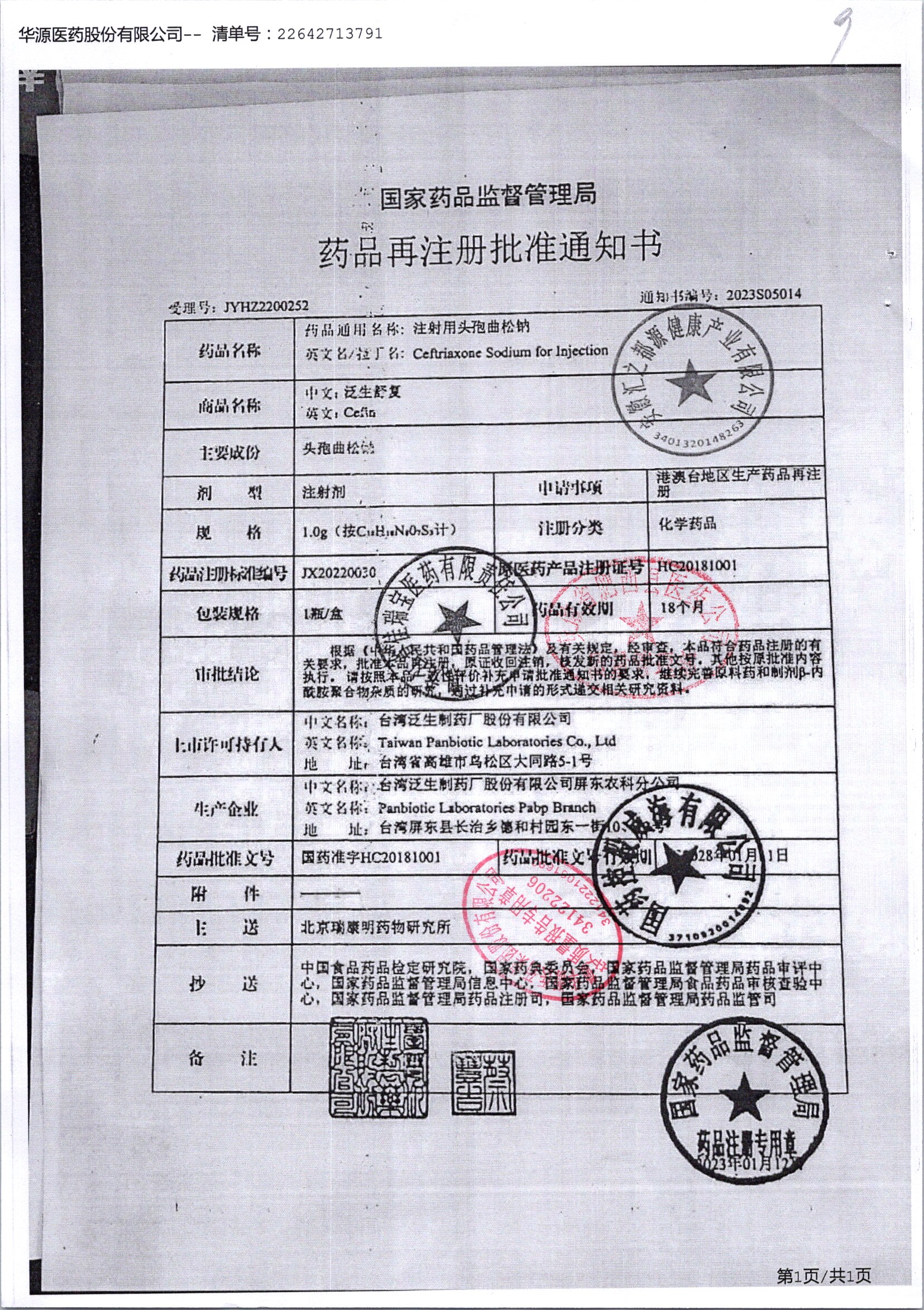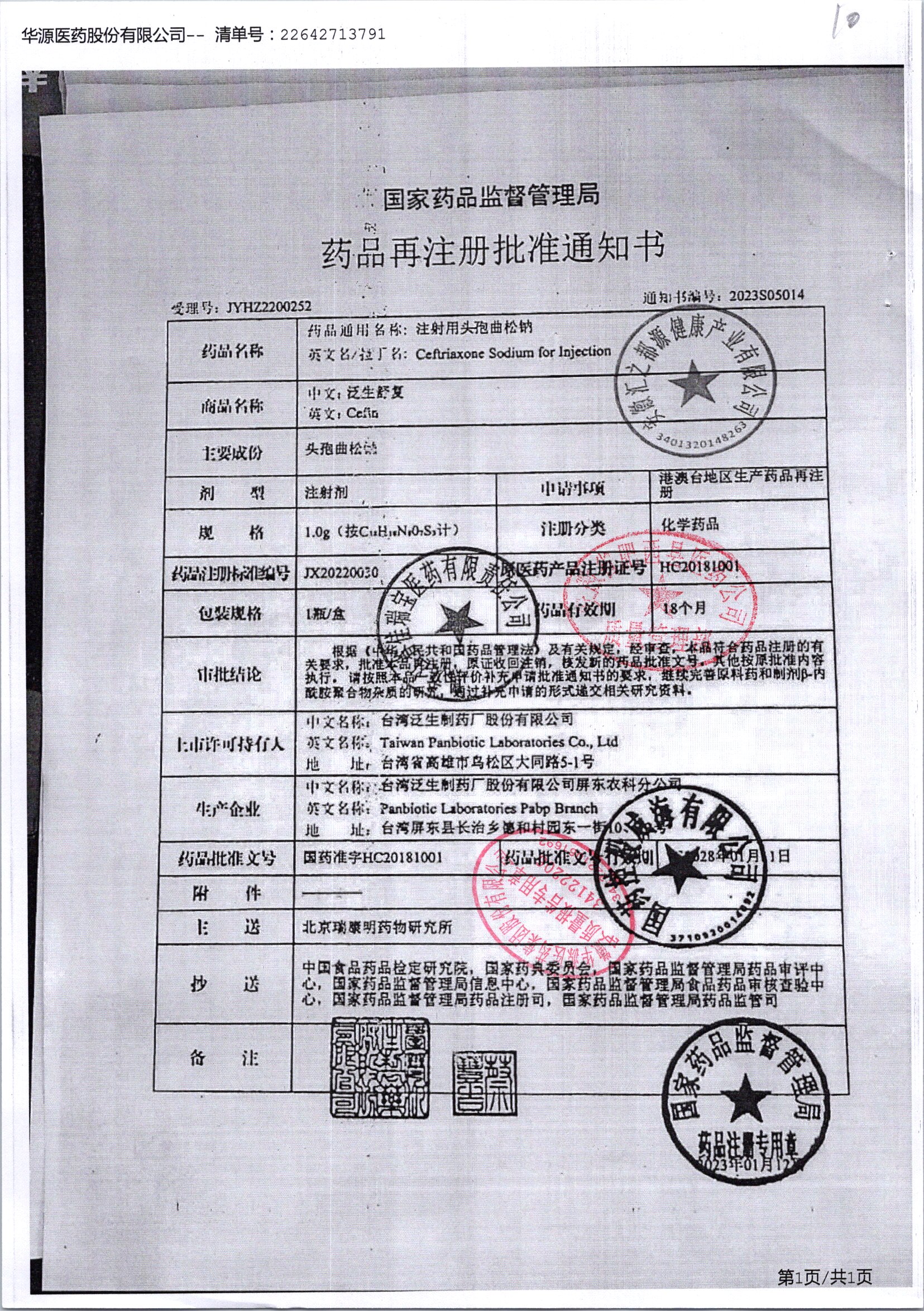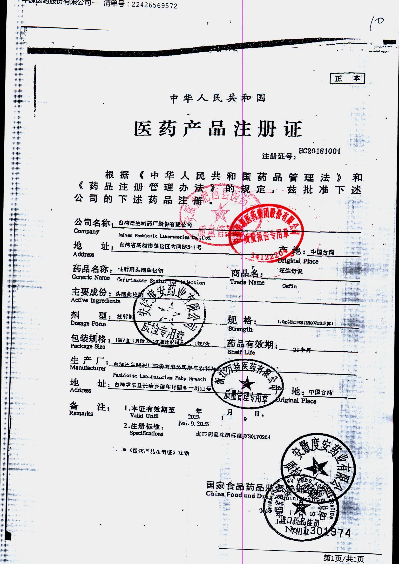 注射用头孢曲松钠 | 1.0g | JN01031B/8 | 查看详情 |