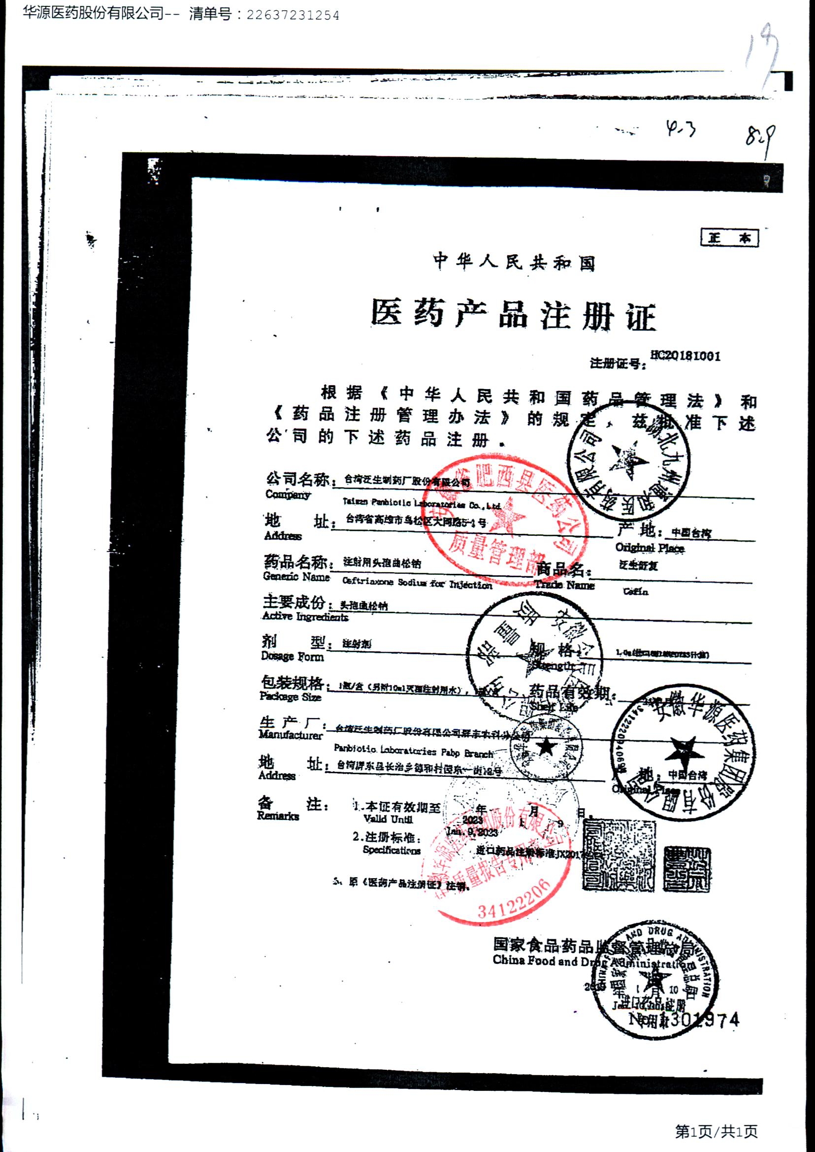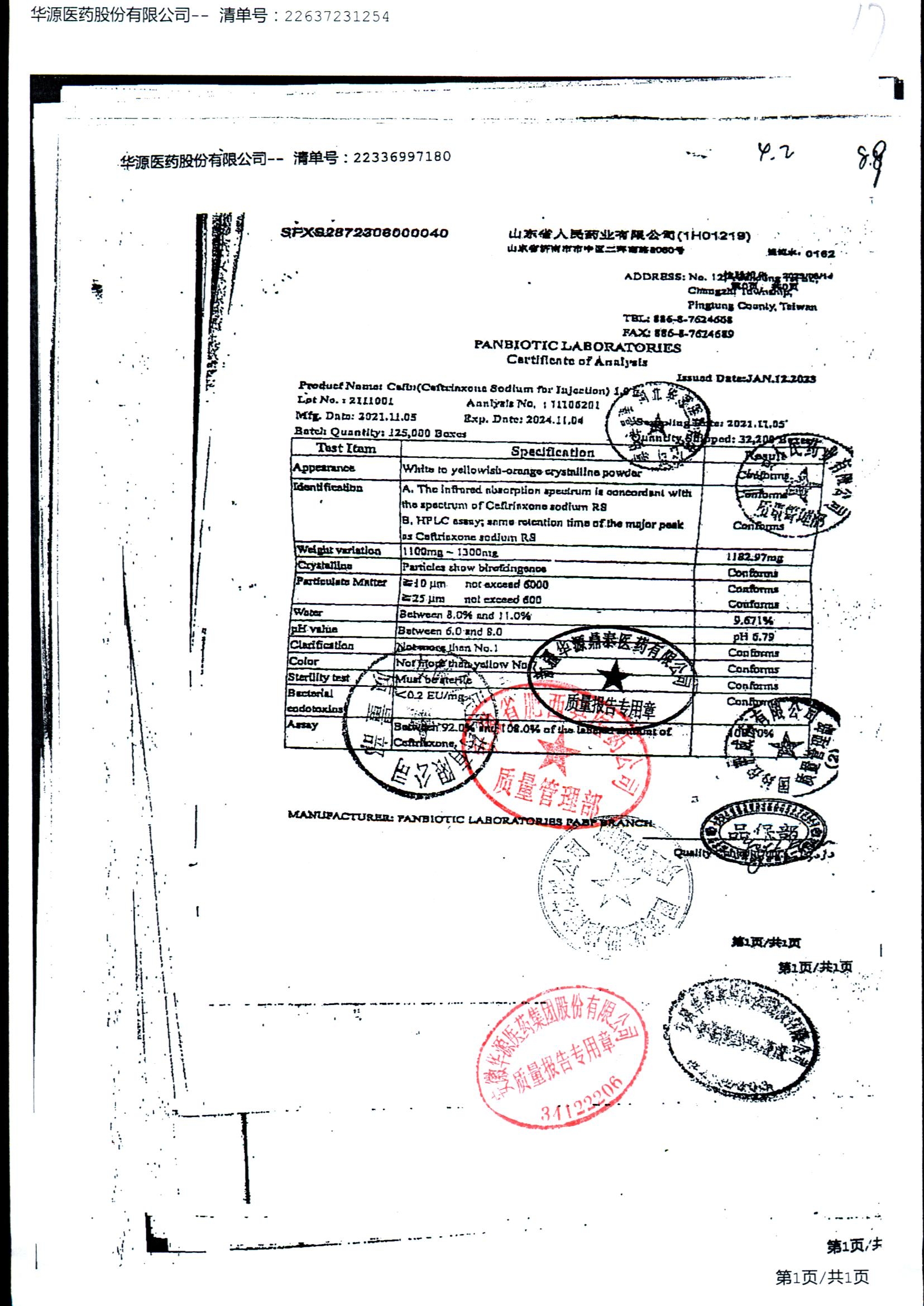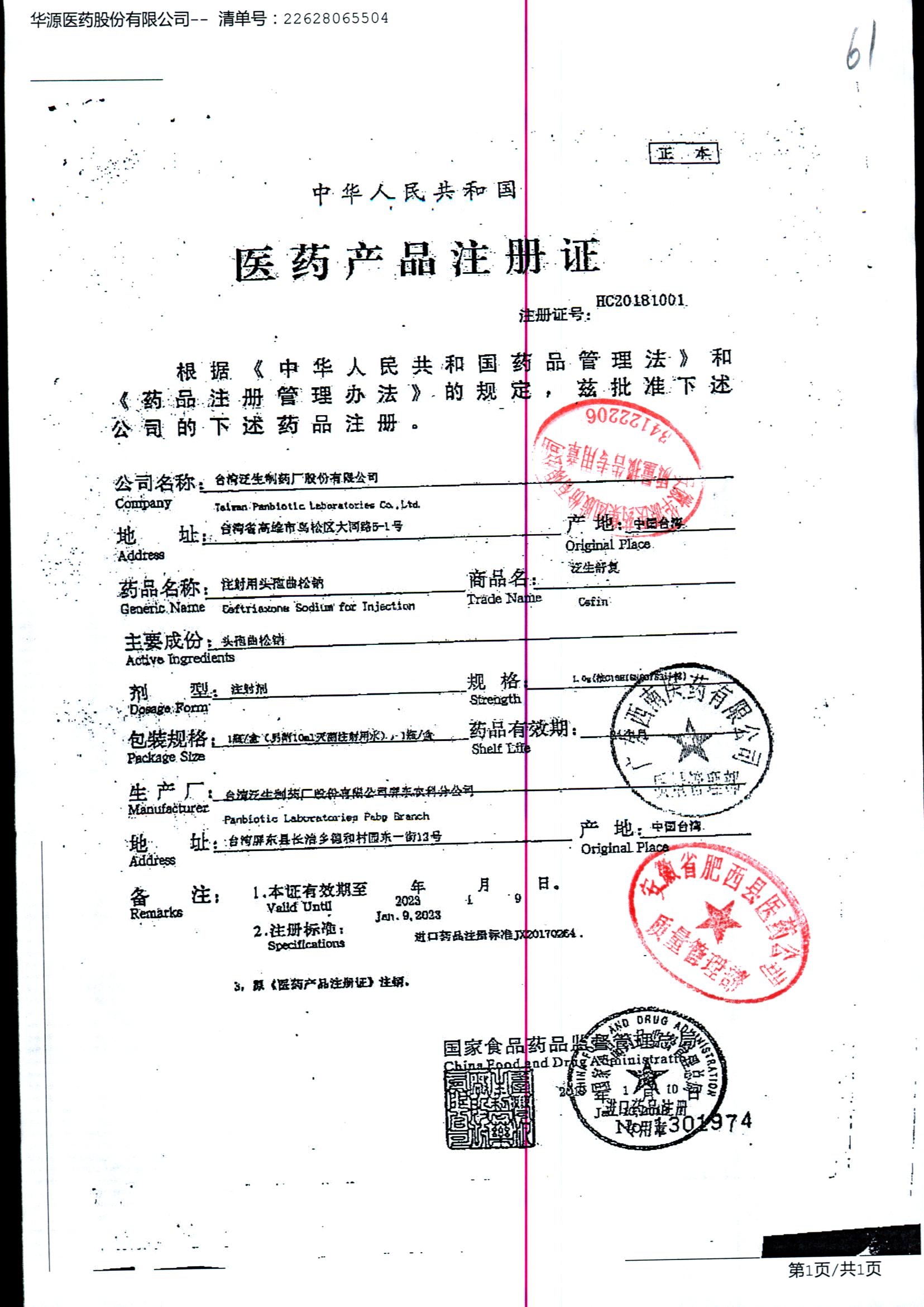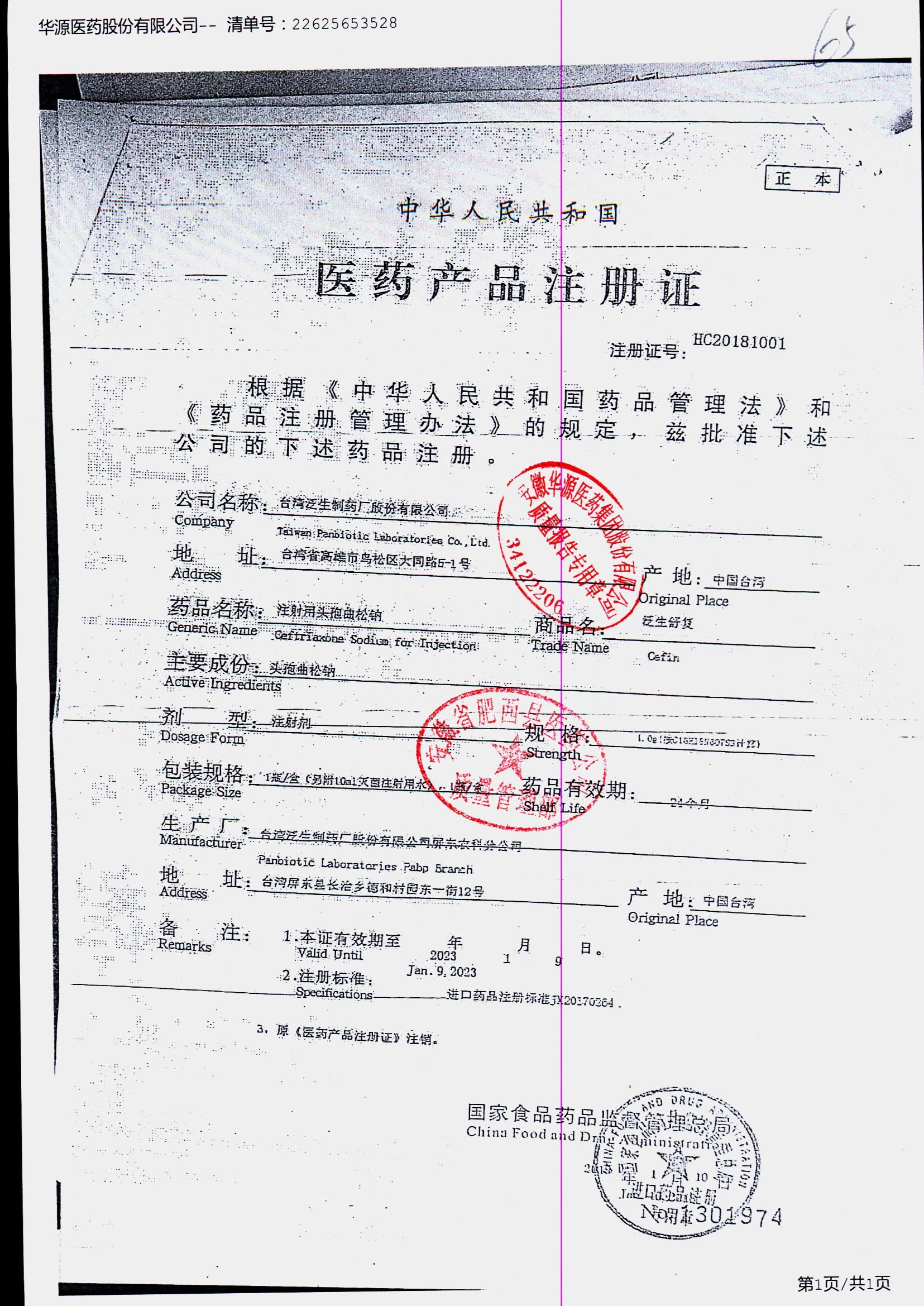 注射用头孢曲松钠 | 1.0g | JN01031B/8 | 查看详情 |