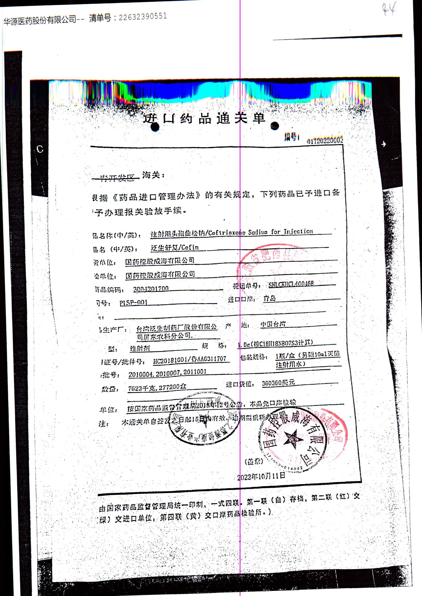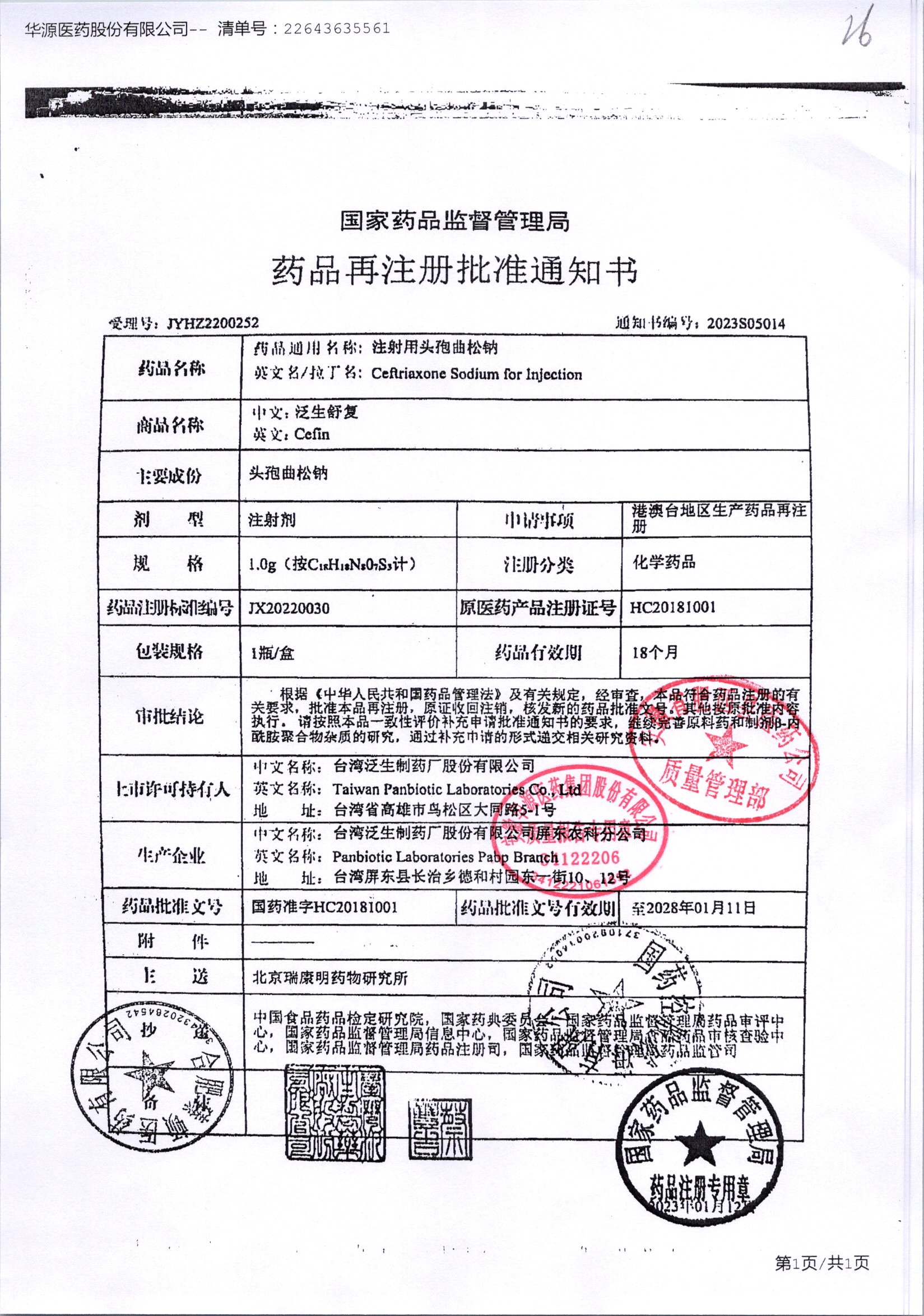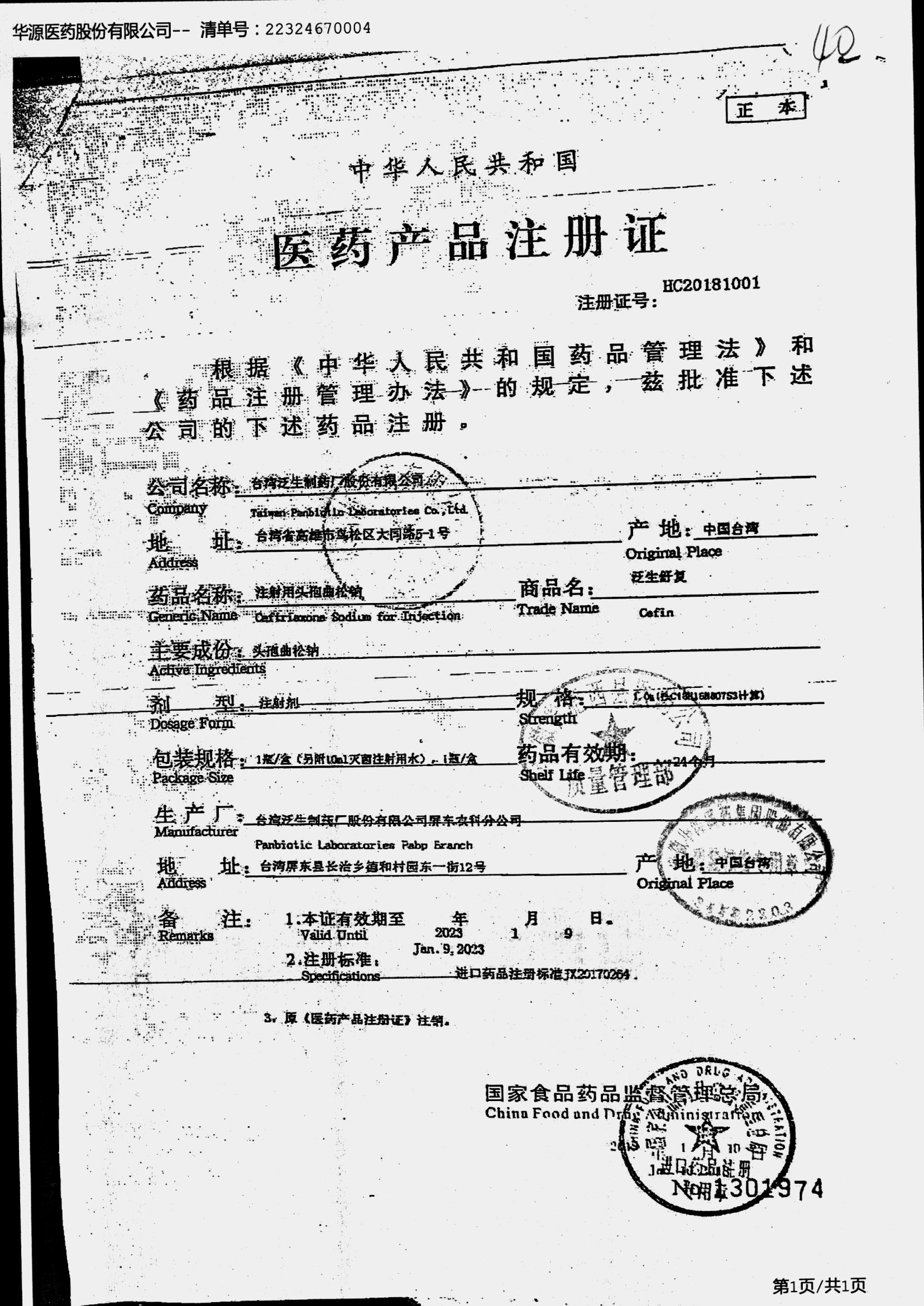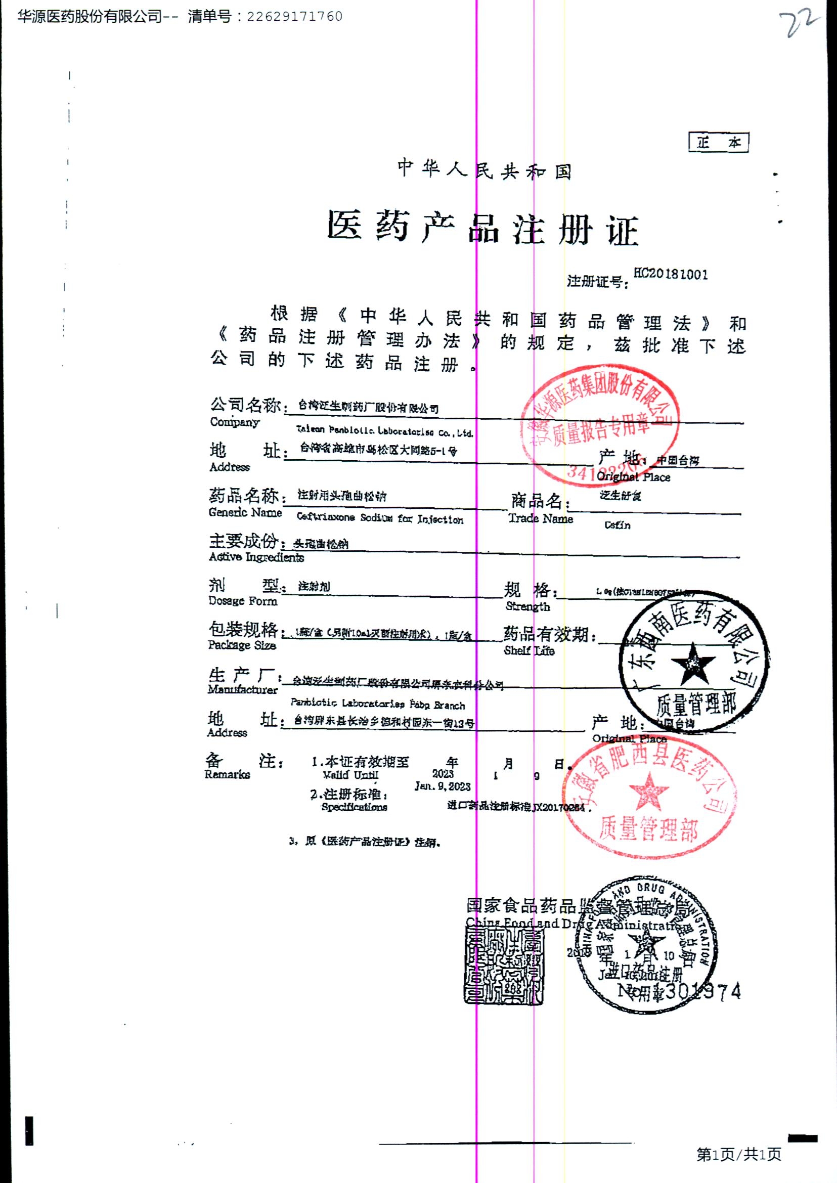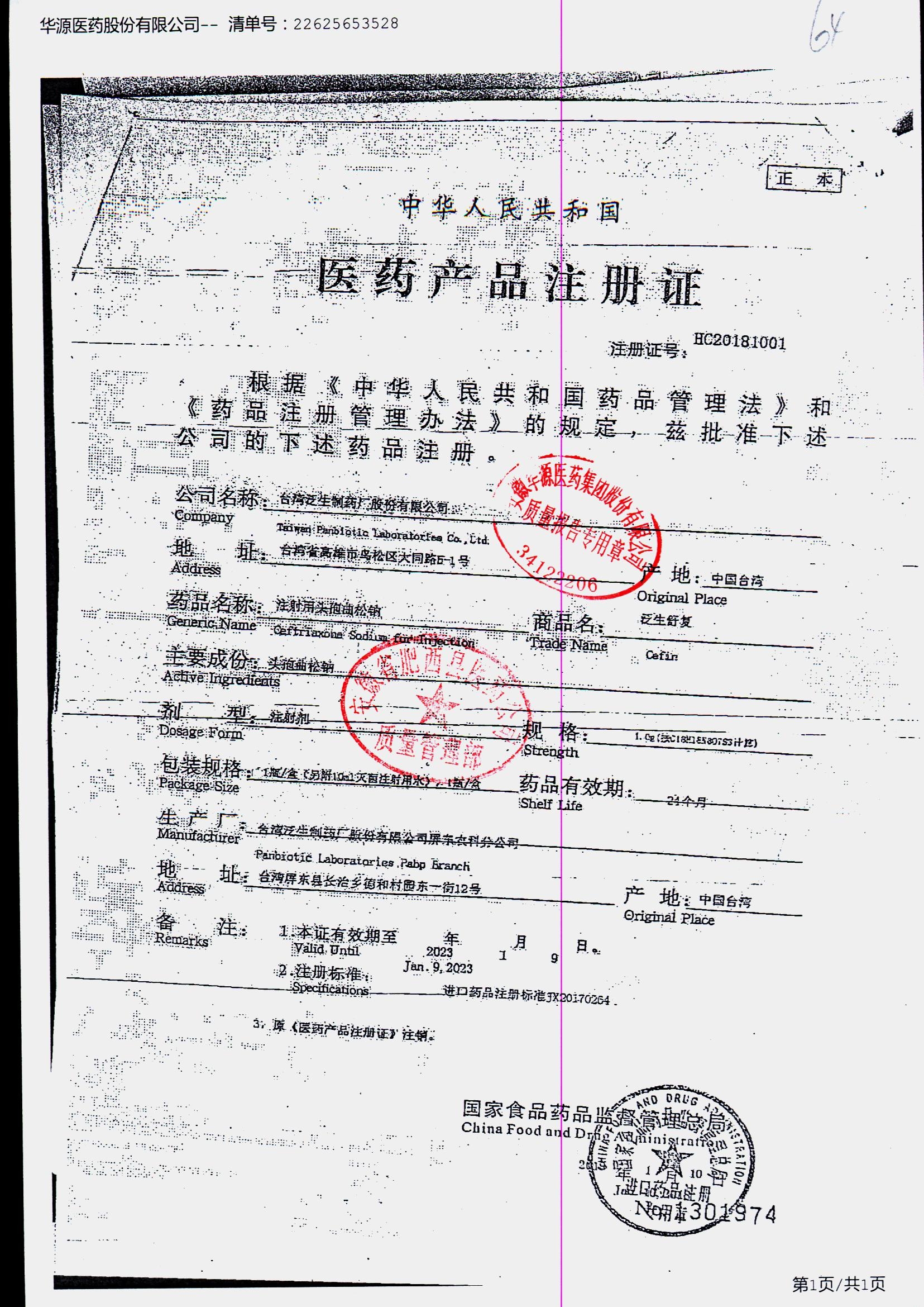 注射用头孢曲松钠 | 1.0g | JN01031B/8 | 查看详情 |