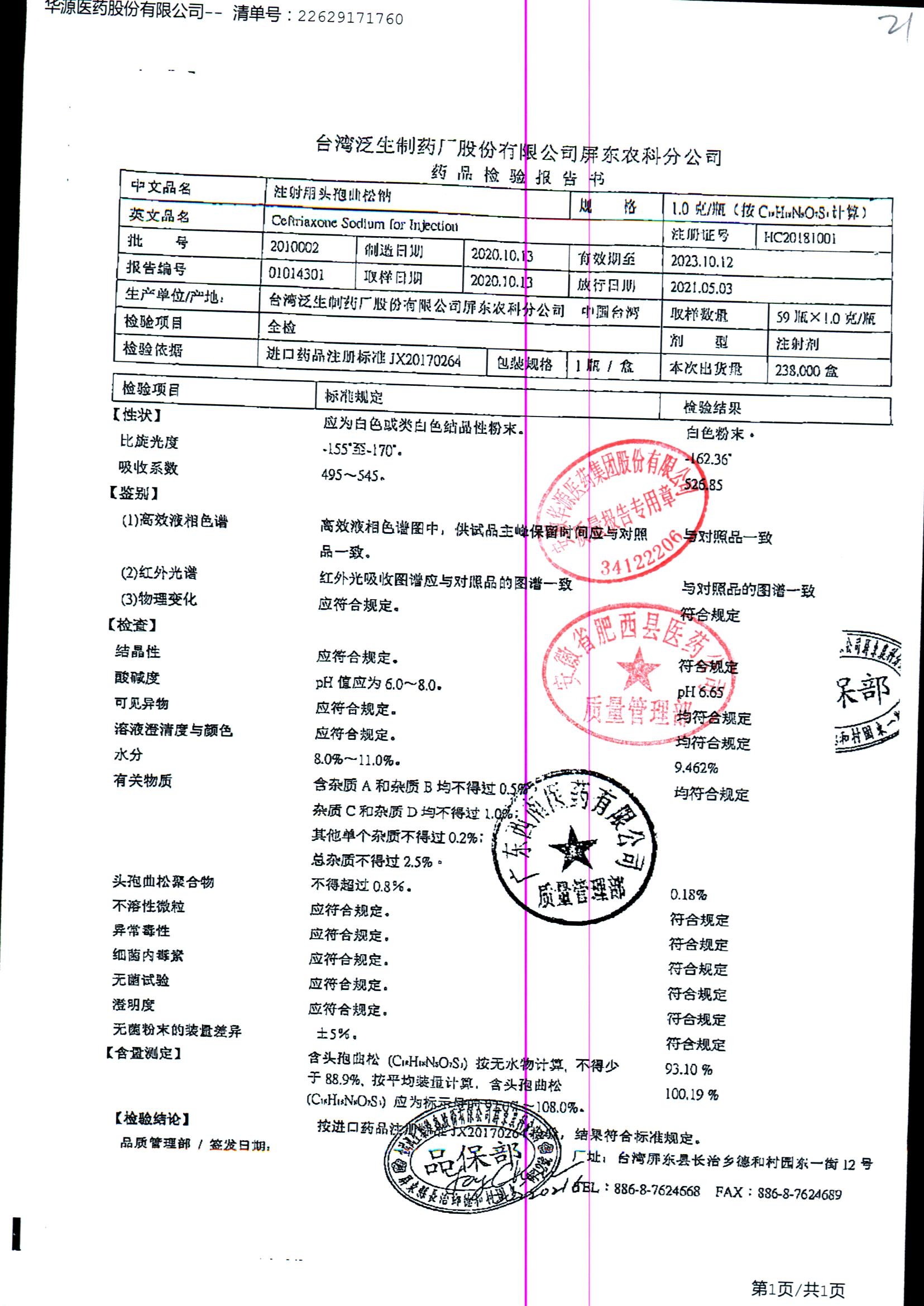 注射用头孢曲松钠 | 1.0g | 2107003/4 | 查看详情 |