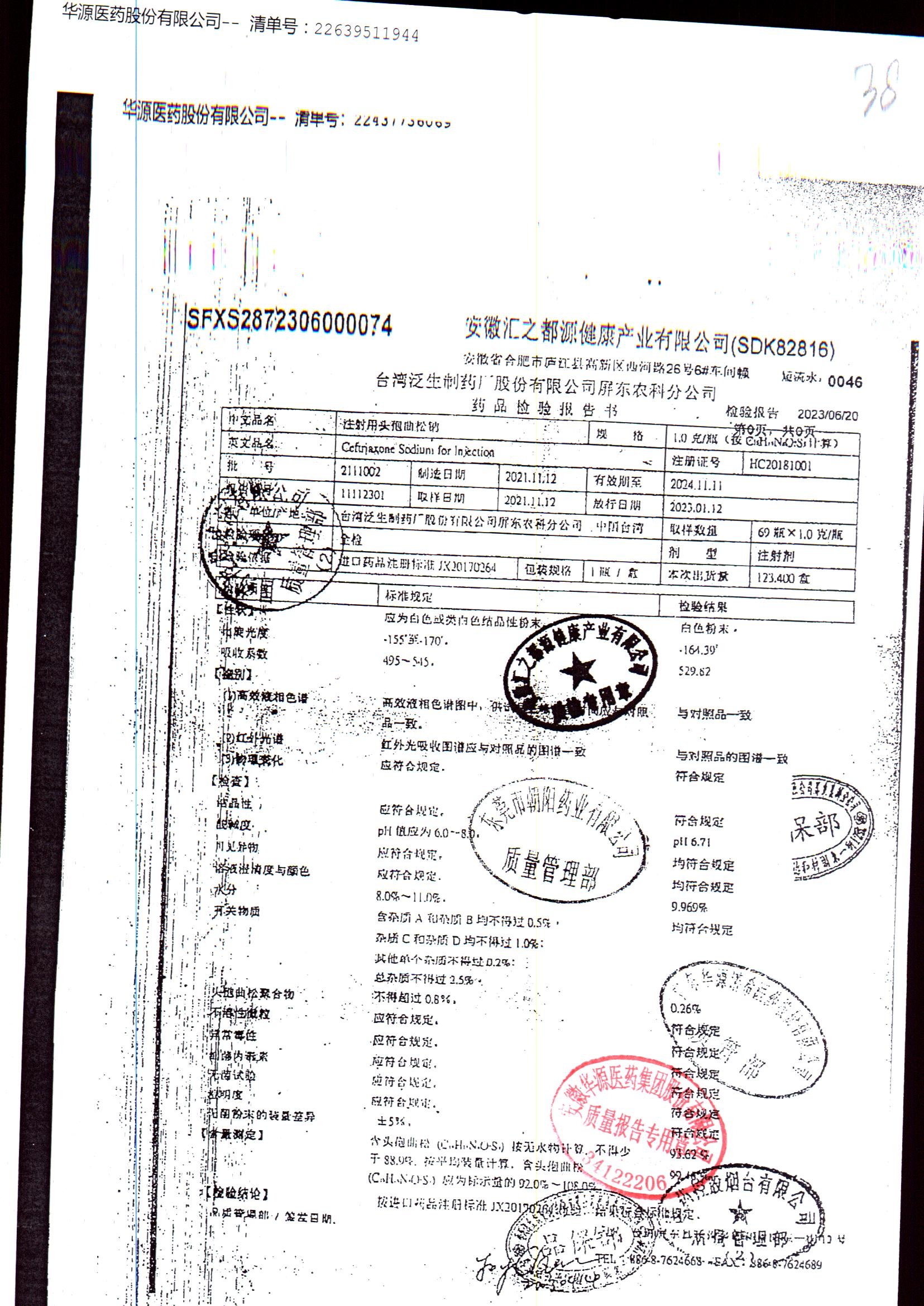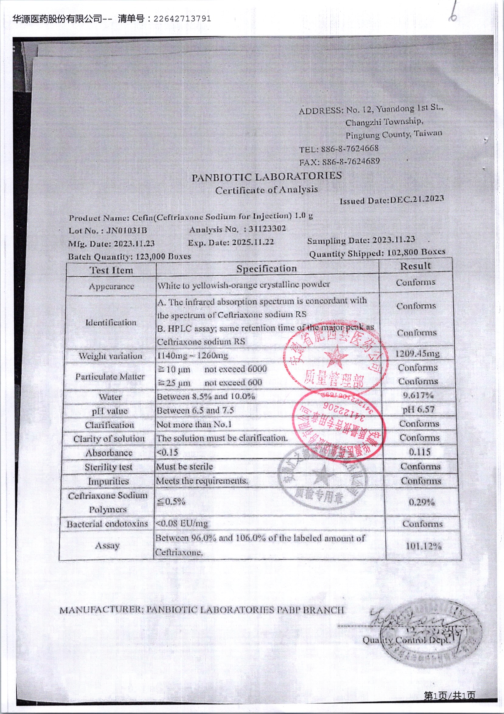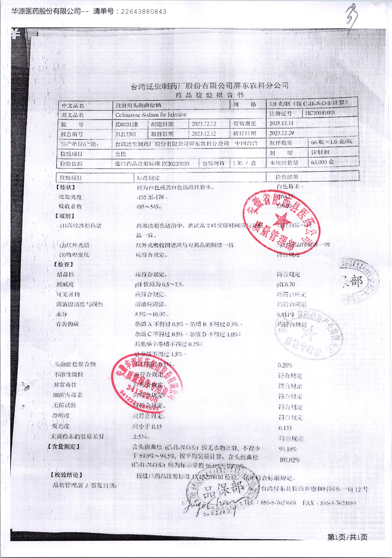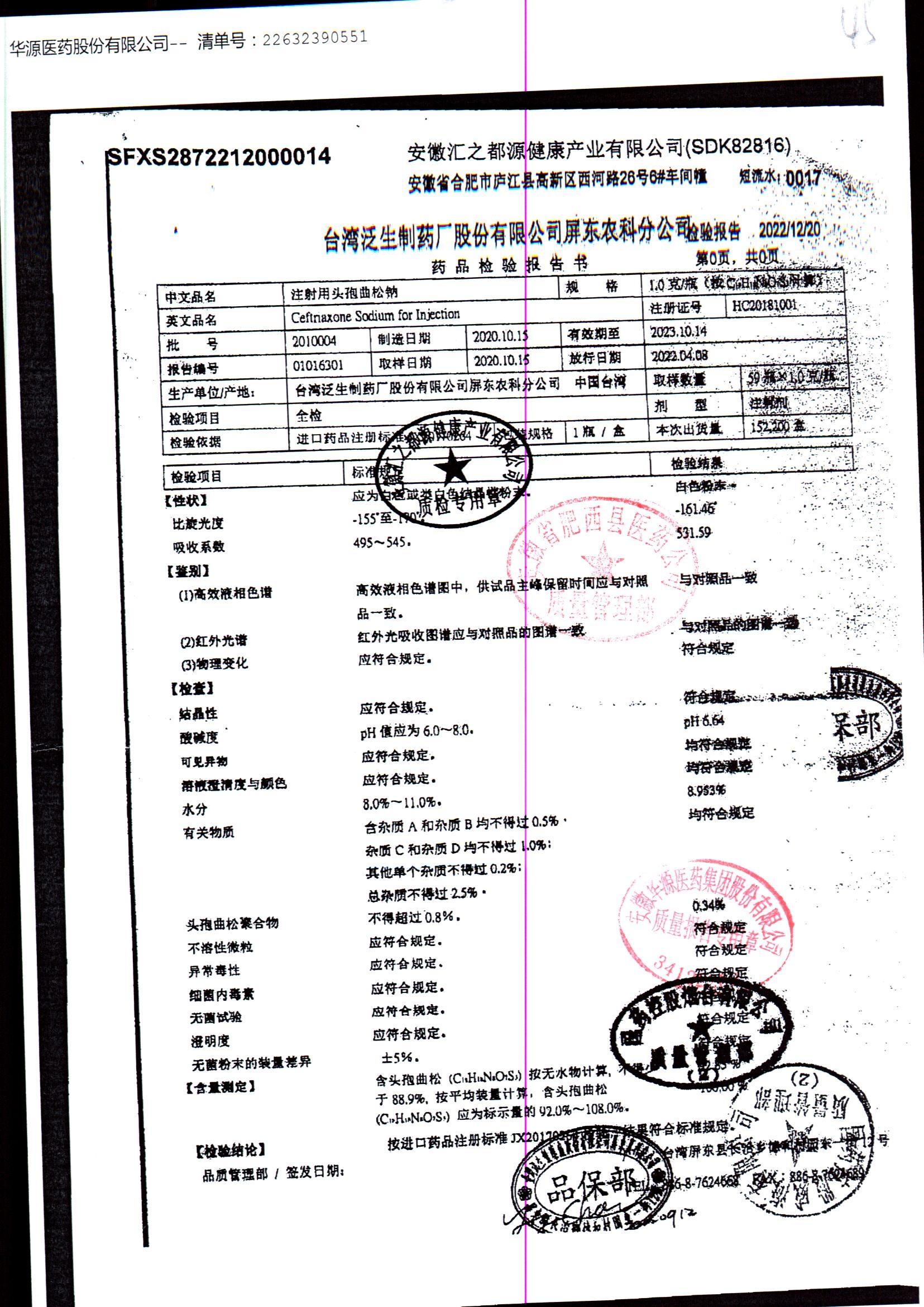 注射用头孢曲松钠 | 1.0g | JN01031B/6 | 查看详情 |