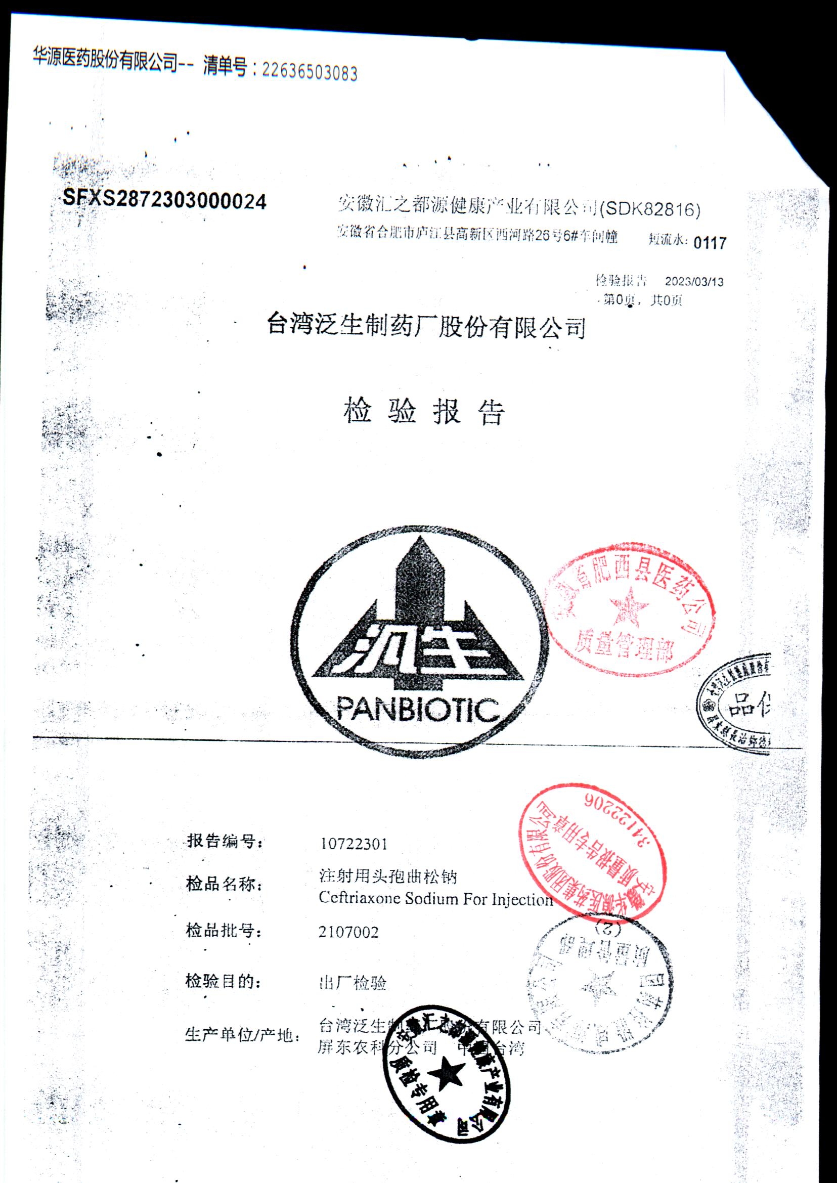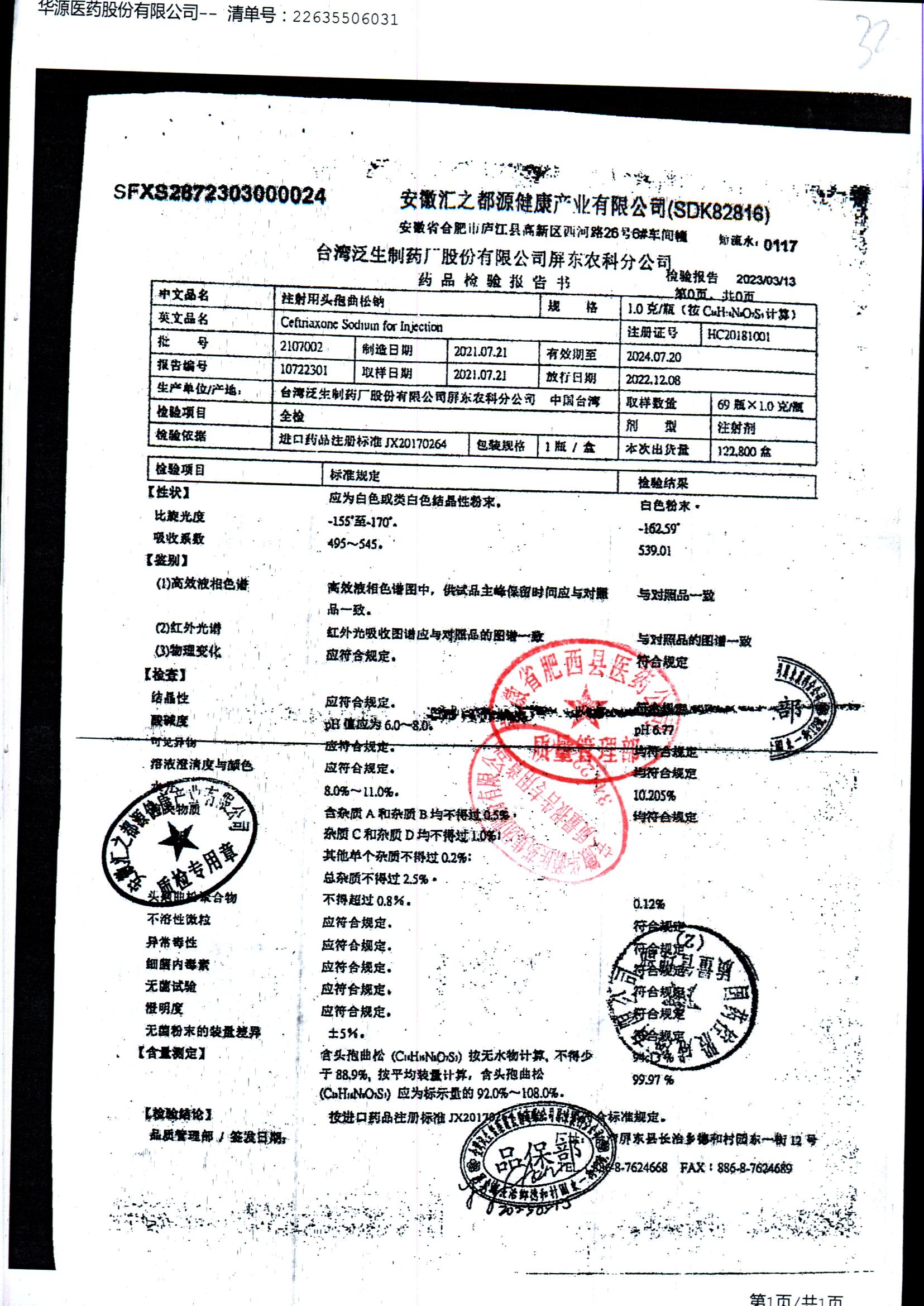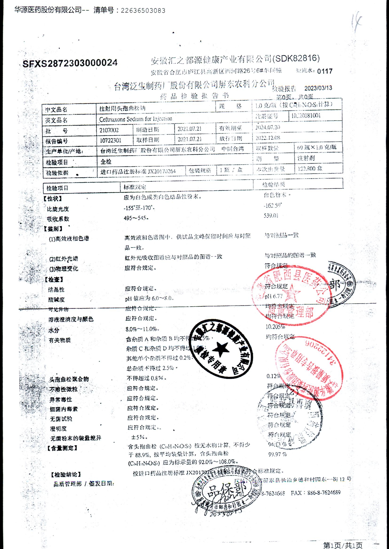 注射用头孢曲松钠 | 1.0g | 2107002/2 | 查看详情 |