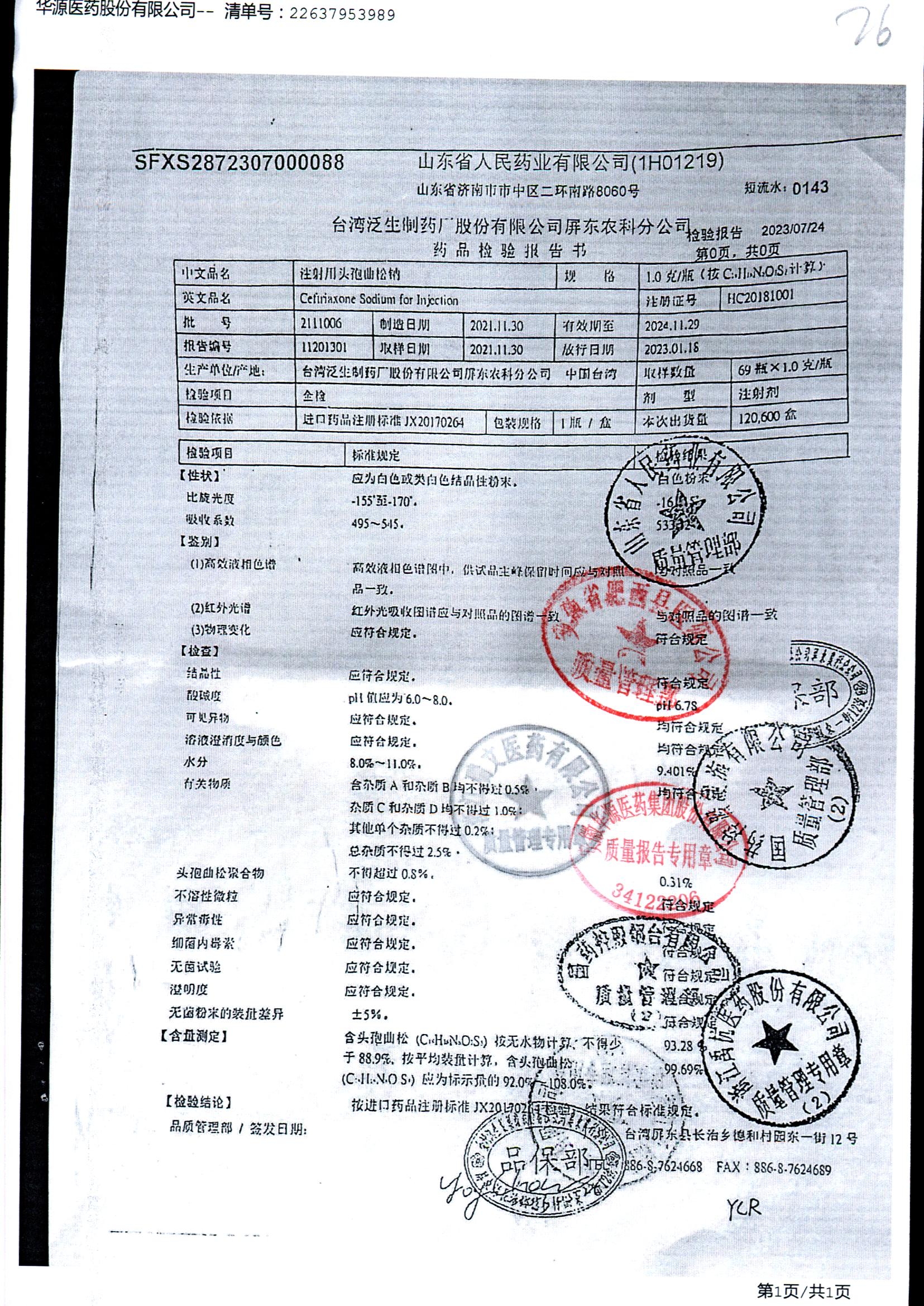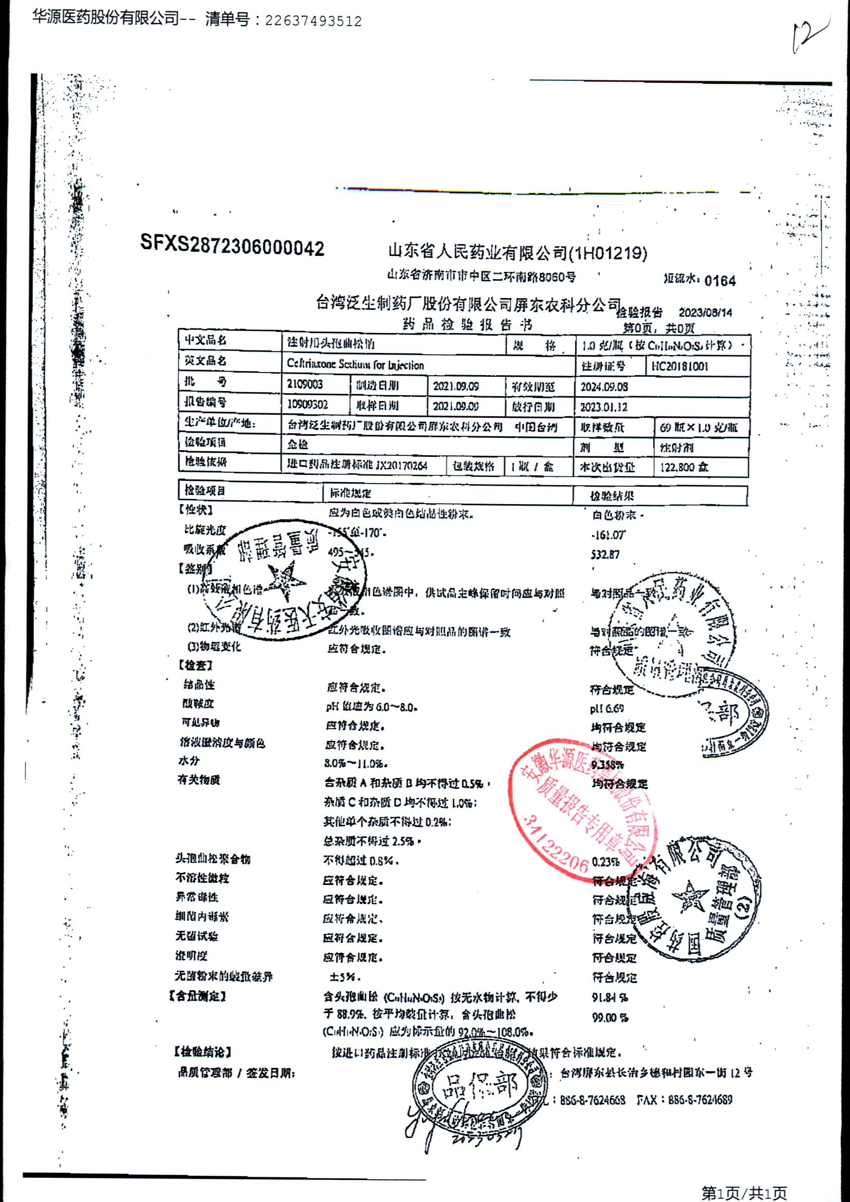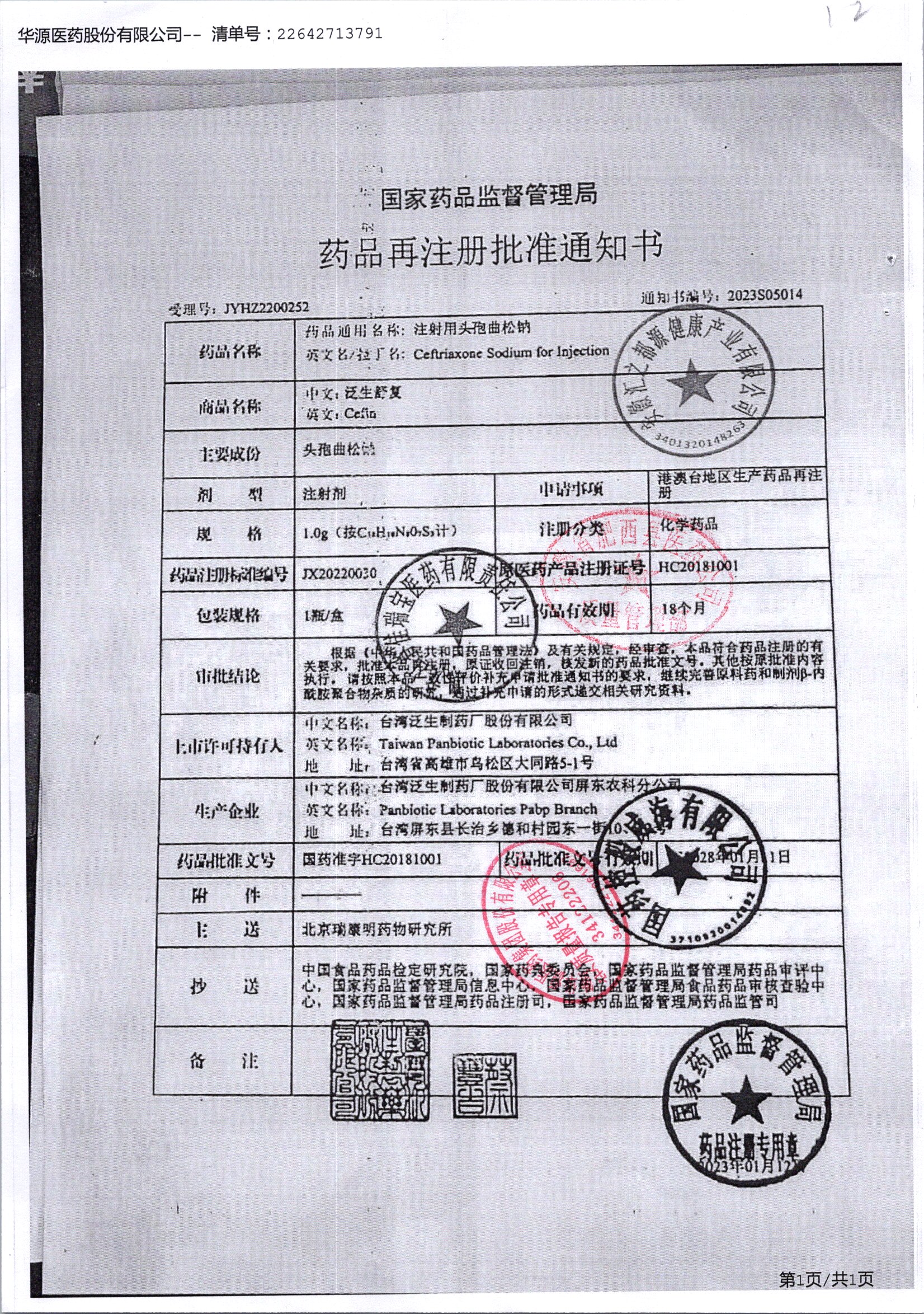 注射用头孢曲松钠 | 1.0g | JD01011B/4 | 查看详情 |