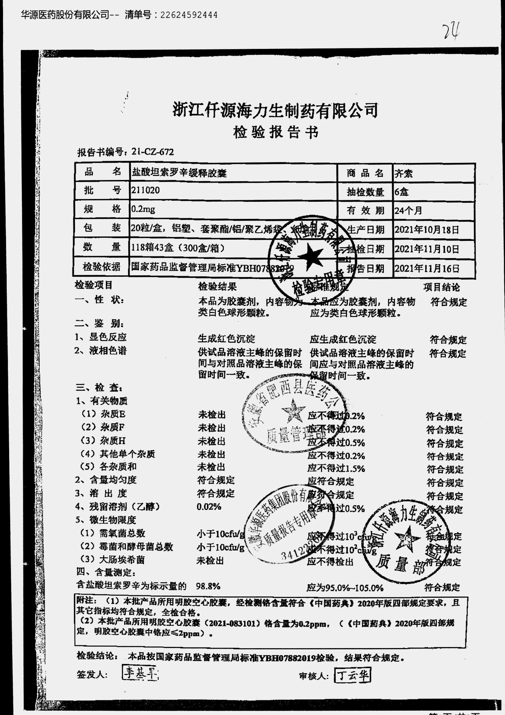 盐酸坦索罗辛缓释胶囊 | 0.2g*20l粒 | 211020 | 查看详情 |