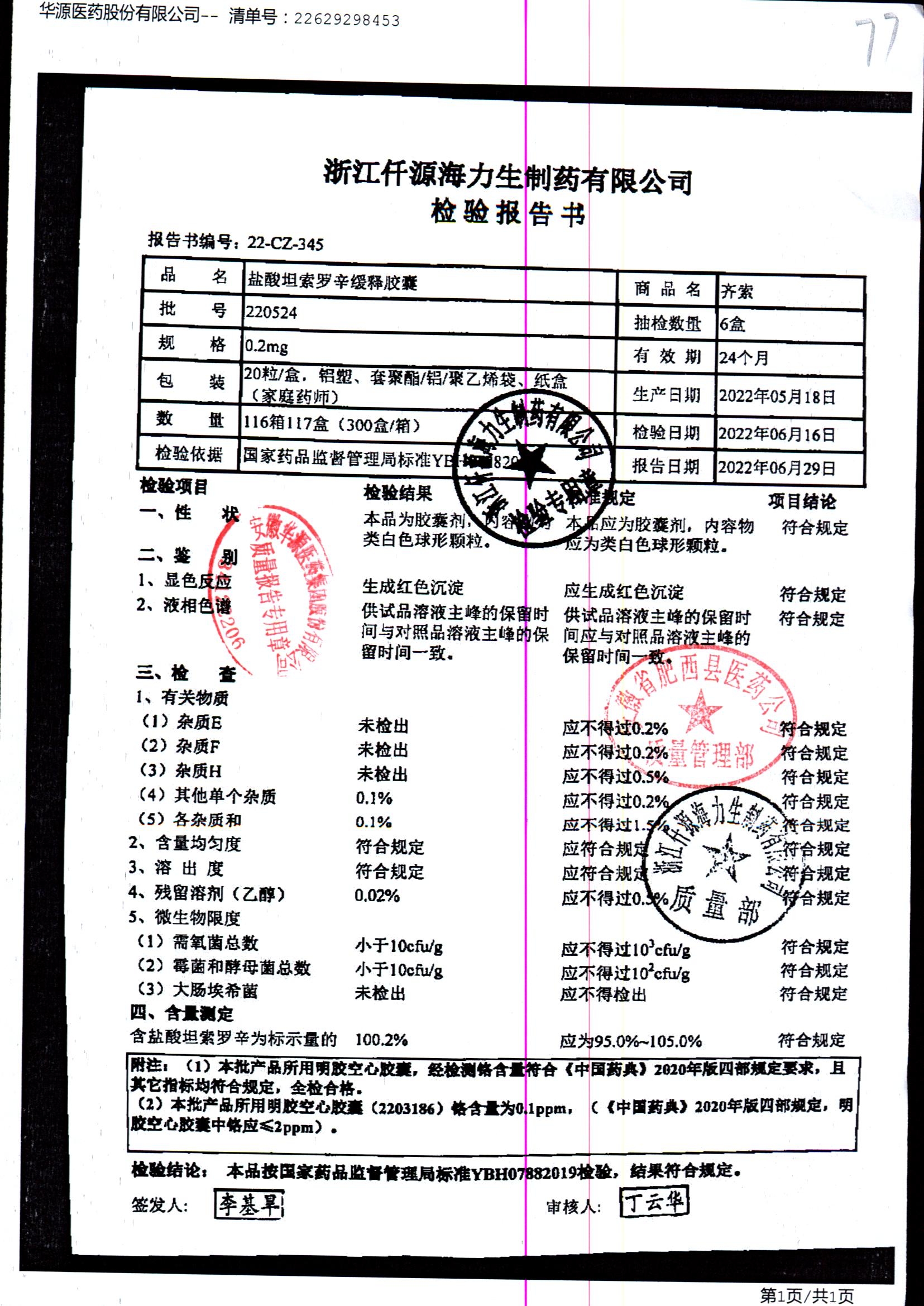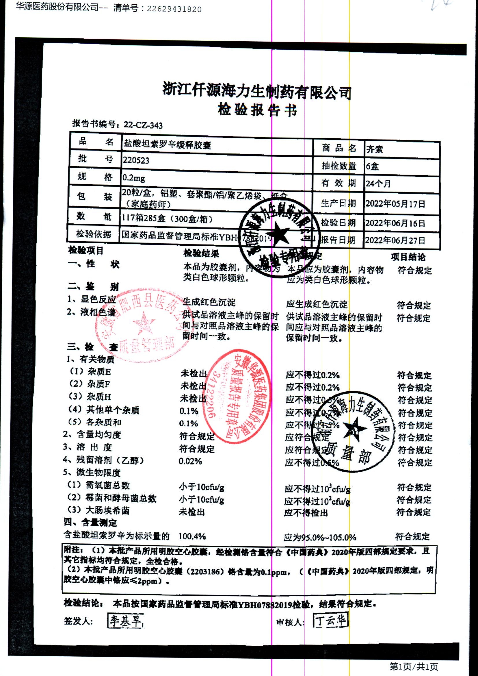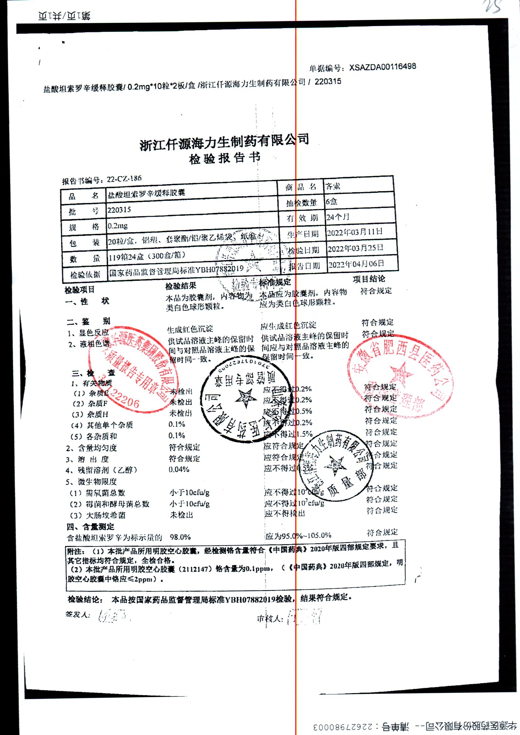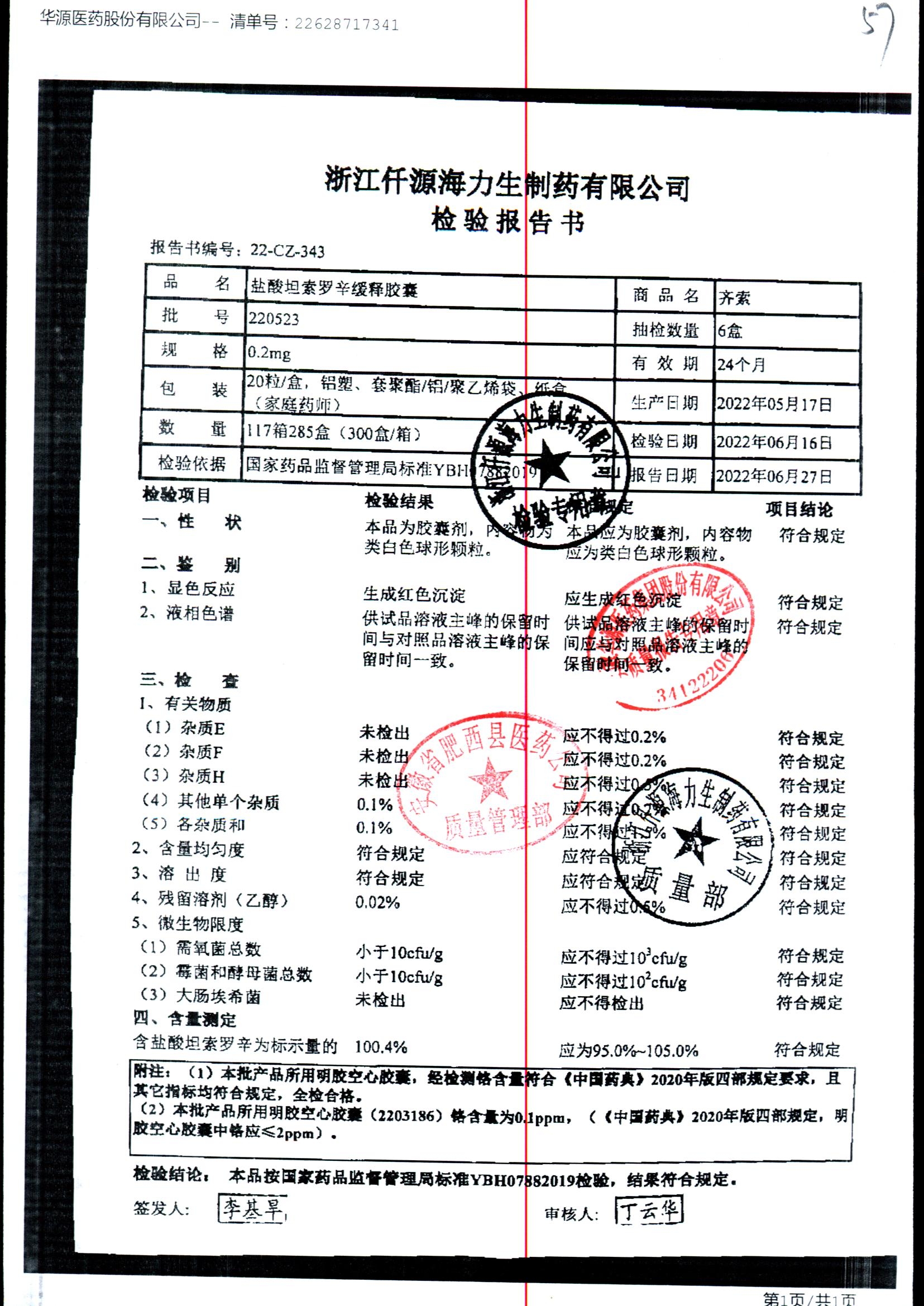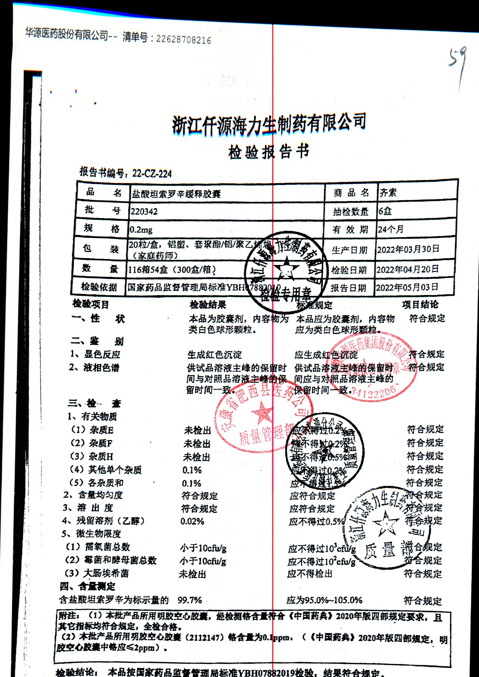 盐酸坦索罗辛缓释胶囊 | 0.2g*20l粒 | 220523 | 查看详情 |