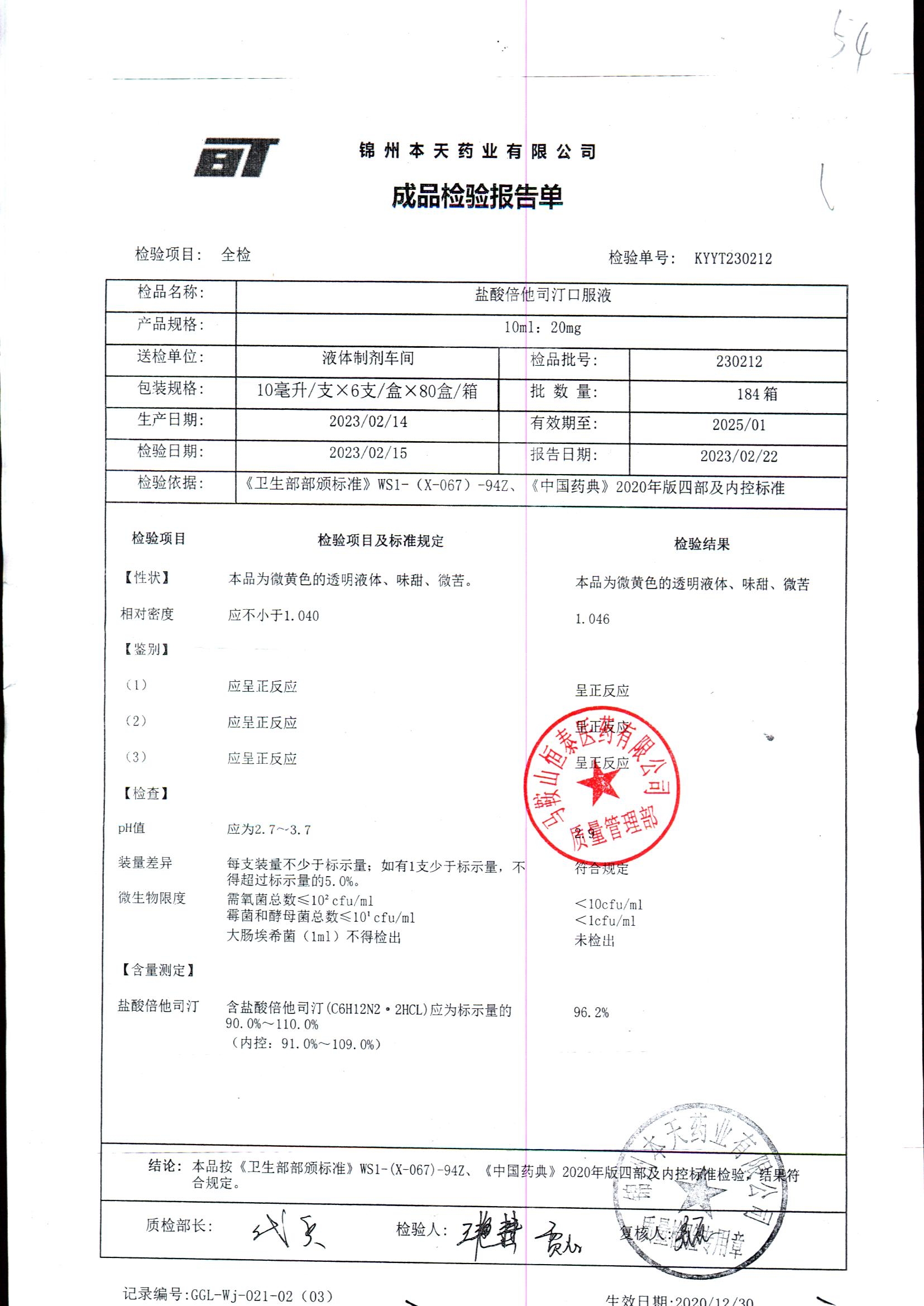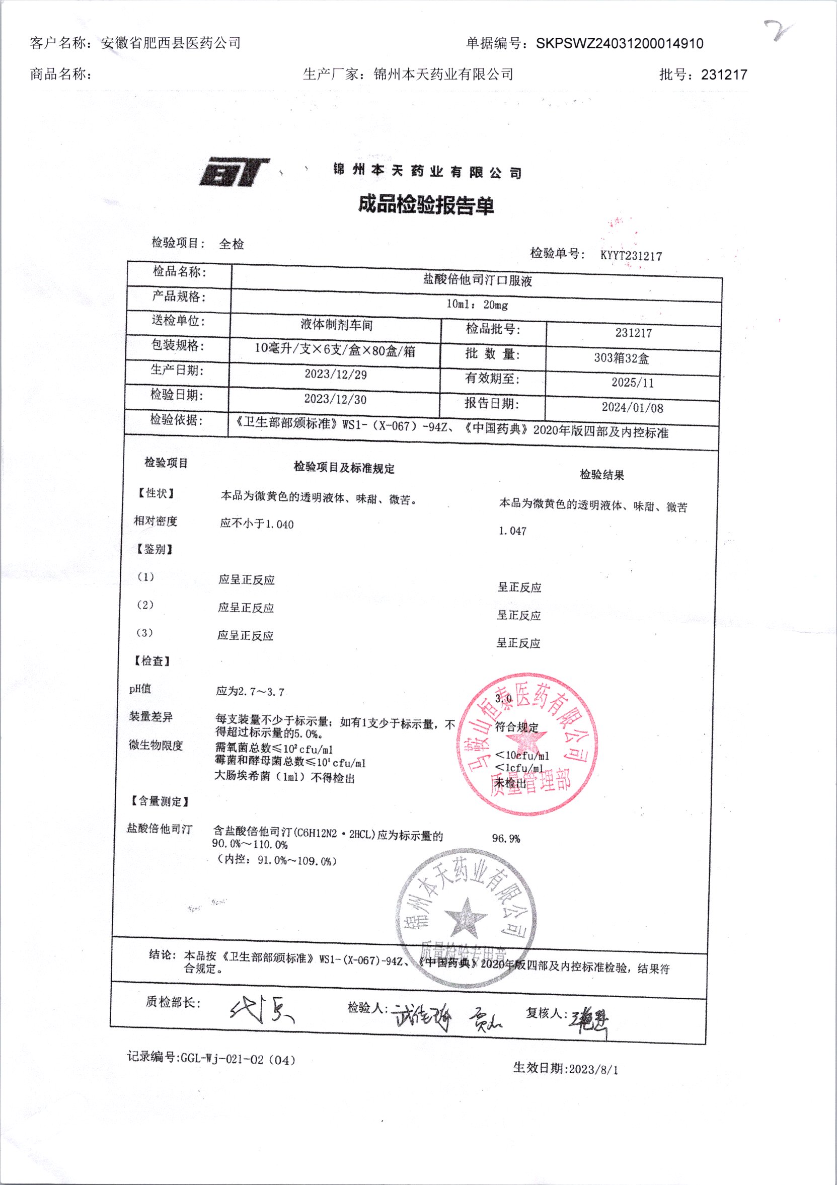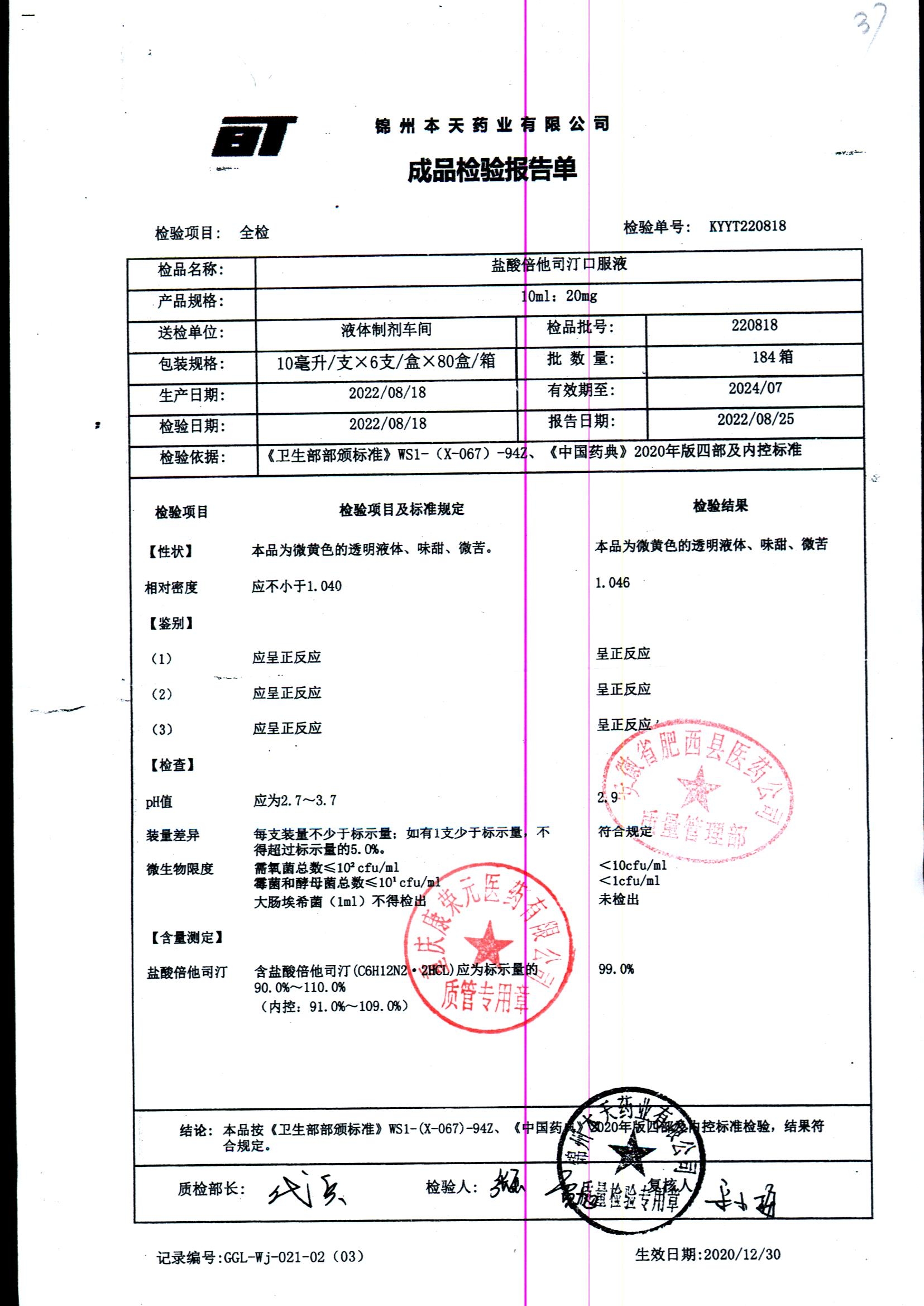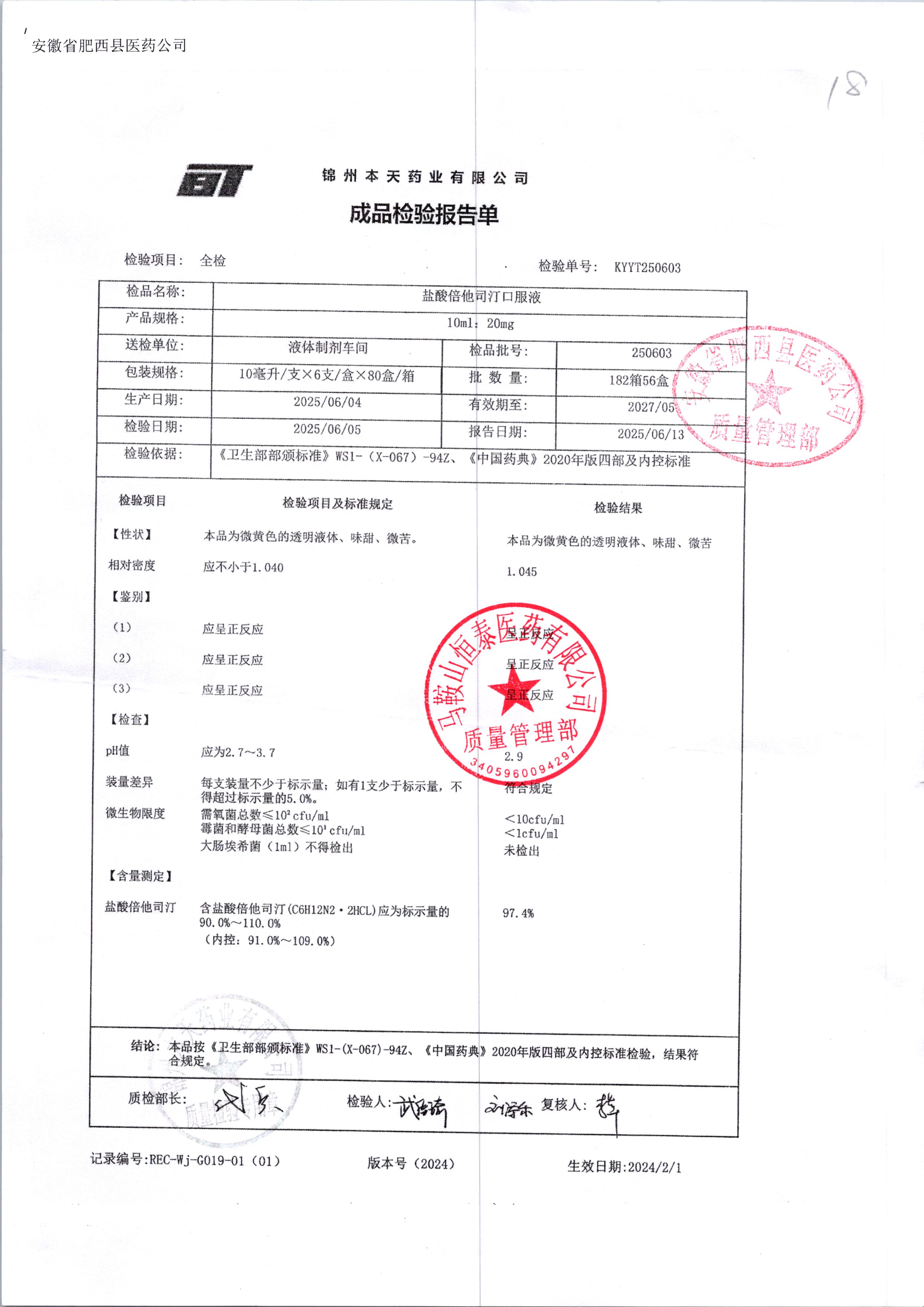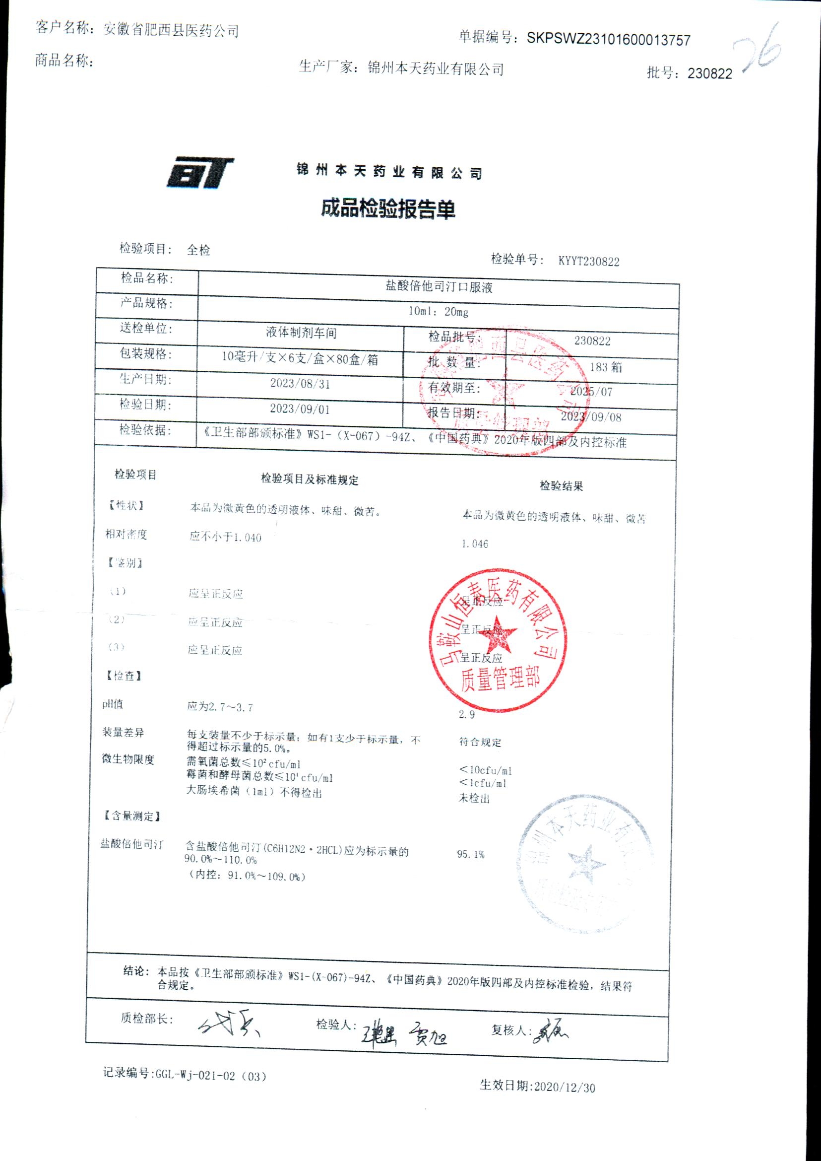 盐酸倍他司汀口服液 | 10ml:20g*6支 | 220818 | 查看详情 |