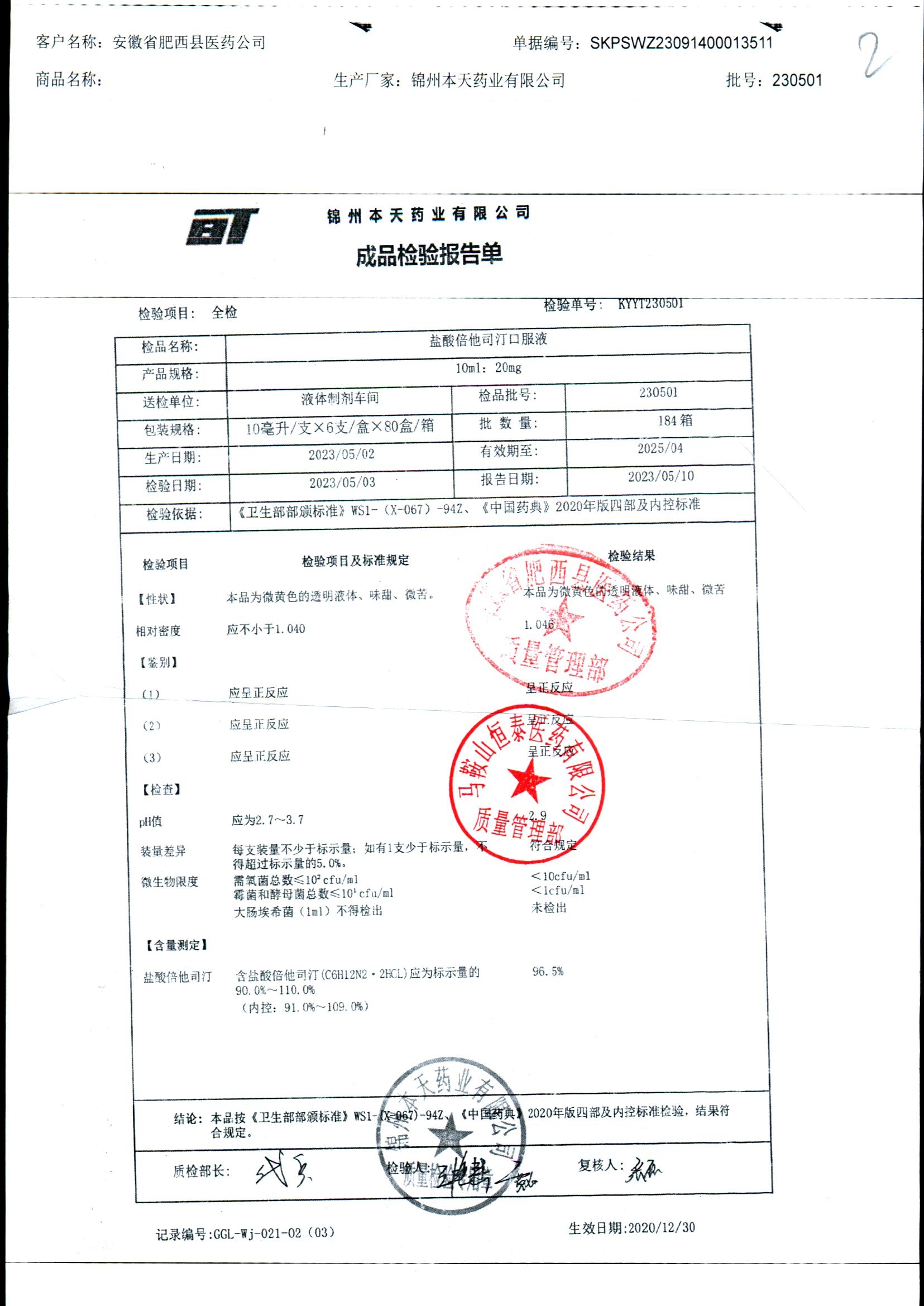 盐酸倍他司汀口服液 | 10ml:20g*6支 | 230501 | 查看详情 |