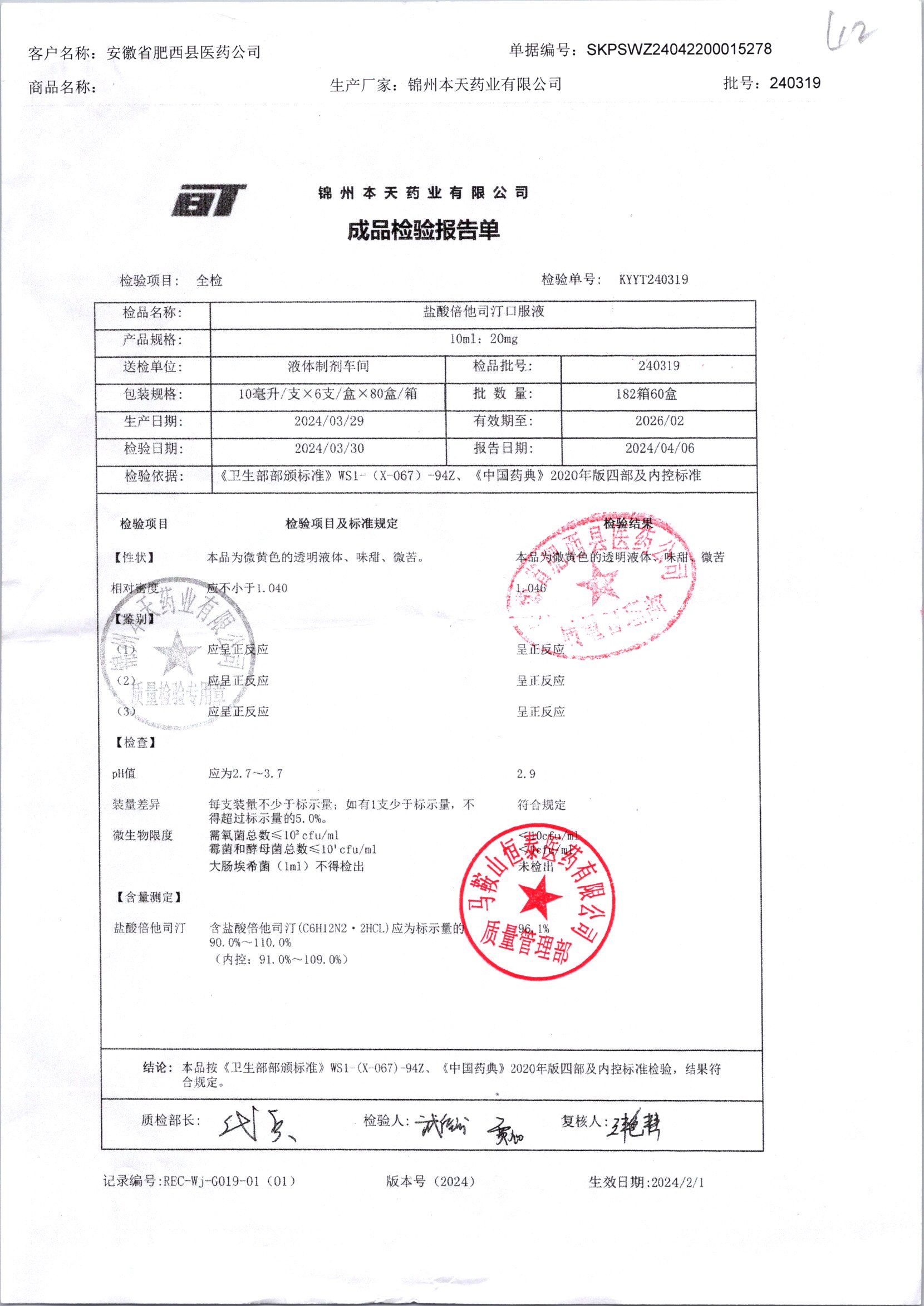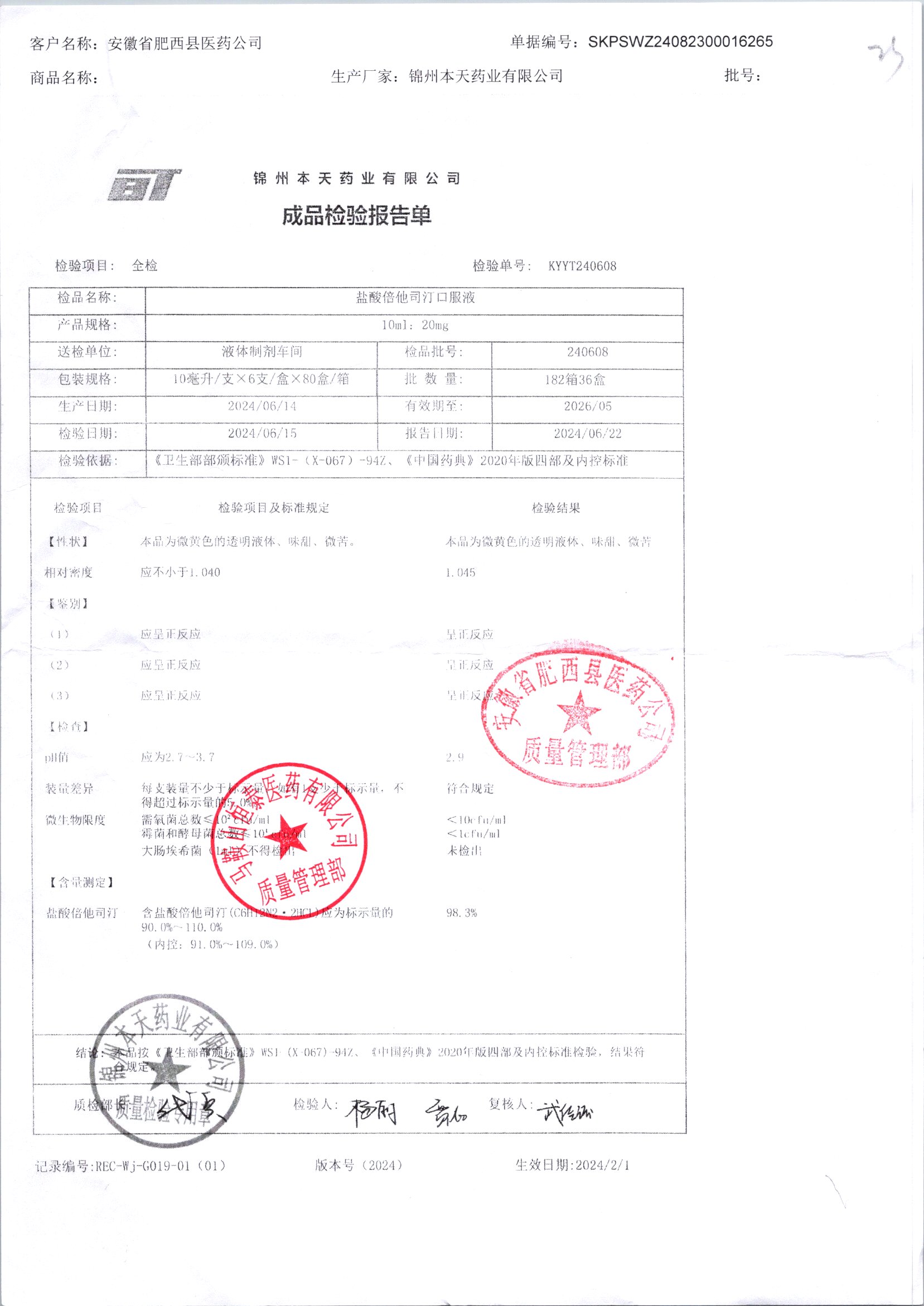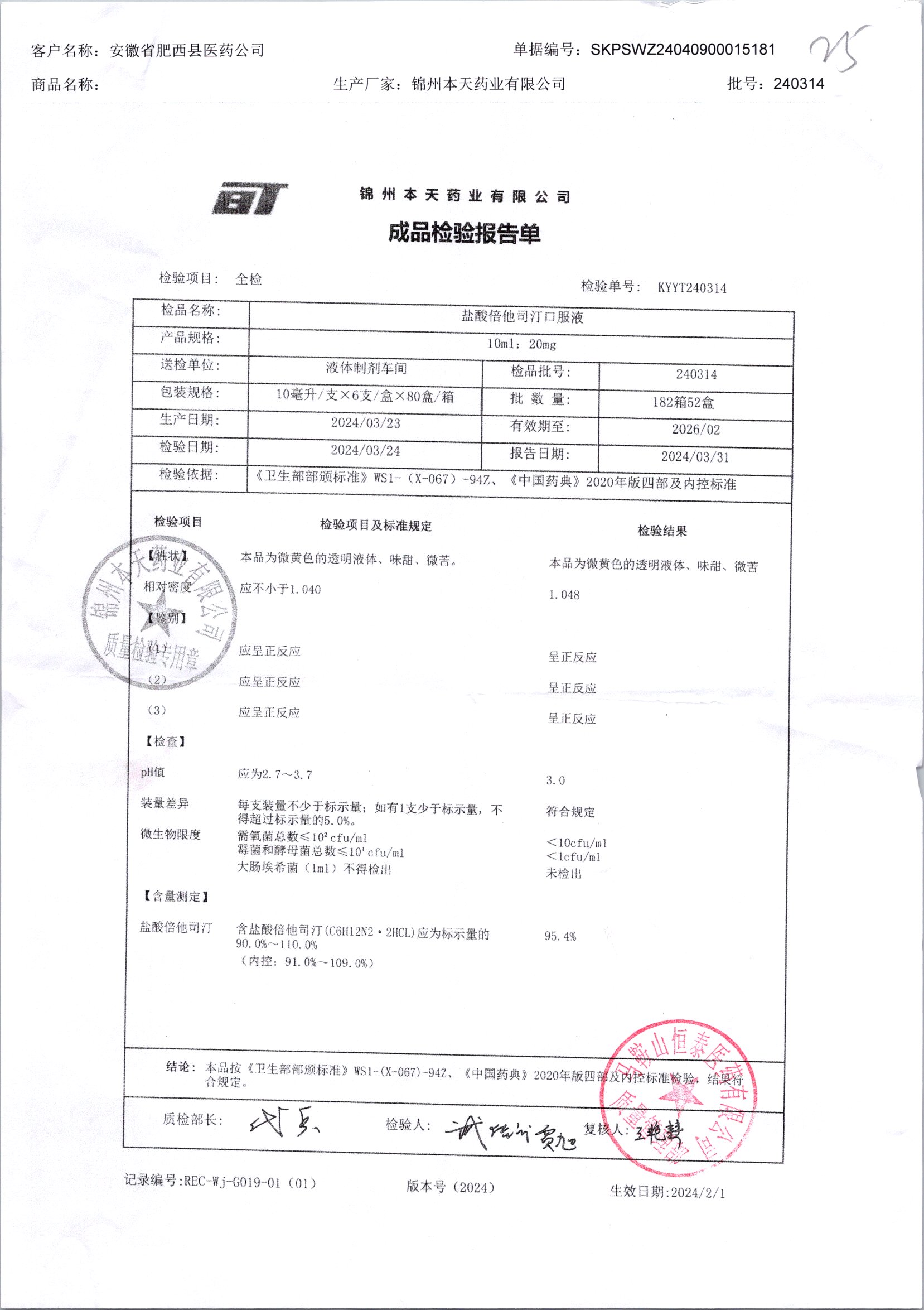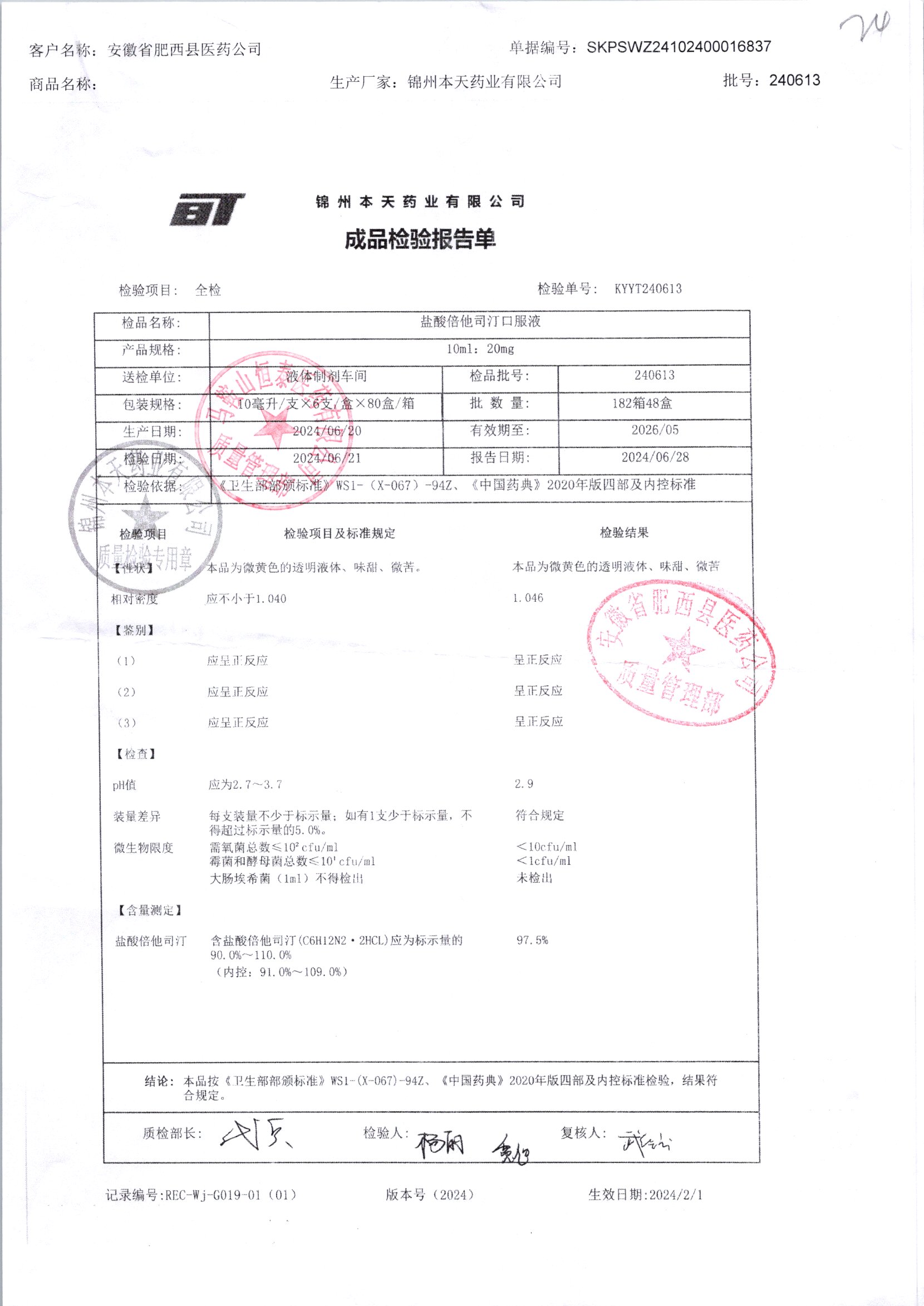 盐酸倍他司汀口服液 | 10ml:20g*6支 | 240613 | 查看详情 |