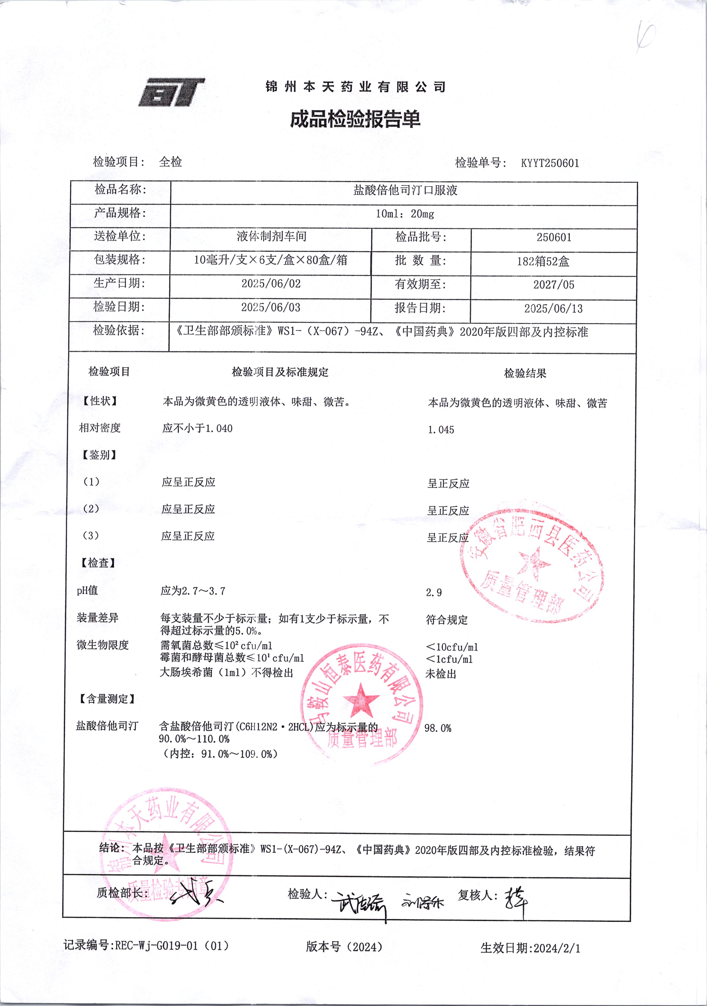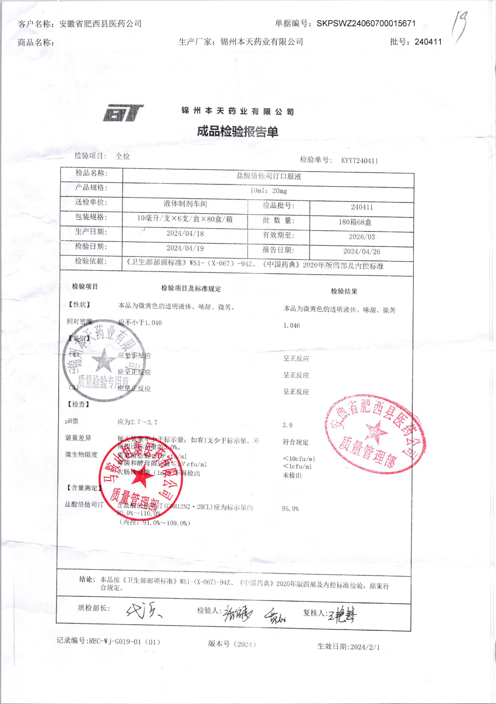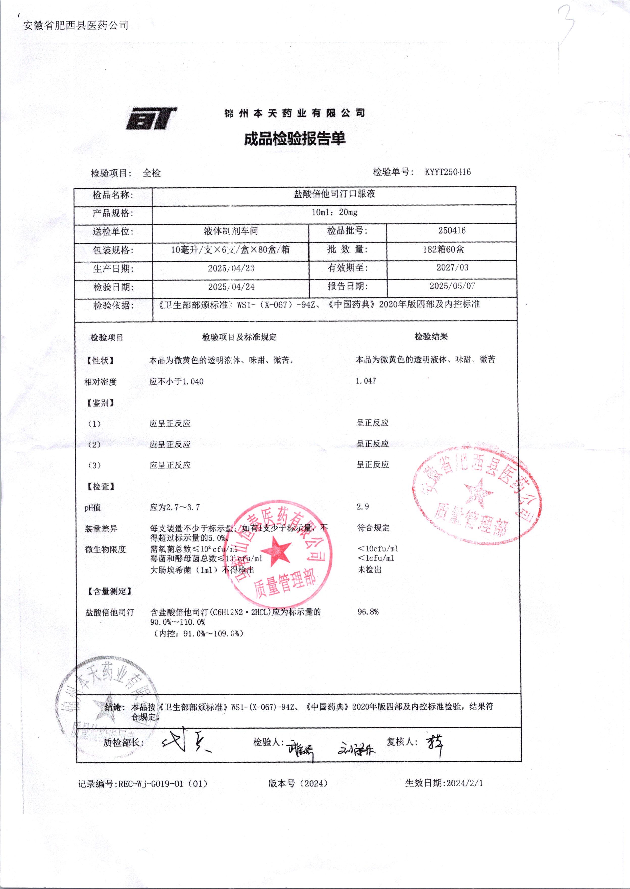盐酸倍他司汀口服液 | 10ml:20g*6支 | 240613 | 查看详情 |