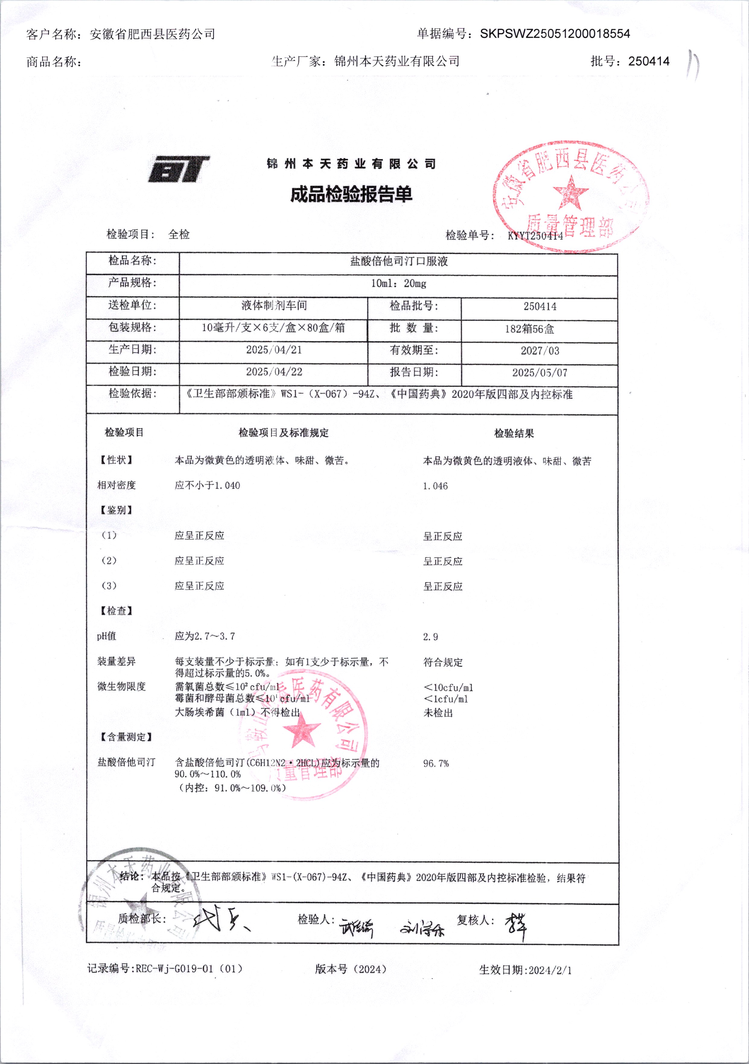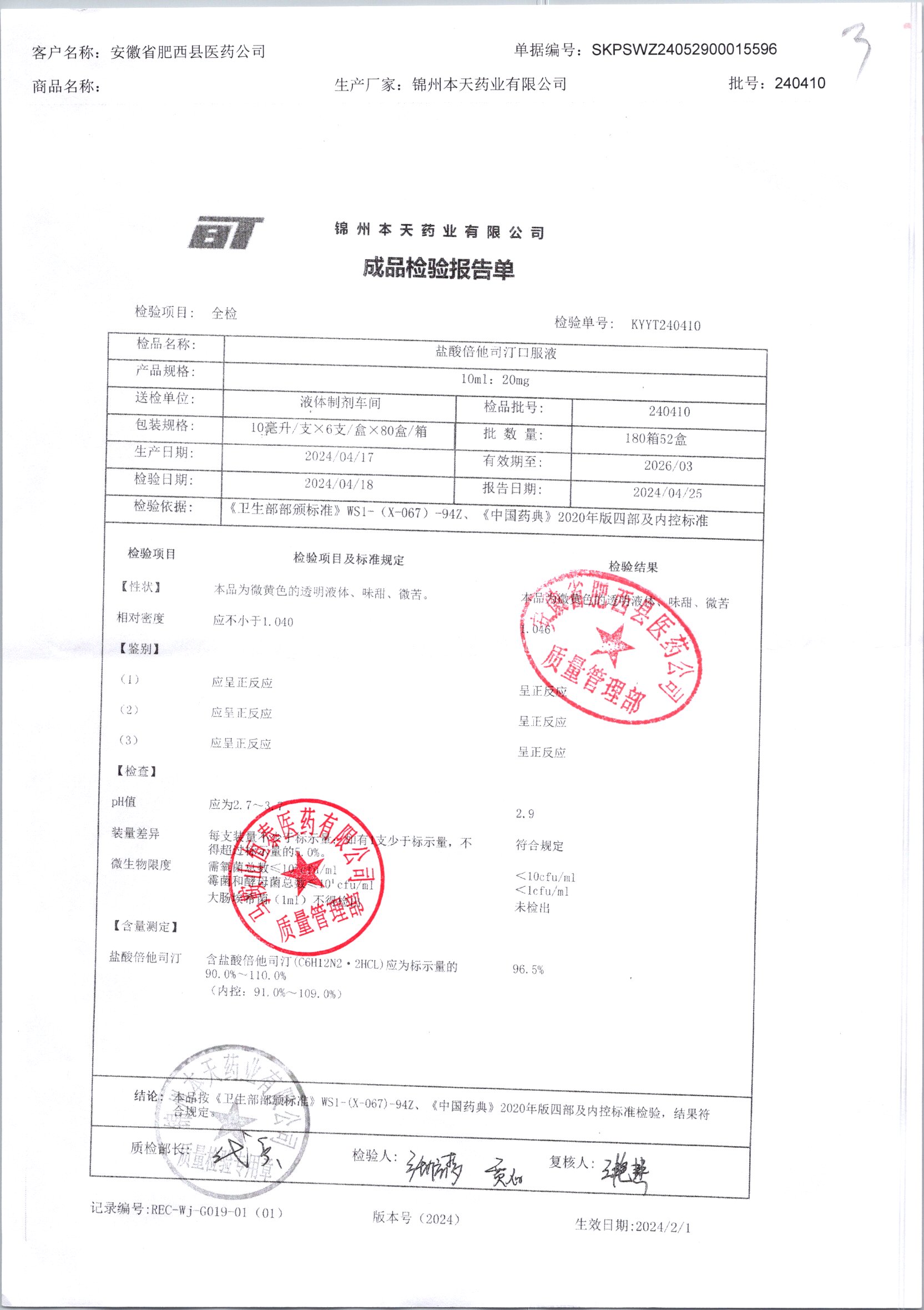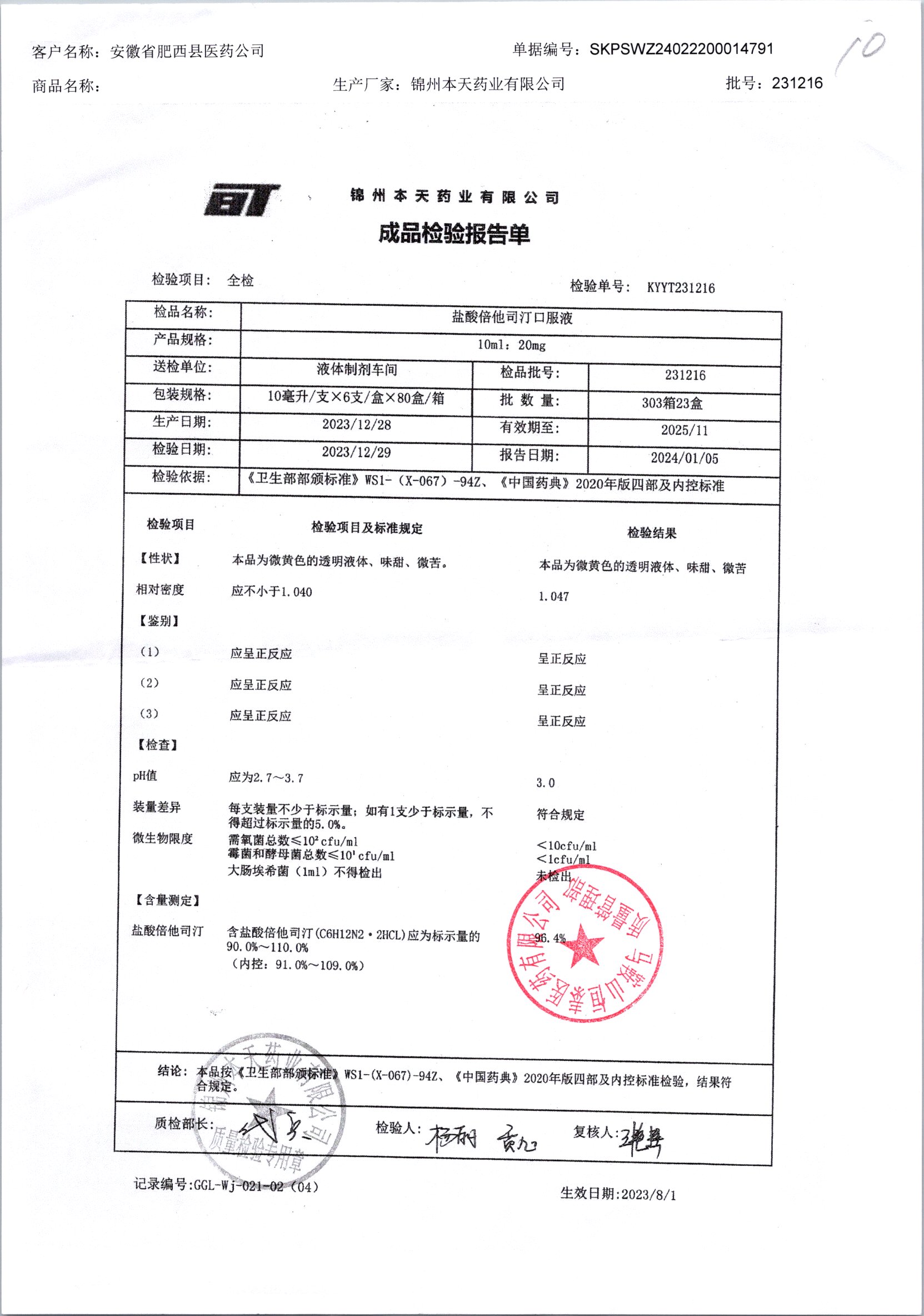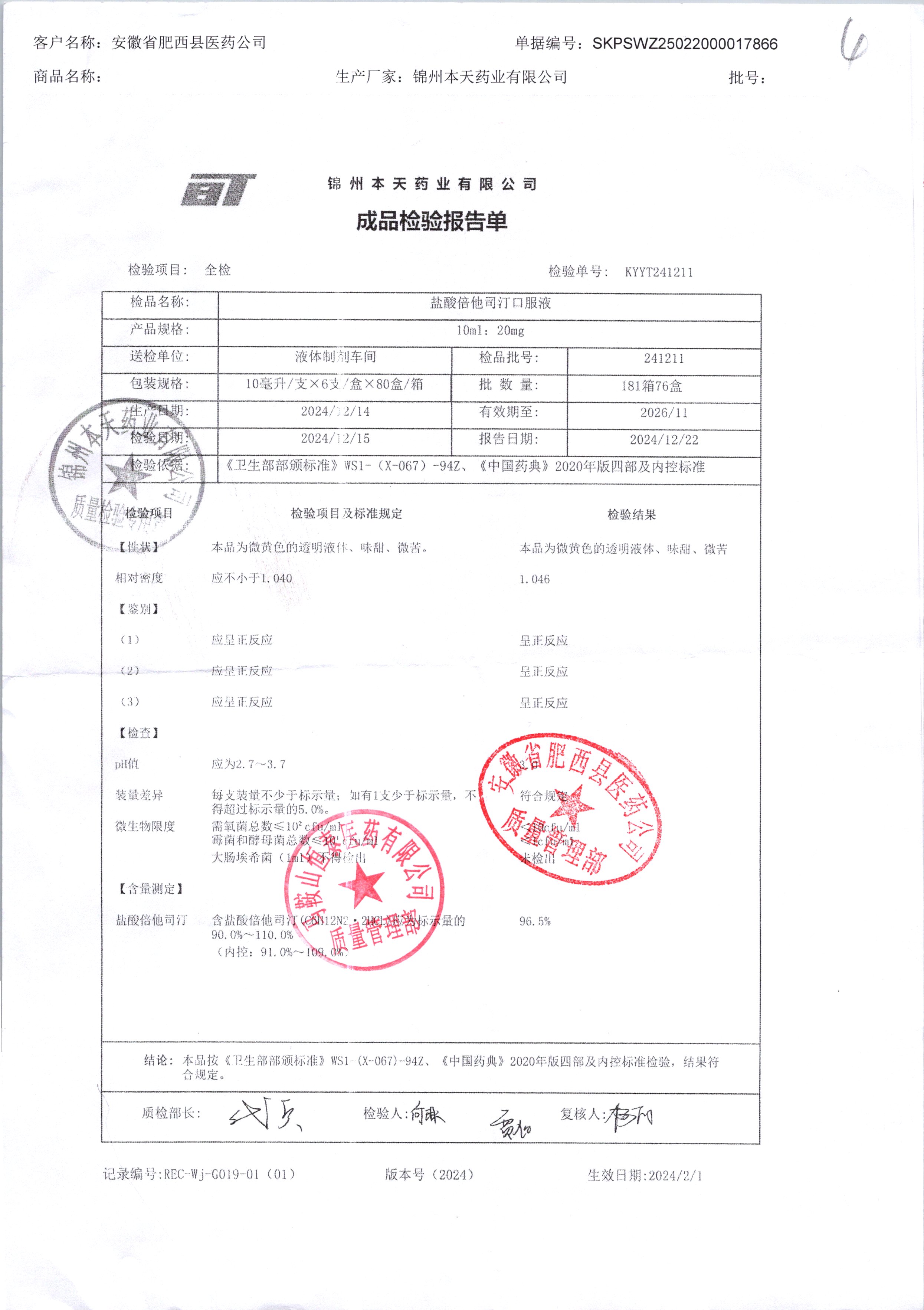 盐酸倍他司汀口服液 | 10ml:20g*6支 | 240613 | 查看详情 |