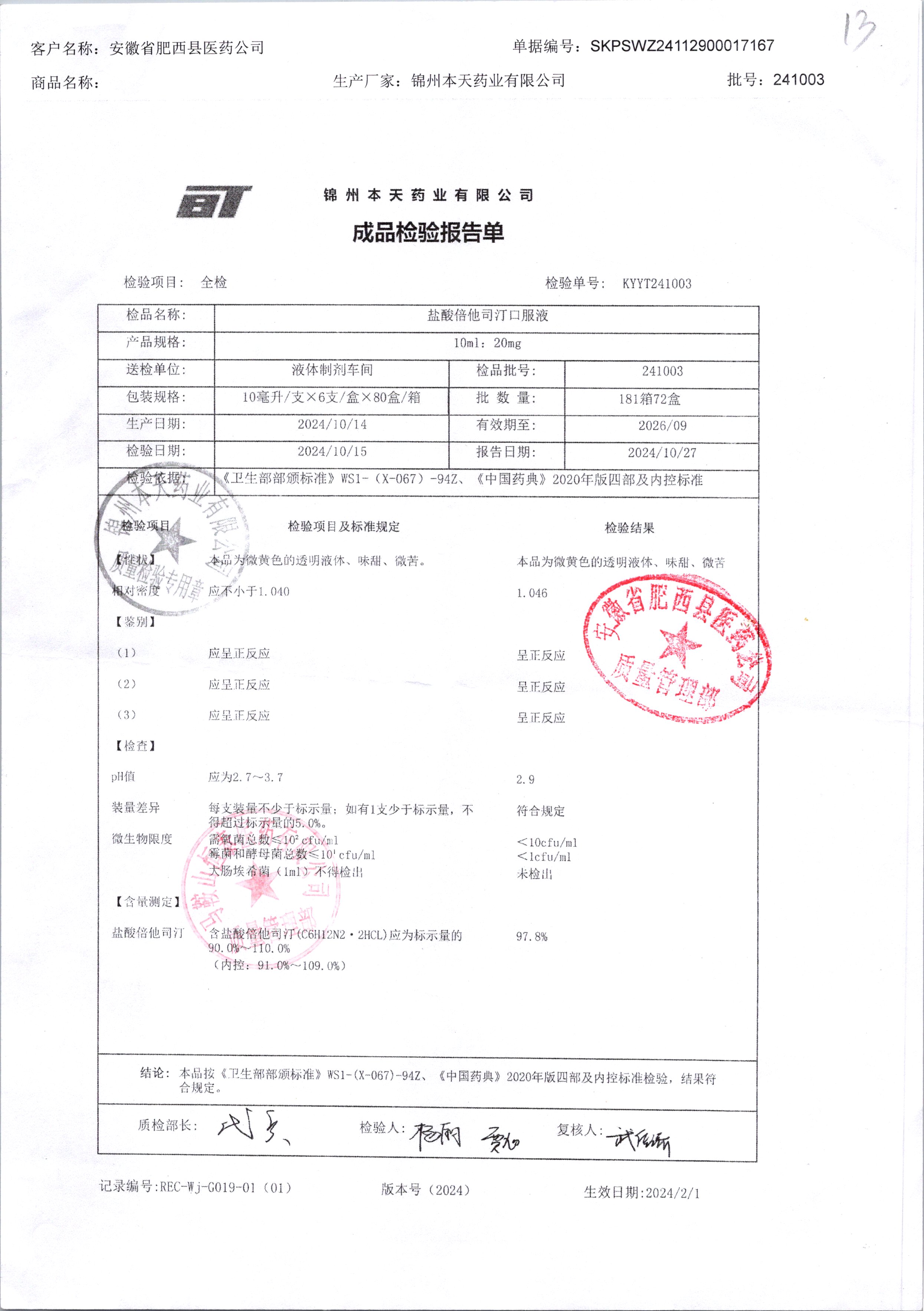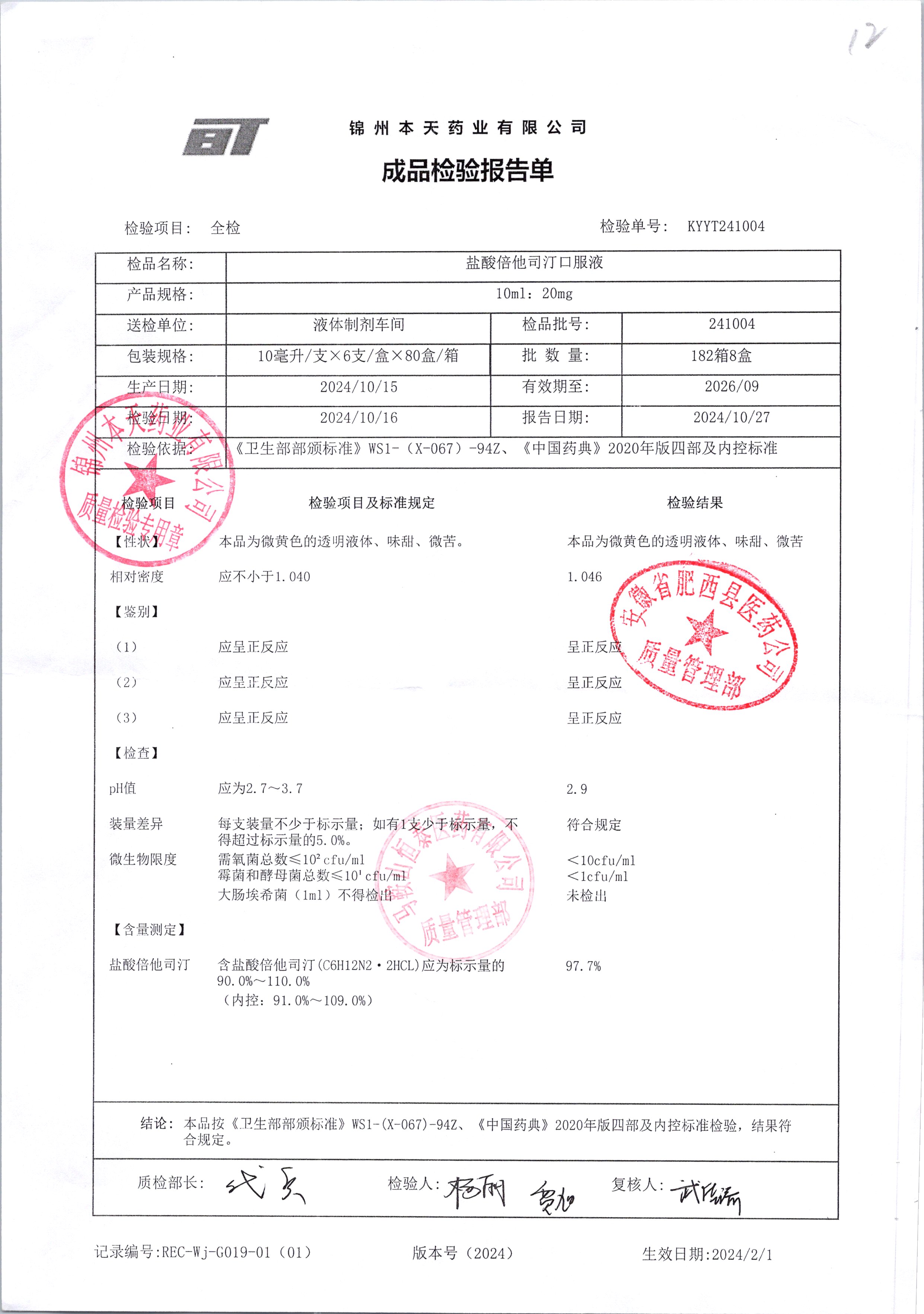 盐酸倍他司汀口服液 | 10ml:20g*6支 | 241004 | 查看详情 |