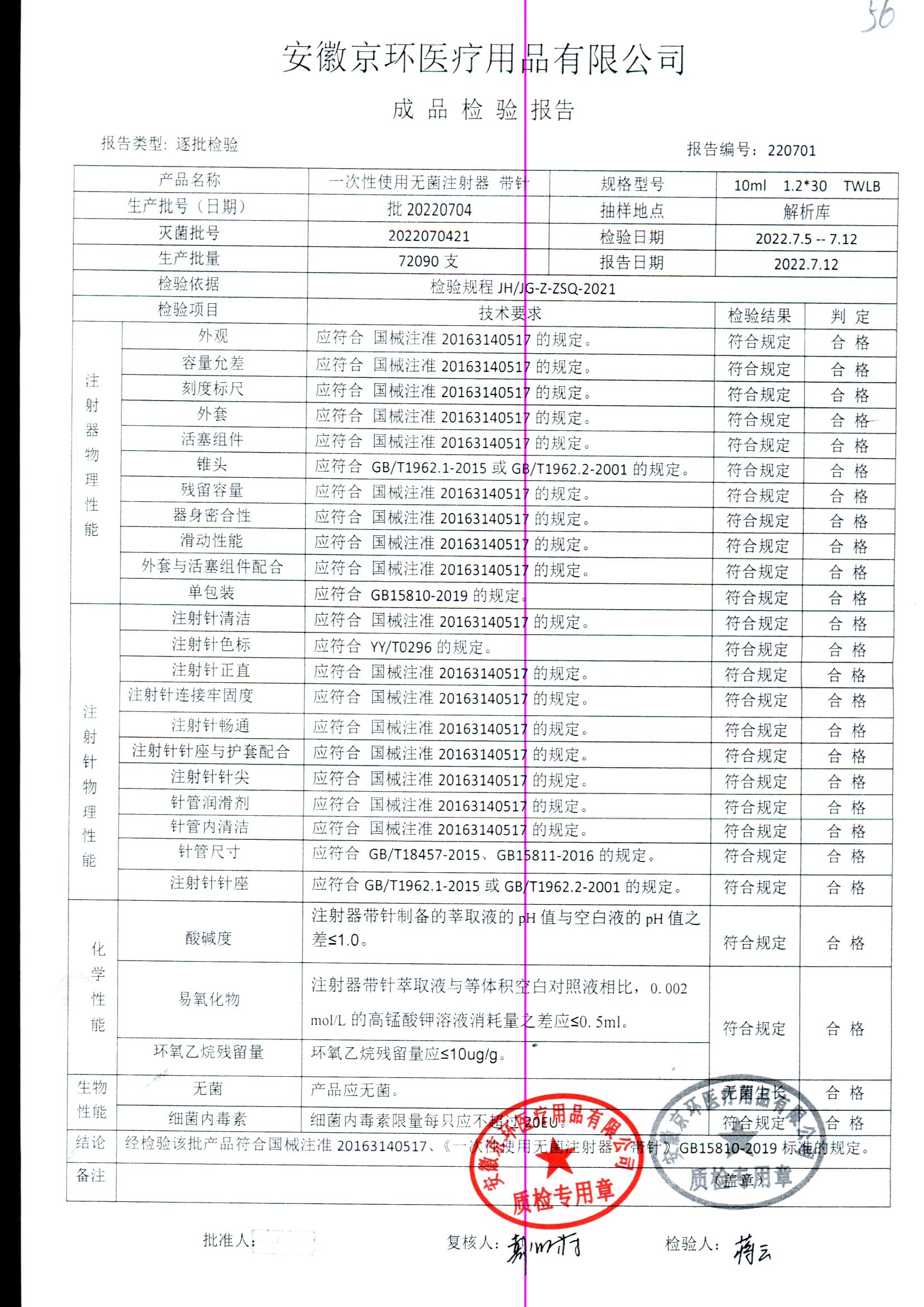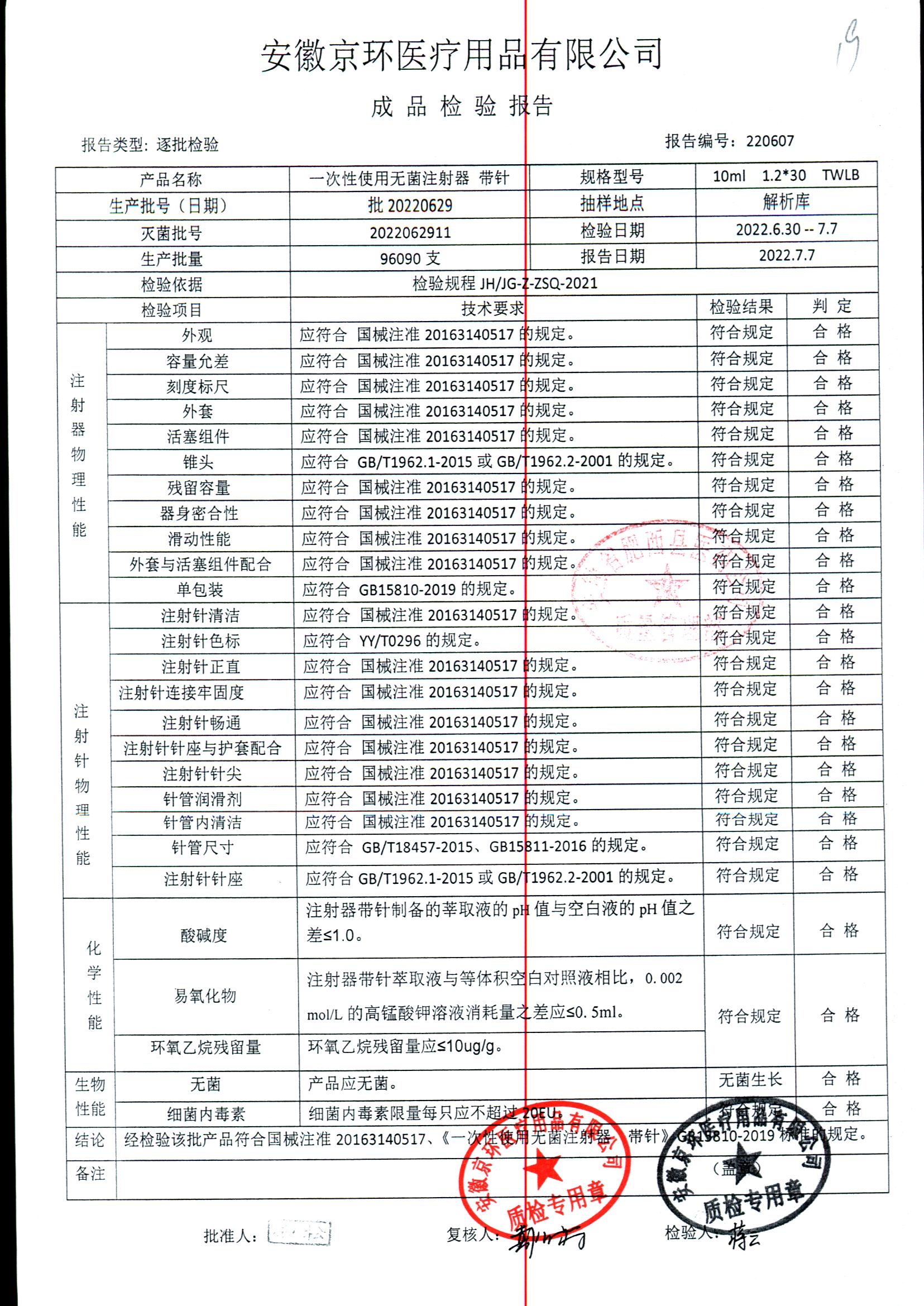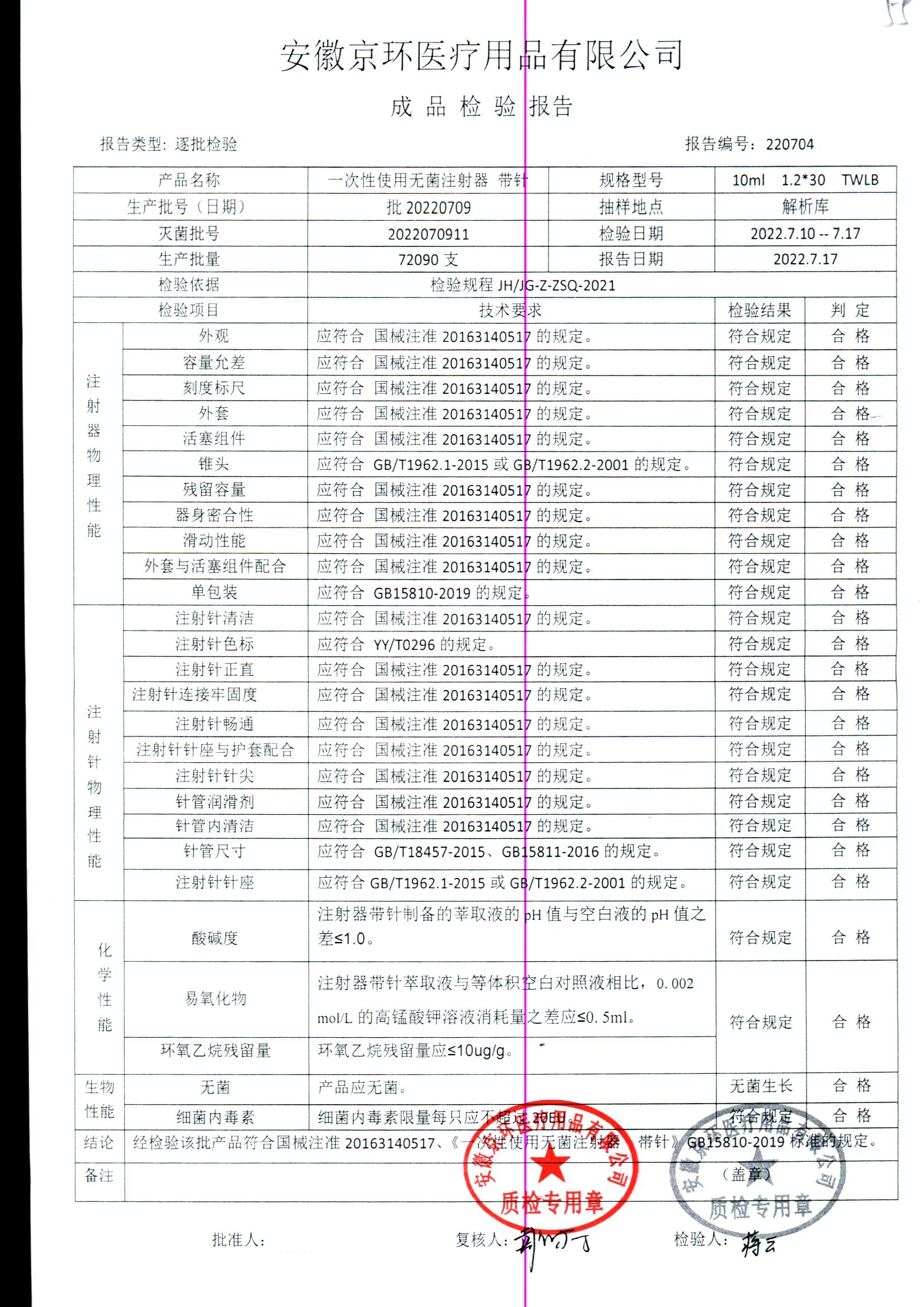 一次性使用无菌注射器带针 | 10ml*1.2*30 | 批20220709 | 查看详情 |