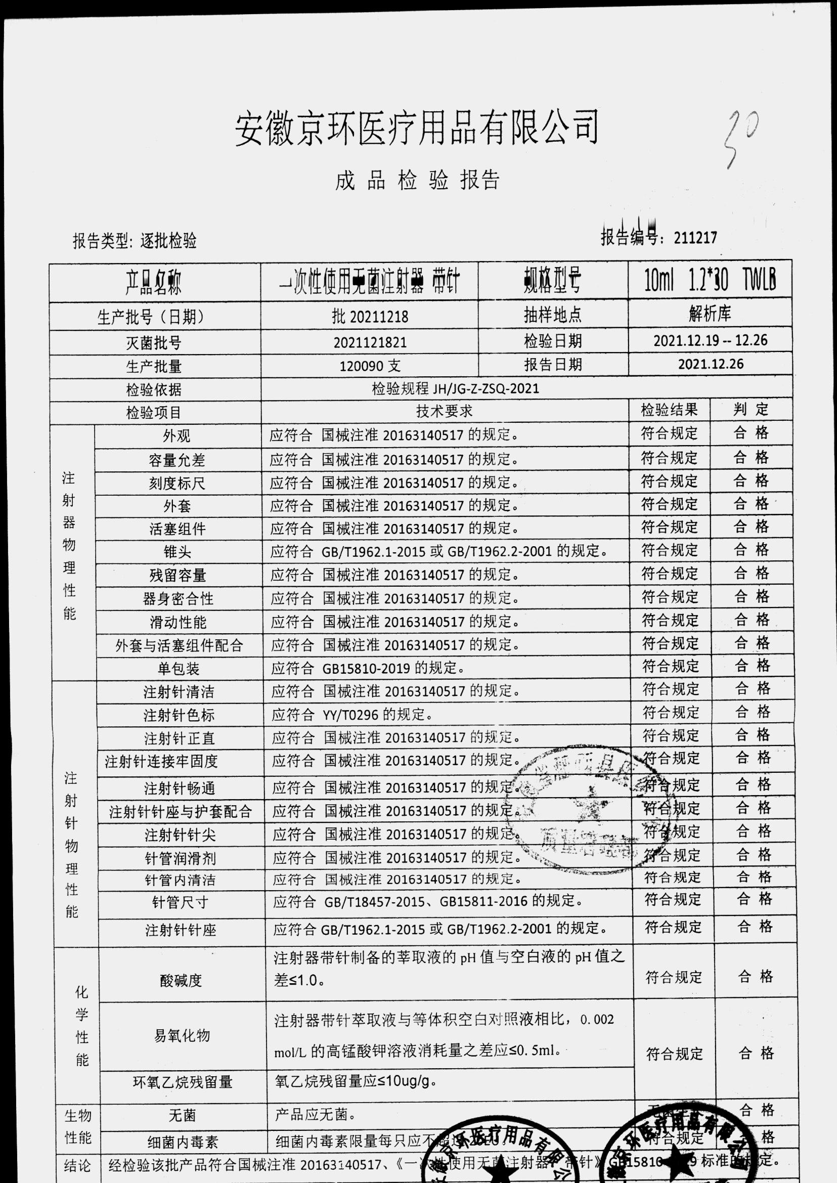 一次性使用无菌注射器带针 | 10ml*1.2*30 | 批20211218 | 查看详情 |