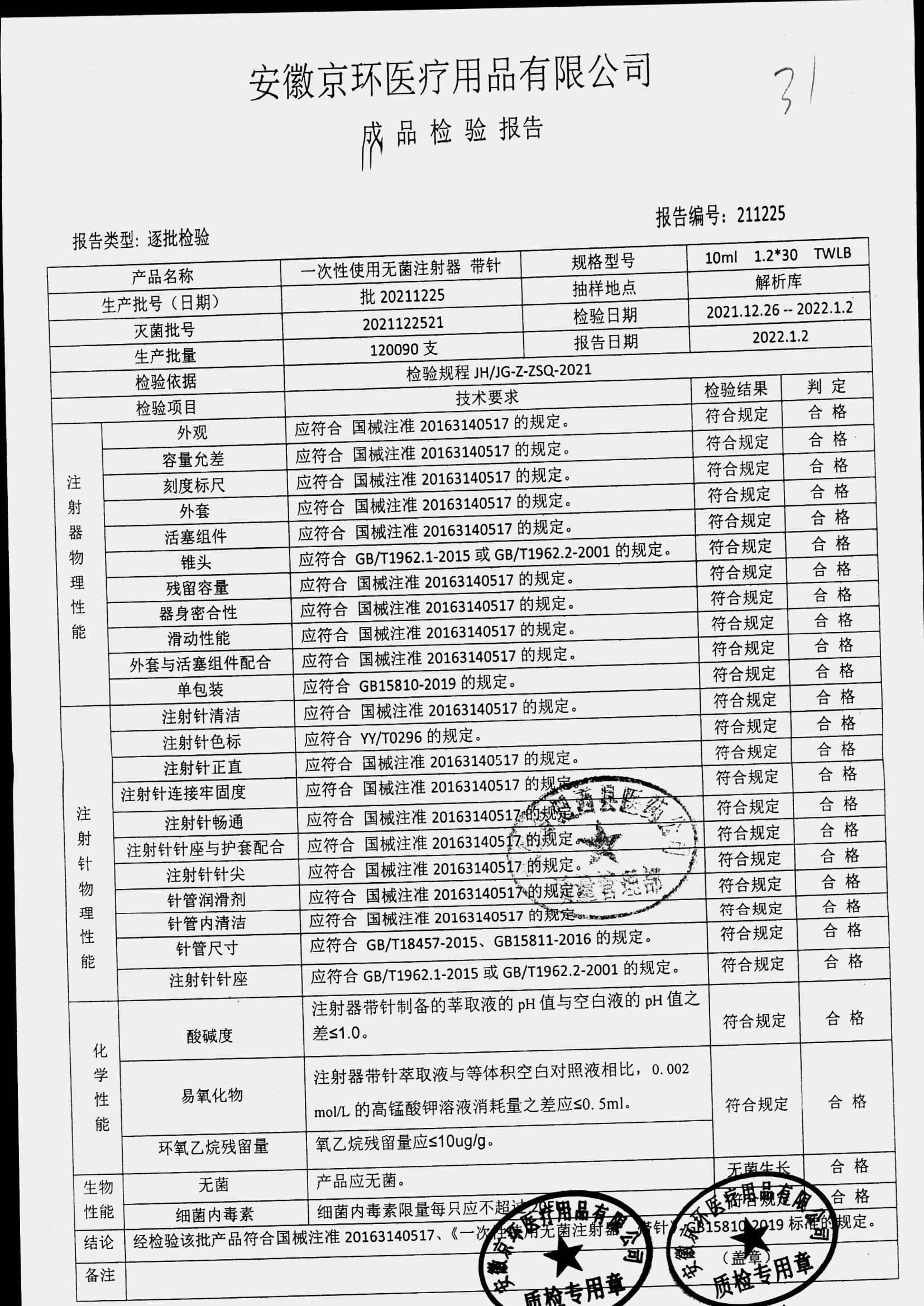 一次性使用无菌注射器带针 | 10ml*1.2*30 | 批20211225 | 查看详情 |