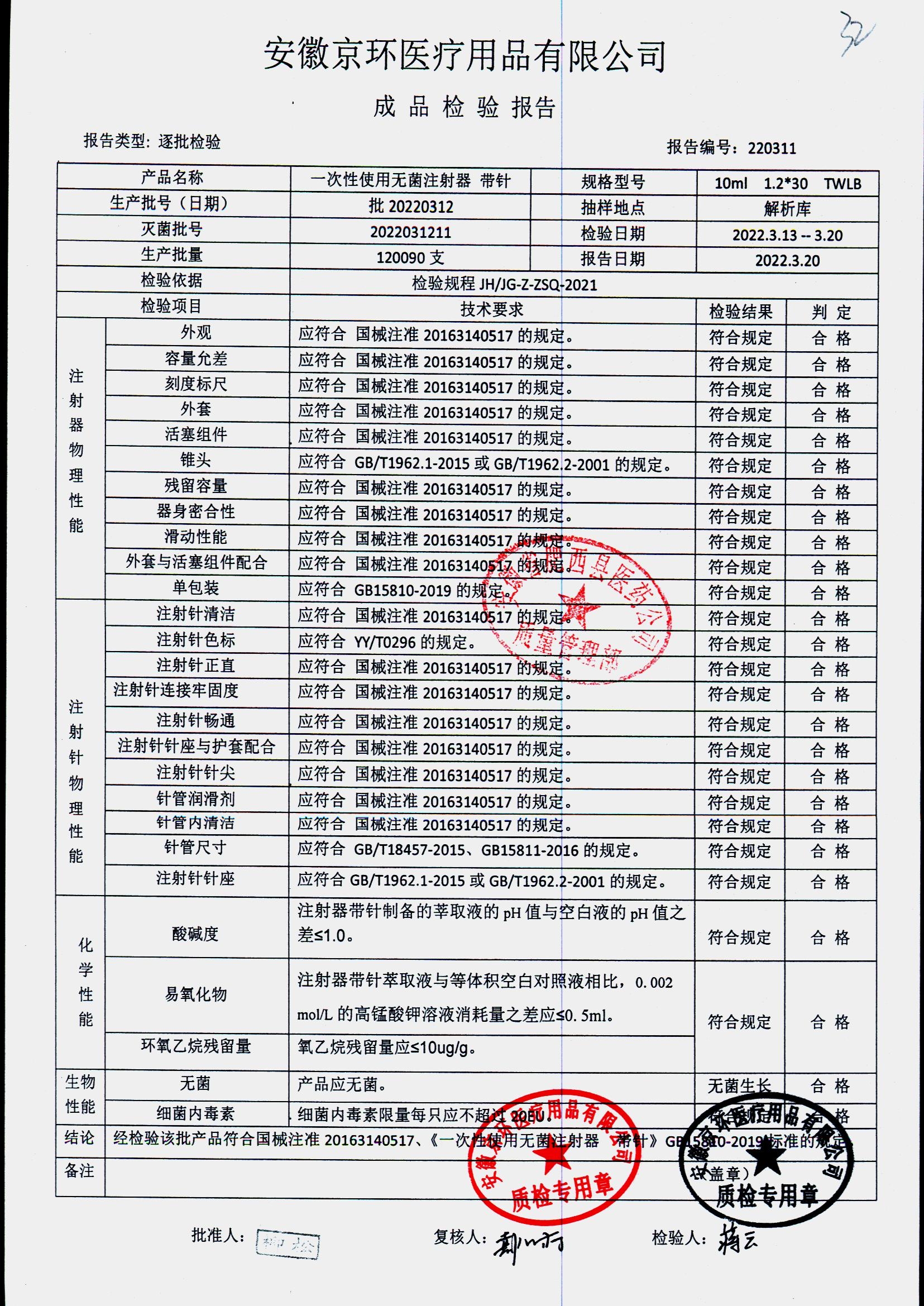 一次性使用无菌注射器带针 | 10ml*1.2*30 | 批20220312 | 查看详情 |
