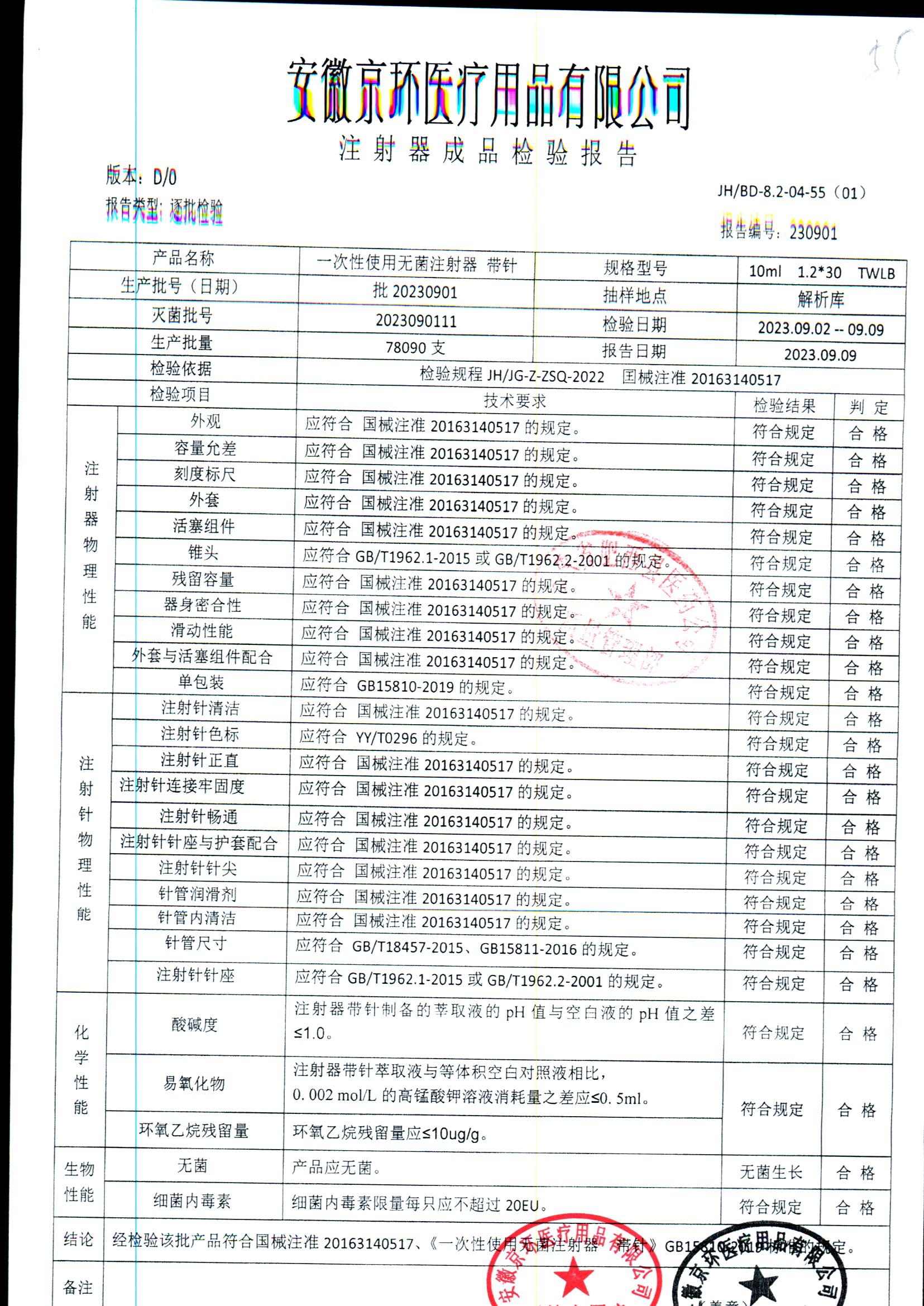 一次性使用无菌注射器带针 | 10ml*1.2*30 | 批20230901 | 查看详情 |