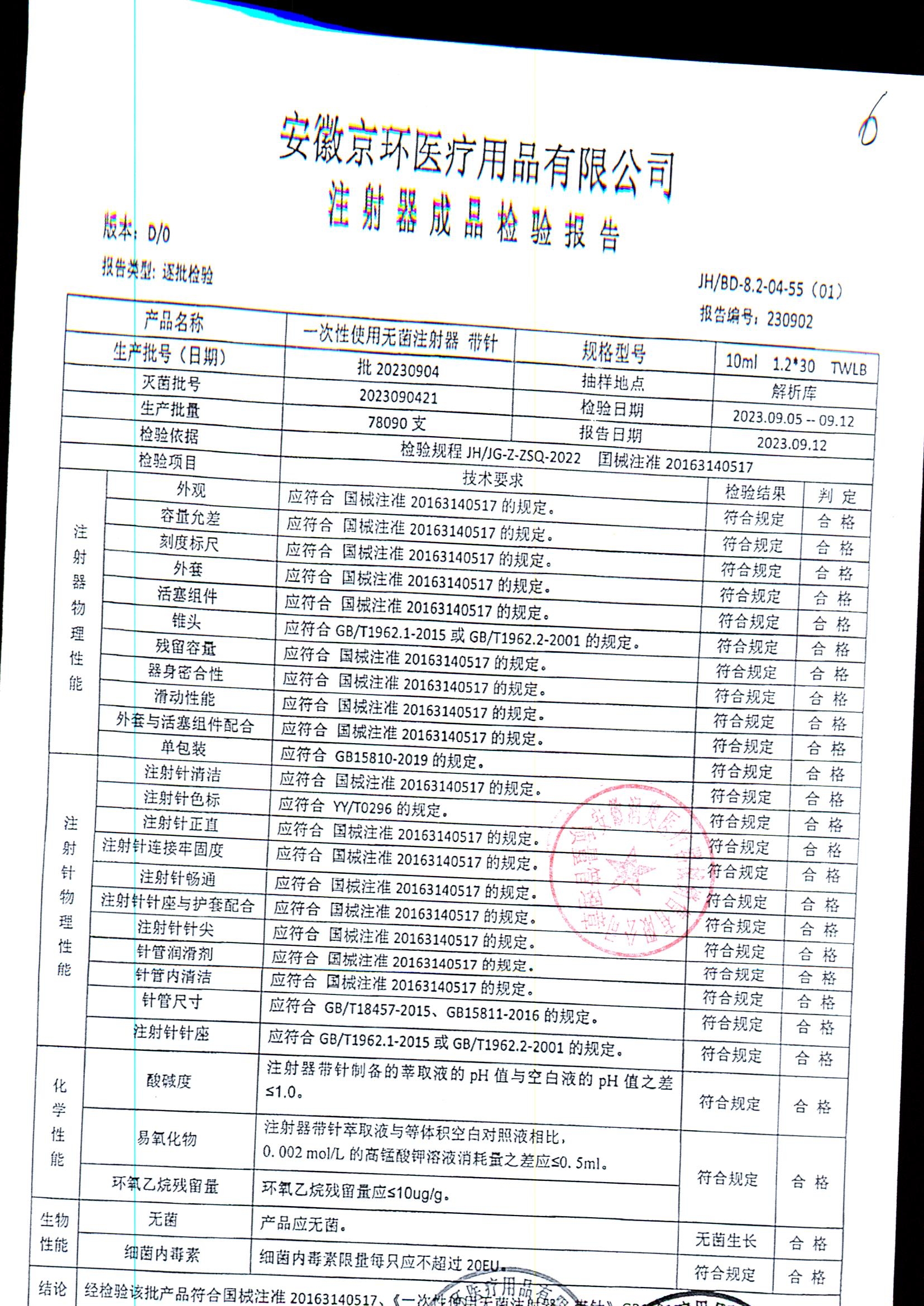 一次性使用无菌注射器带针 | 10ml*1.2*30 | 批20230904 | 查看详情 |
