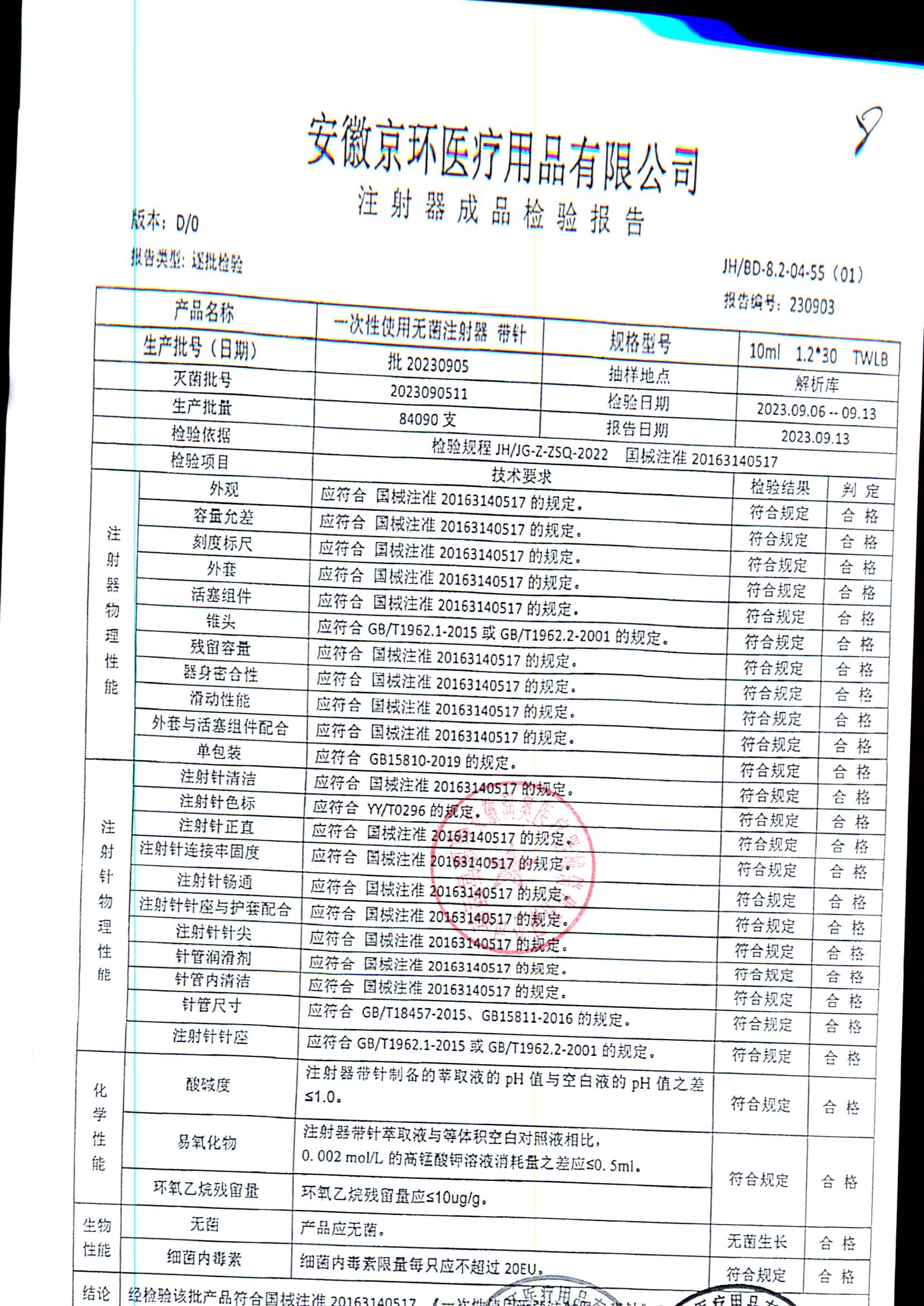 一次性使用无菌注射器带针 | 10ml*1.2*30 | 批20230905 | 查看详情 |