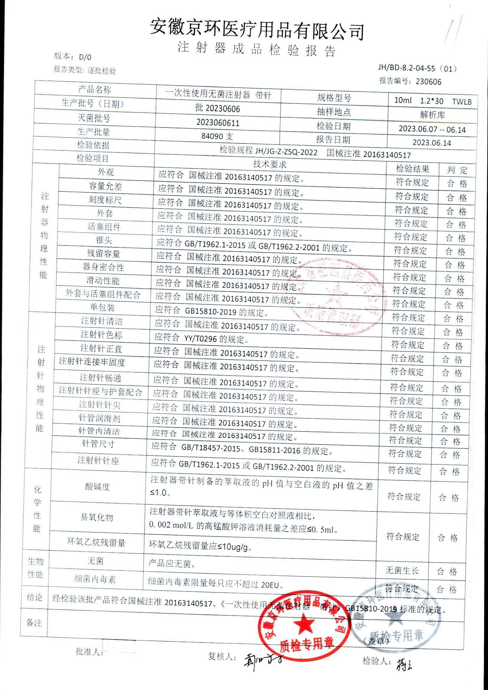 一次性使用无菌注射器带针 | 10ml*1.2*30 | 批20230606 | 查看详情 |