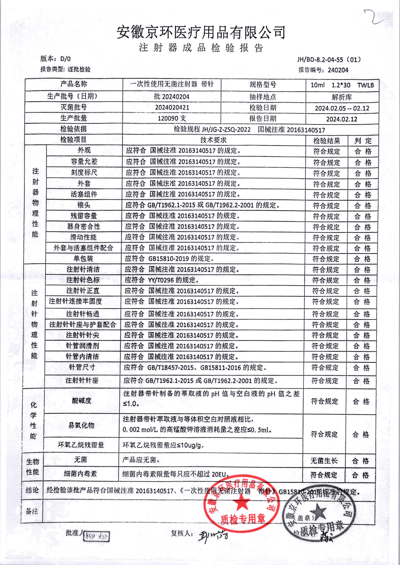 一次性使用无菌注射器带针 | 10ml*1.2*30 | 批20240204 | 查看详情 |