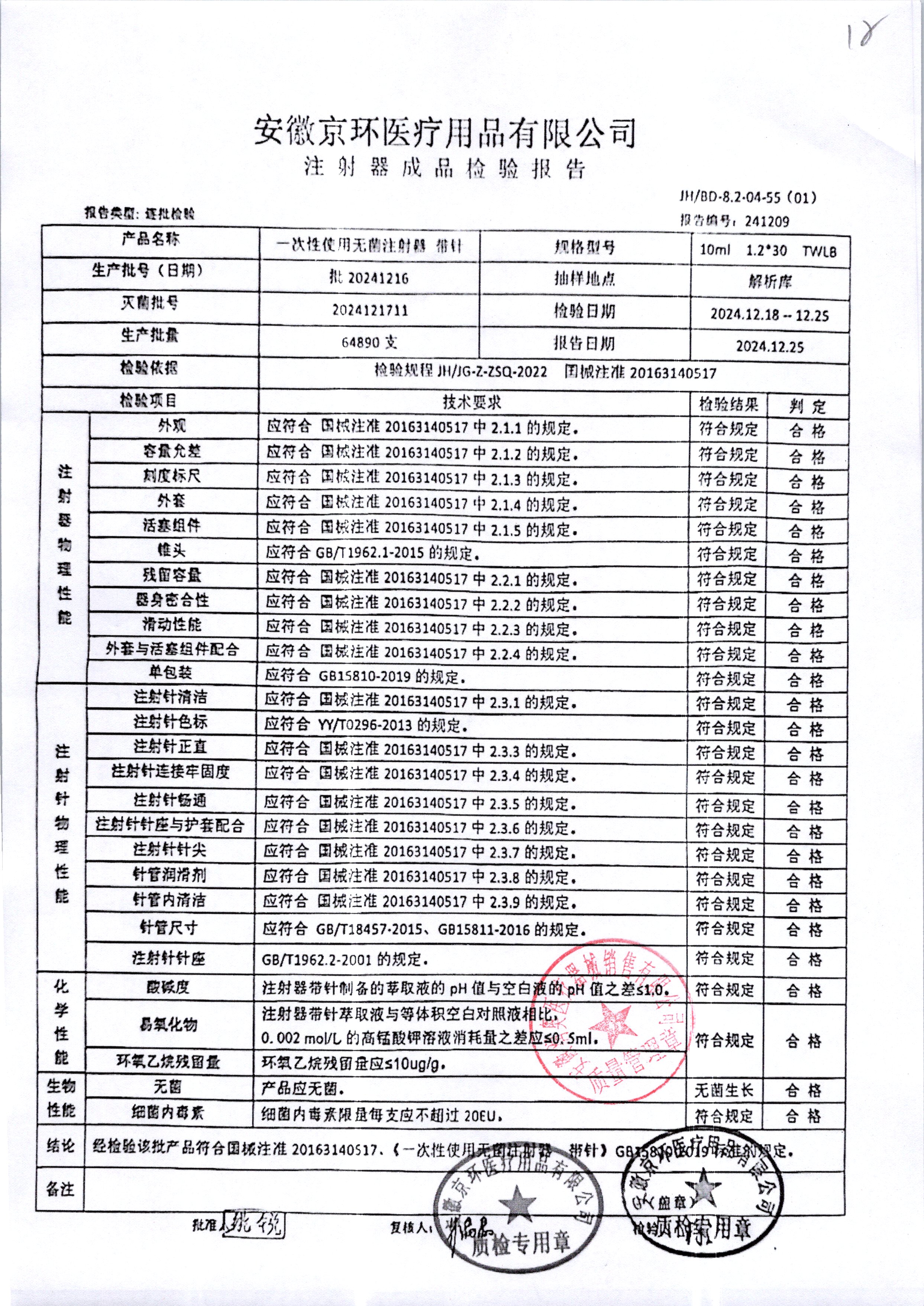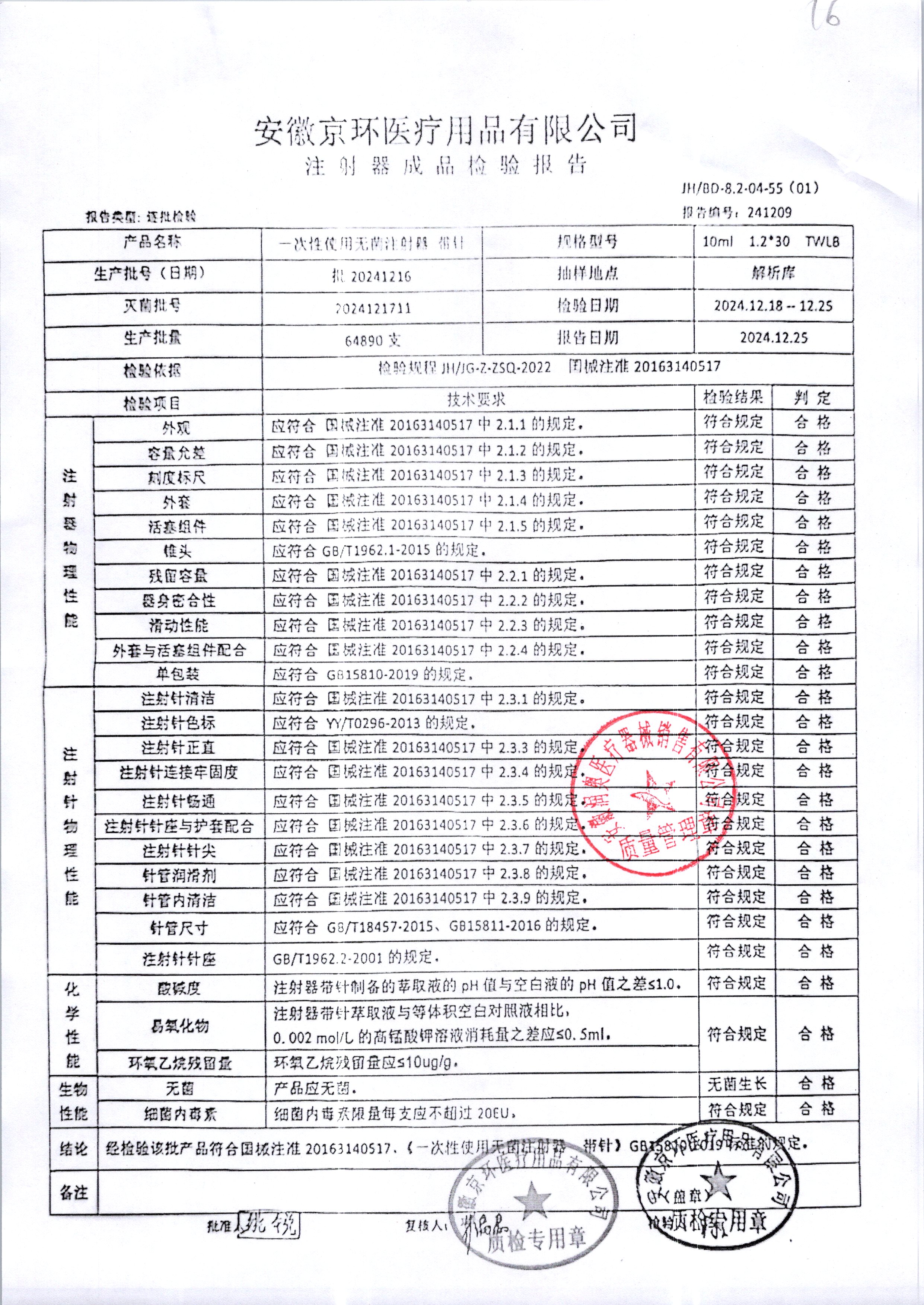 一次性使用无菌注射器带针 | 10ml*1.2*30 | 批20241216 | 查看详情 |