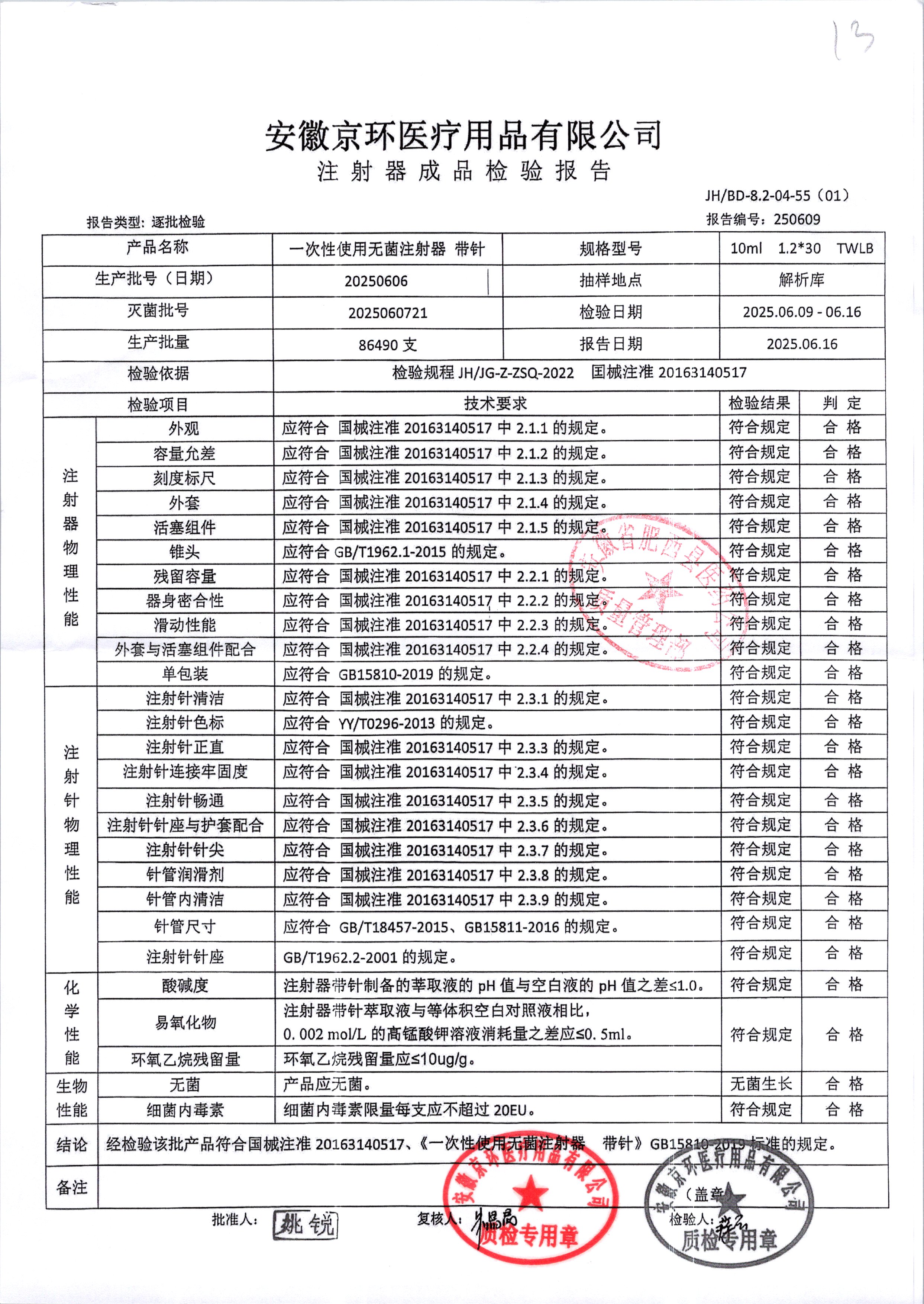 一次性使用无菌注射器带针 | 10ml*1.2*30 | 20250606 | 查看详情 |