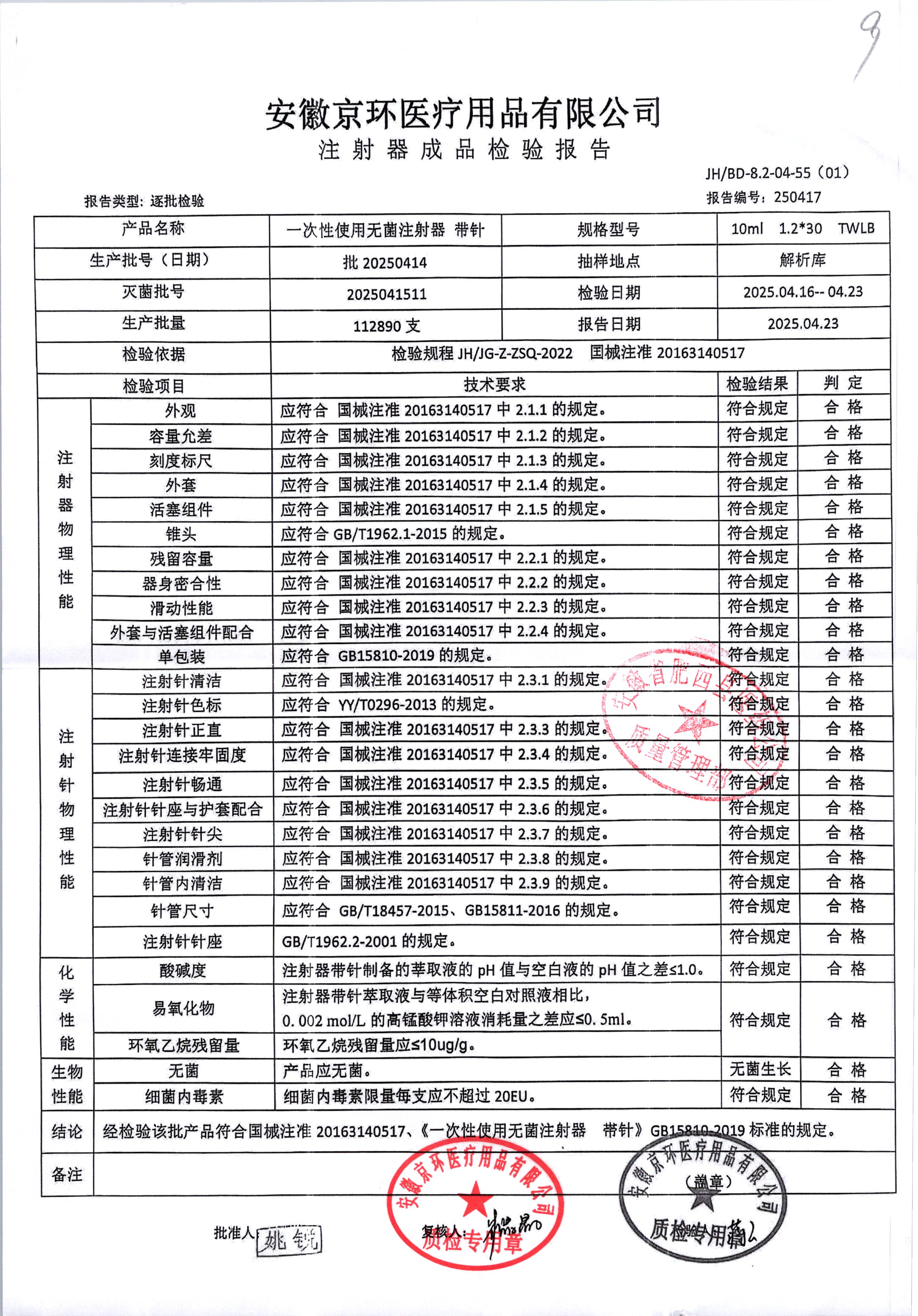 一次性使用无菌注射器带针 | 10ml*1.2*30 | 批20250414 | 查看详情 |