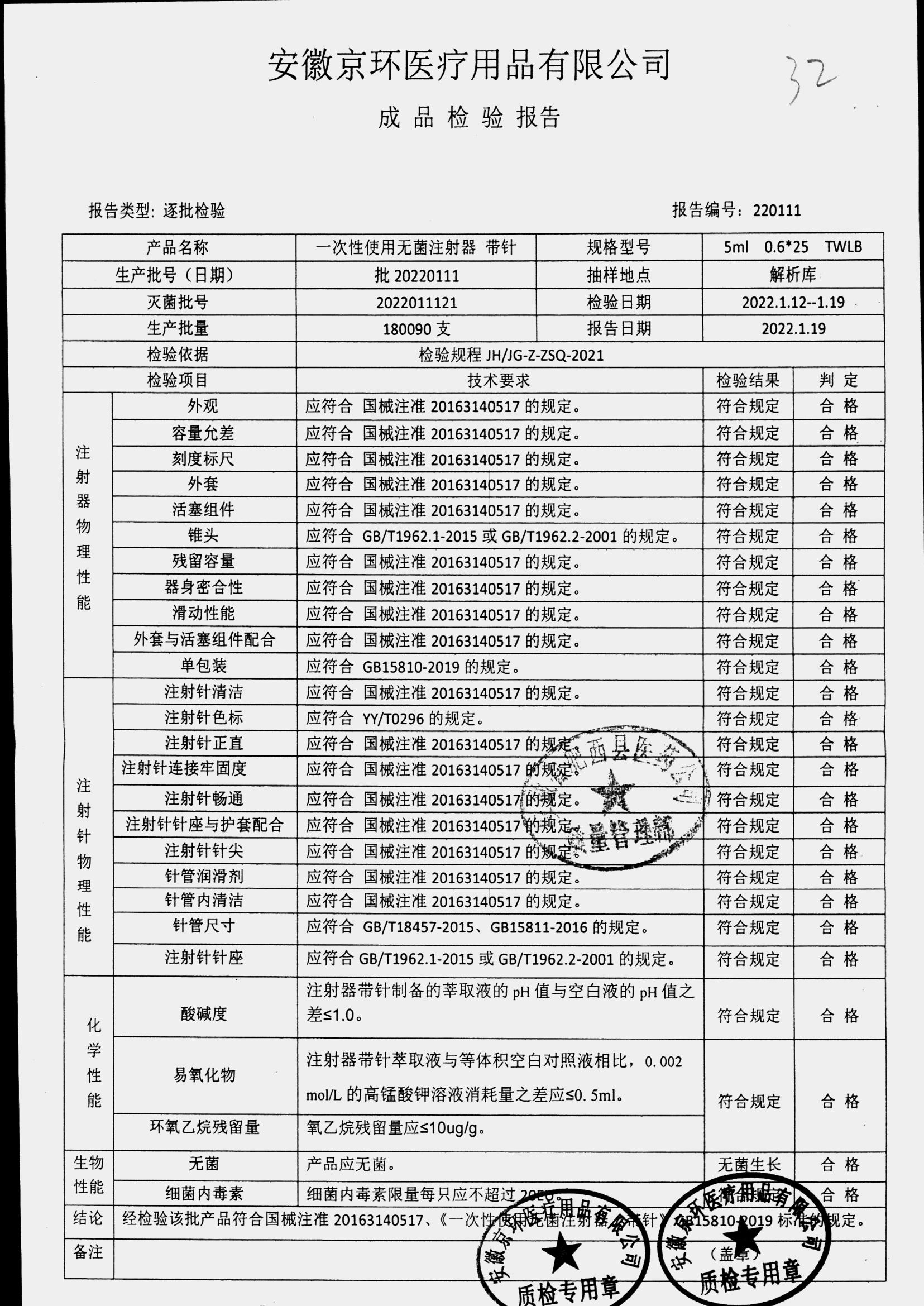 一次性使用无菌注射器带针 | 5ml*0.6*25 | 批20220111 | 查看详情 |