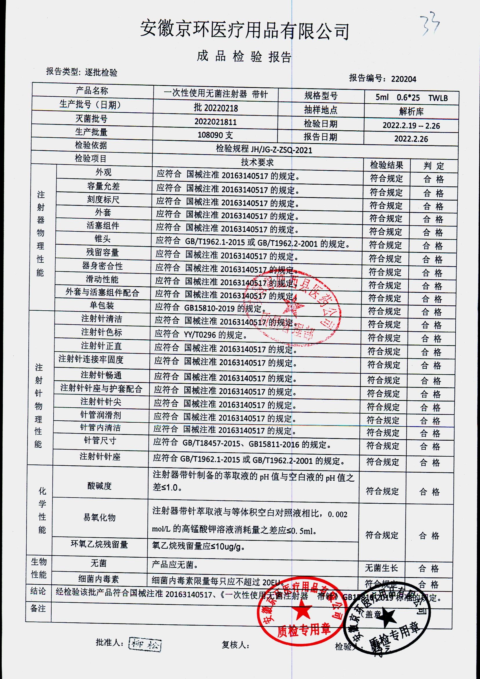 一次性使用无菌注射器带针 | 5ml*0.6*25 | 批20220218 | 查看详情 |