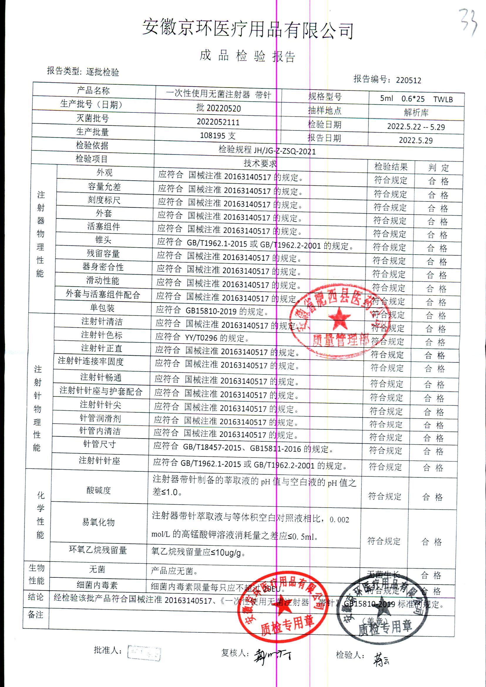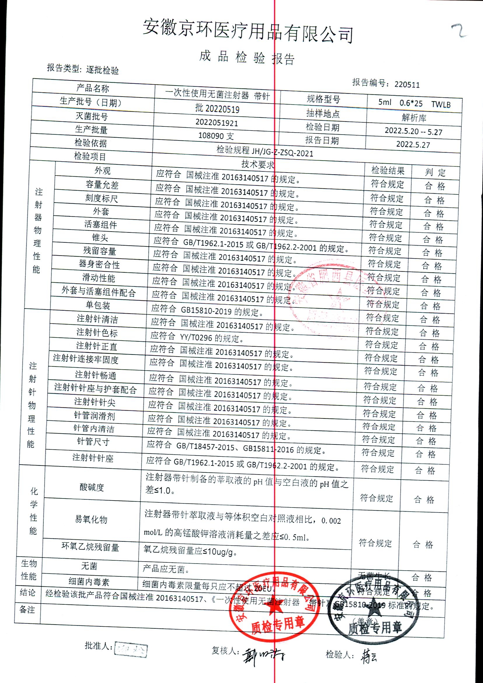 一次性使用无菌注射器带针 | 5ml*0.6*25 | 批20220520 | 查看详情 |