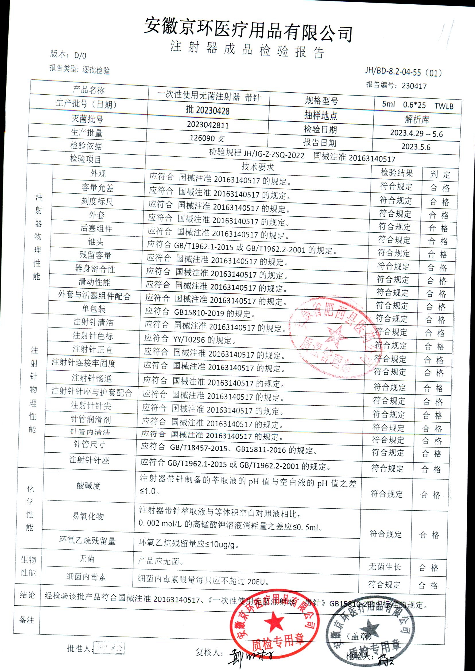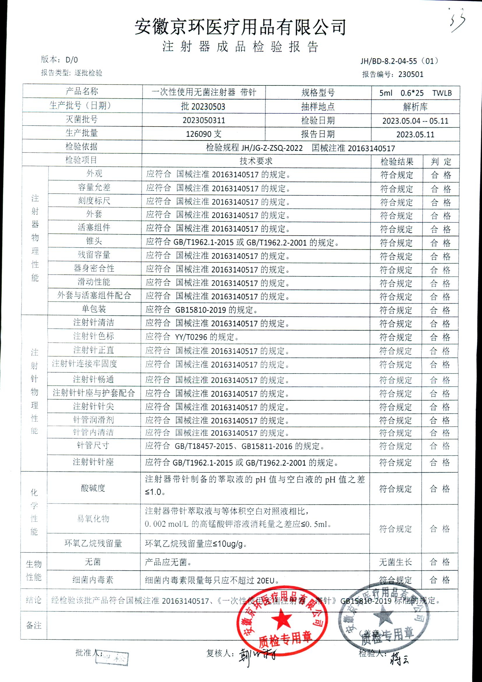 一次性使用无菌注射器带针 | 5ml*0.6*25 | 批20230428 | 查看详情 |