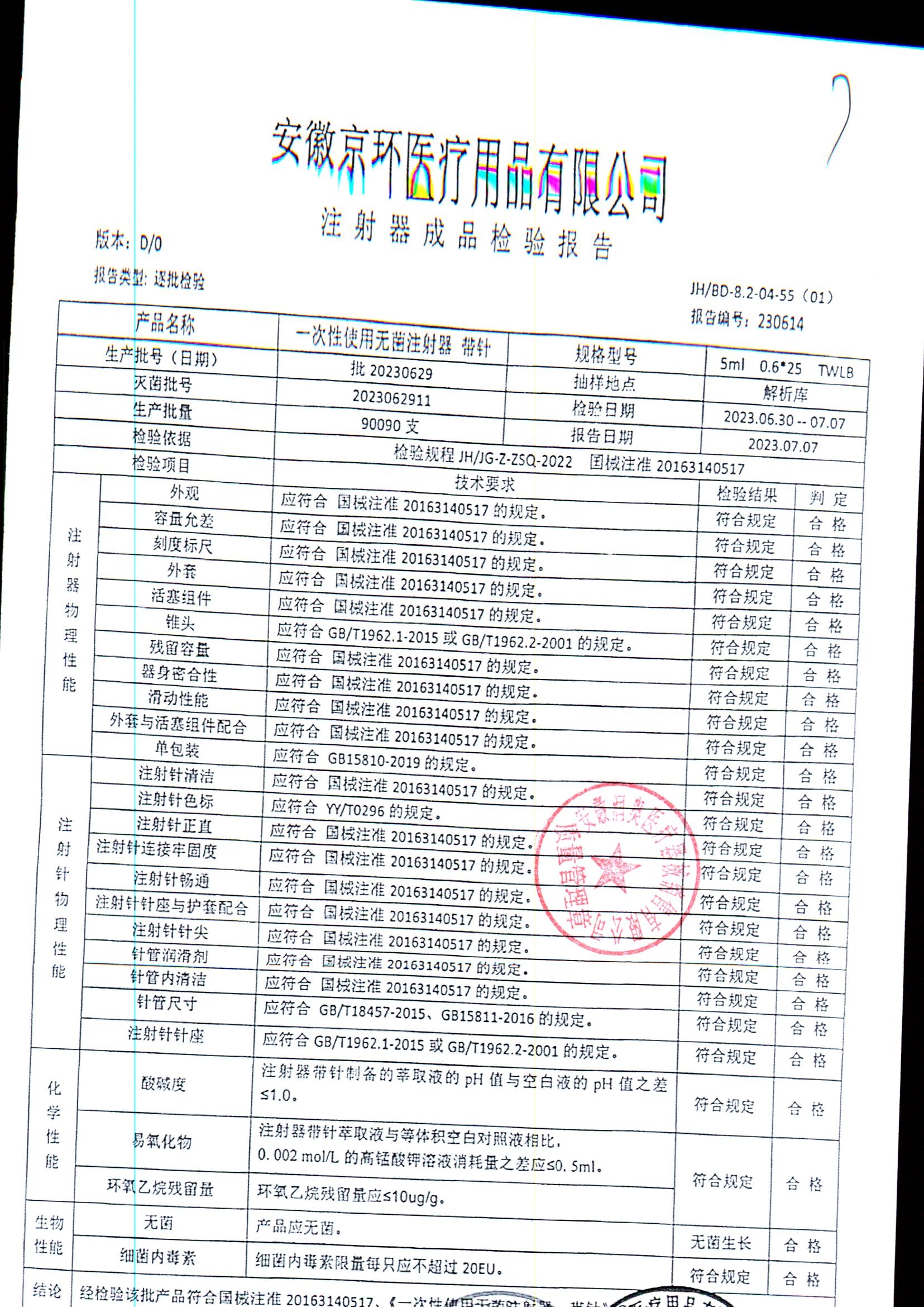 一次性使用无菌注射器带针 | 5ml*0.6*25 | 批20230629 | 查看详情 |