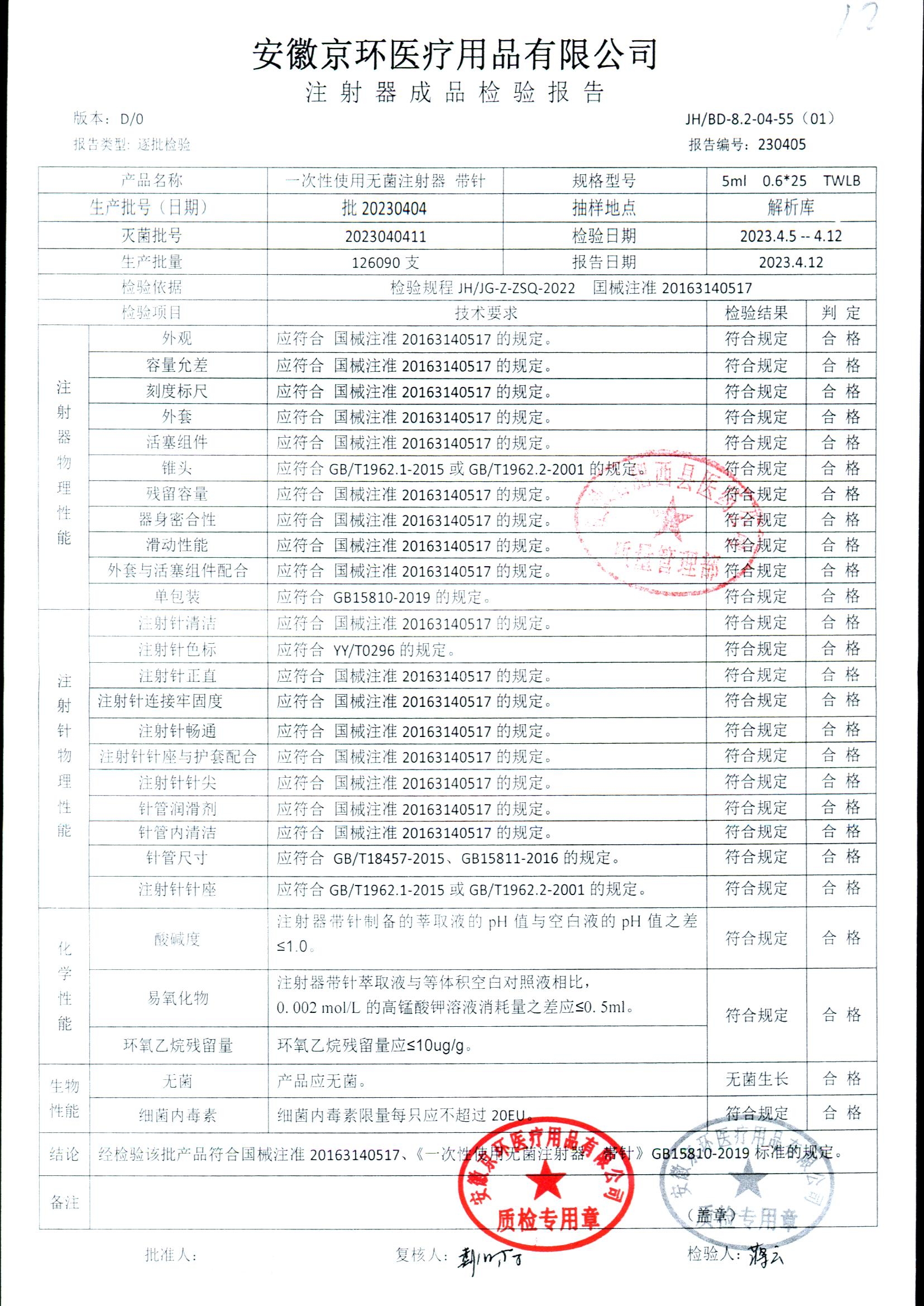 一次性使用无菌注射器带针 | 5ml*0.6*25 | 批20230404 | 查看详情 |